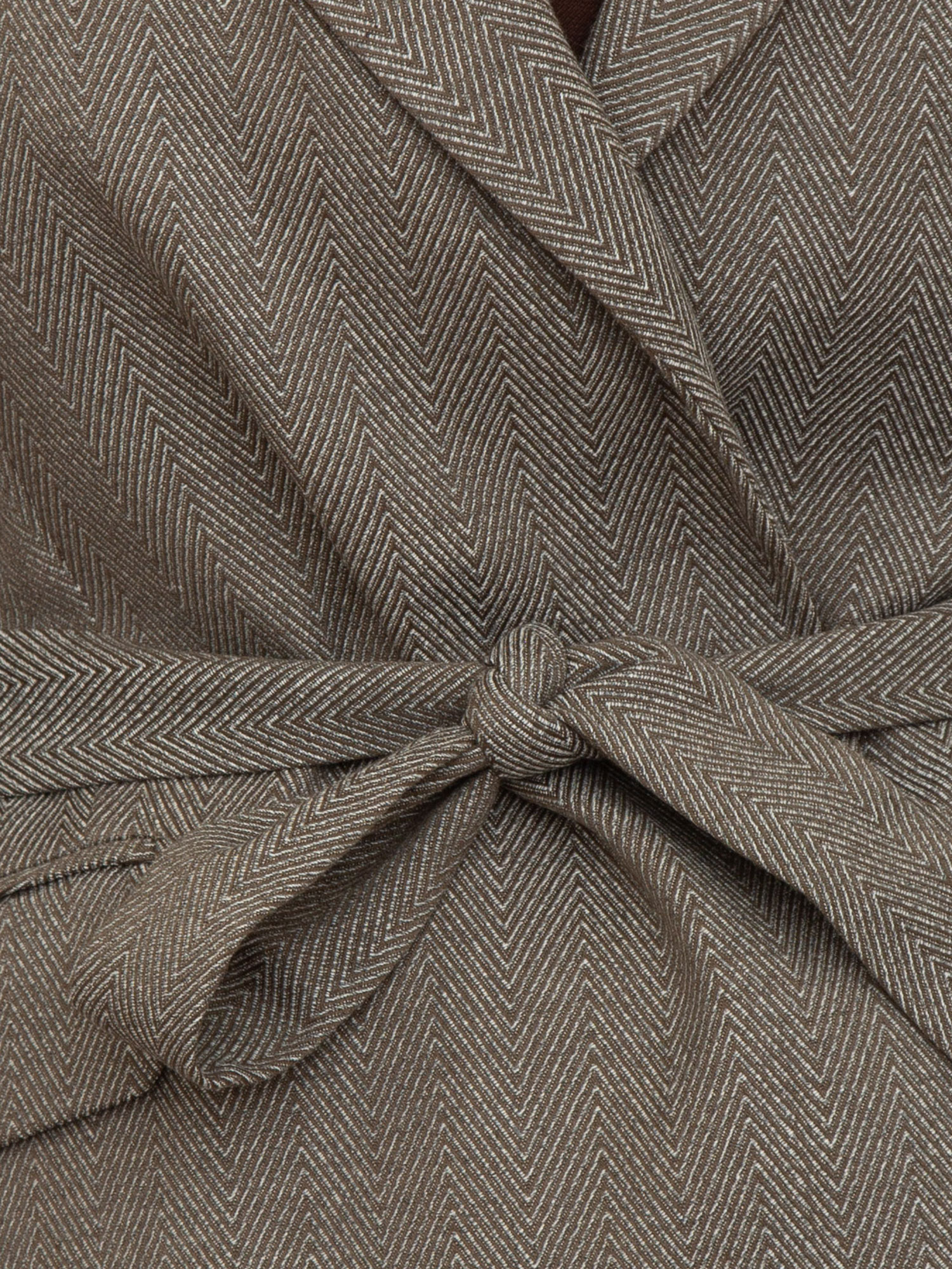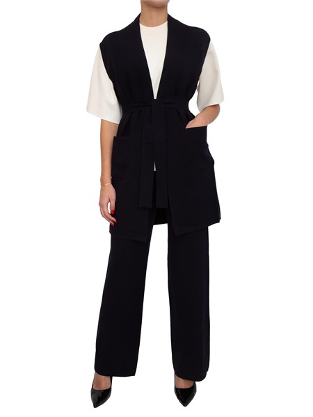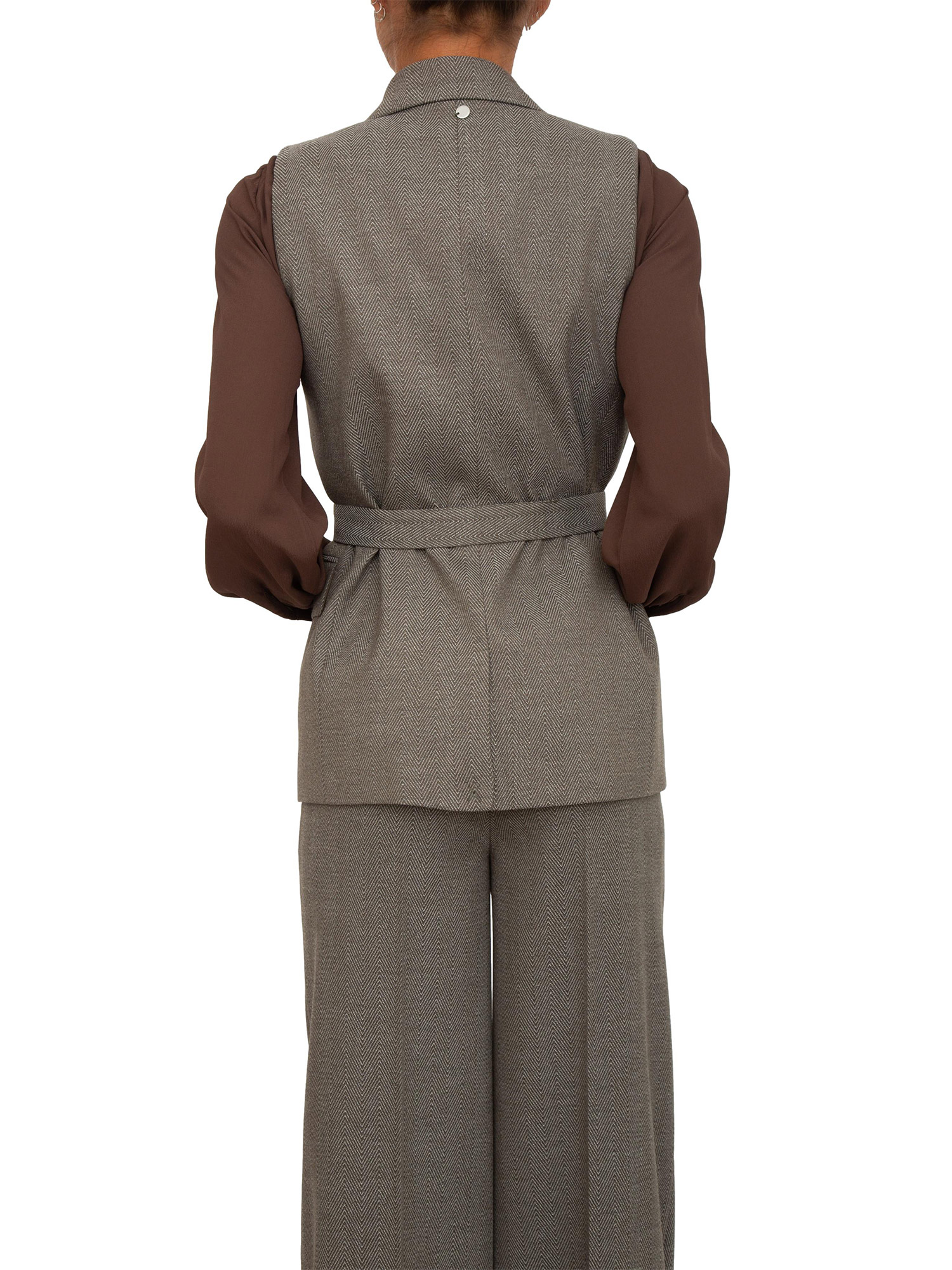 Gilet Liu Jo donna in misto viscosa stretch con motivo chevron e spilla removibile con strass pendenti. Revers a lancia, tasche con patta e cintura sur ton in abbinamento. La modella è alta 1.72 e indossa la taglia 40.