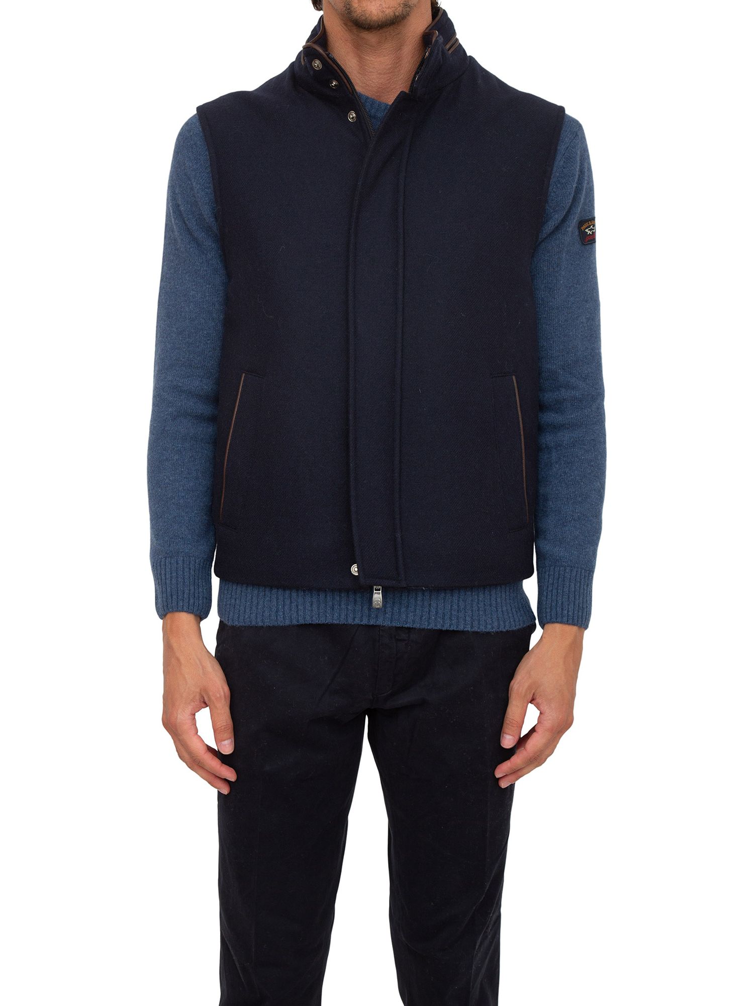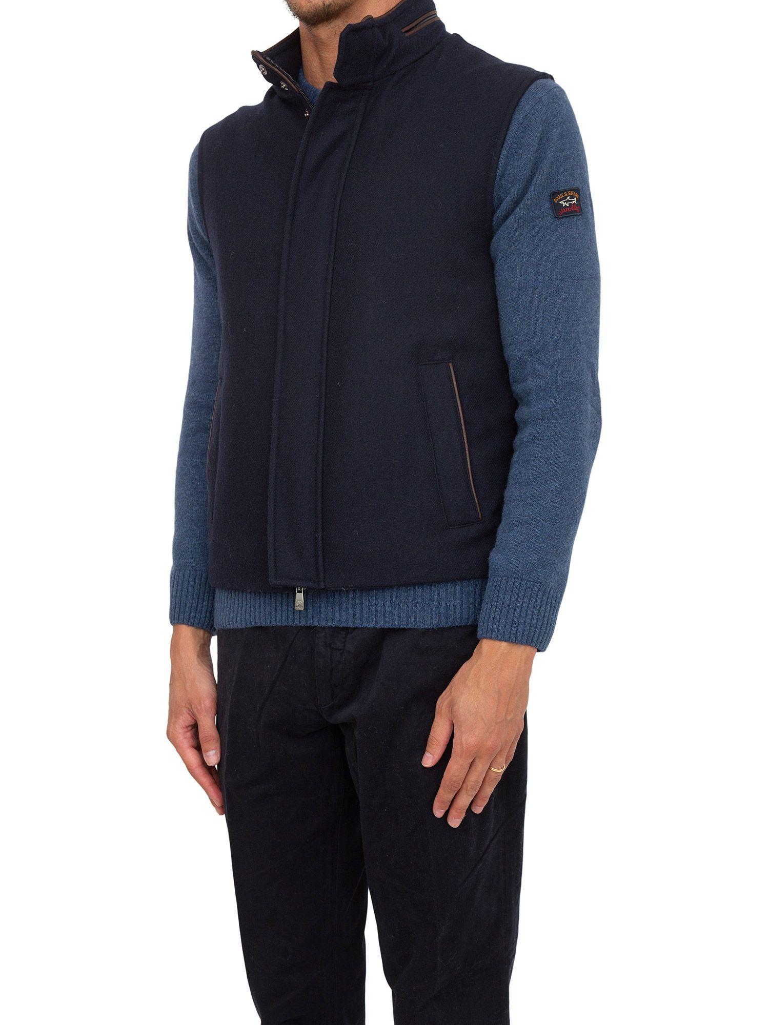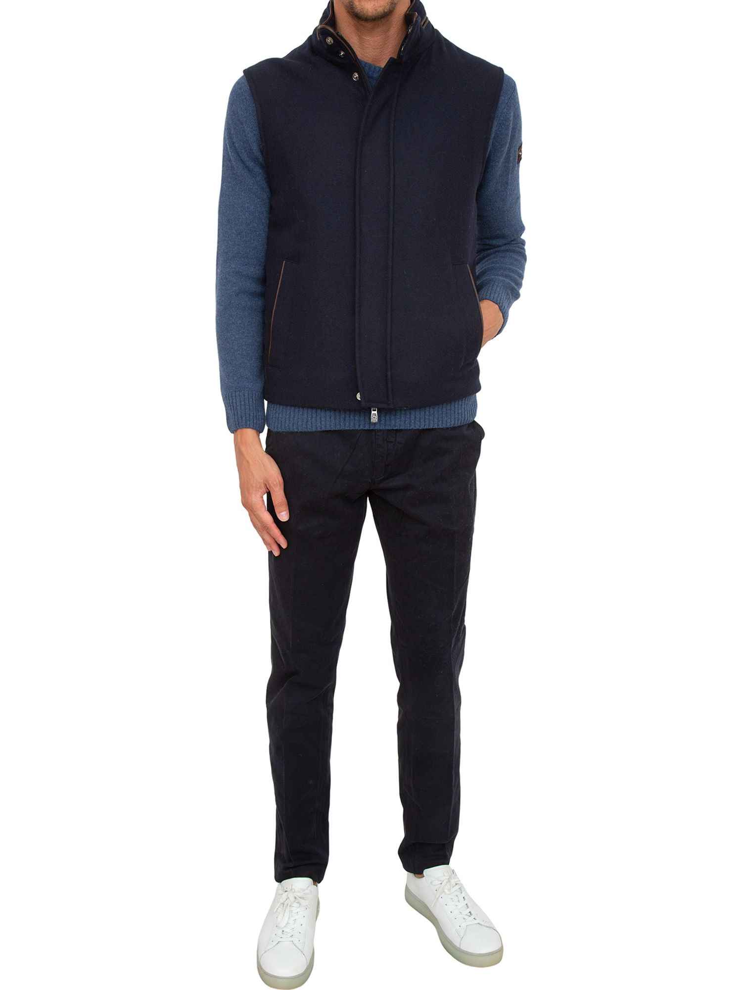 Gilet Corneliani in twill di lana tecnico, vestibilità classica drop 7, chiusura frontale con zip e bottoni nascosti, collo con cappuccio nascosto, coulisse e regolatori, due tasche laterali con bottoni e profili in pelle su collo e tasche.