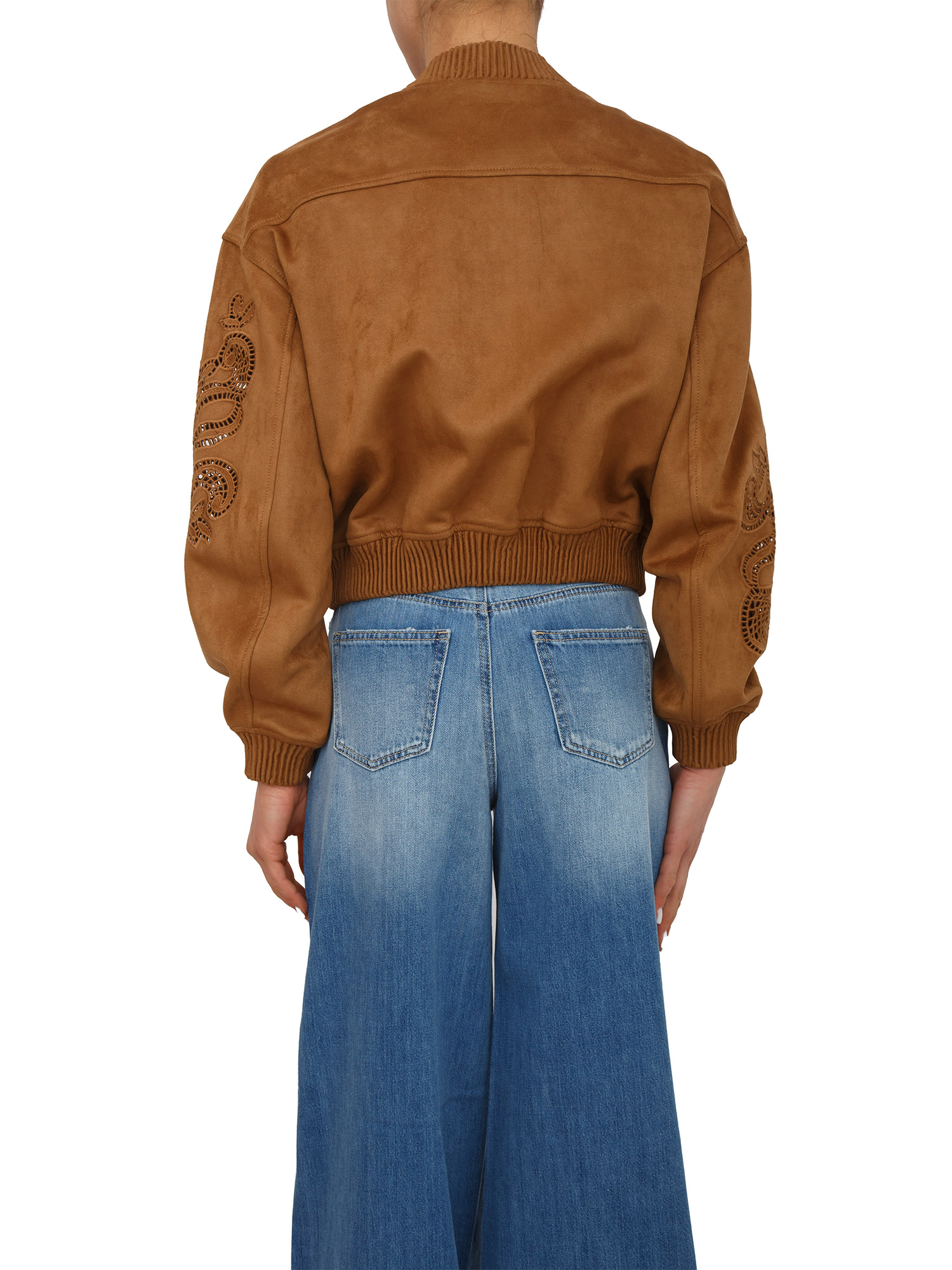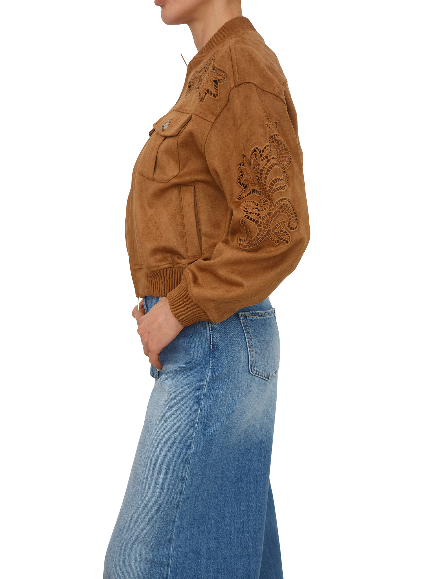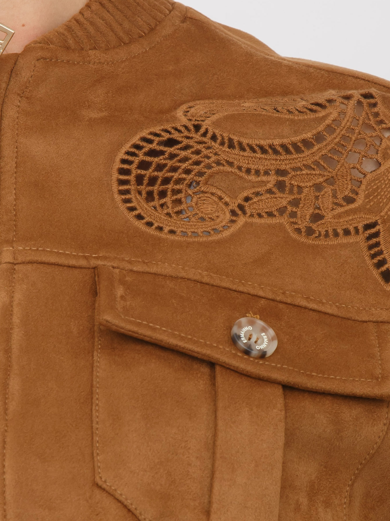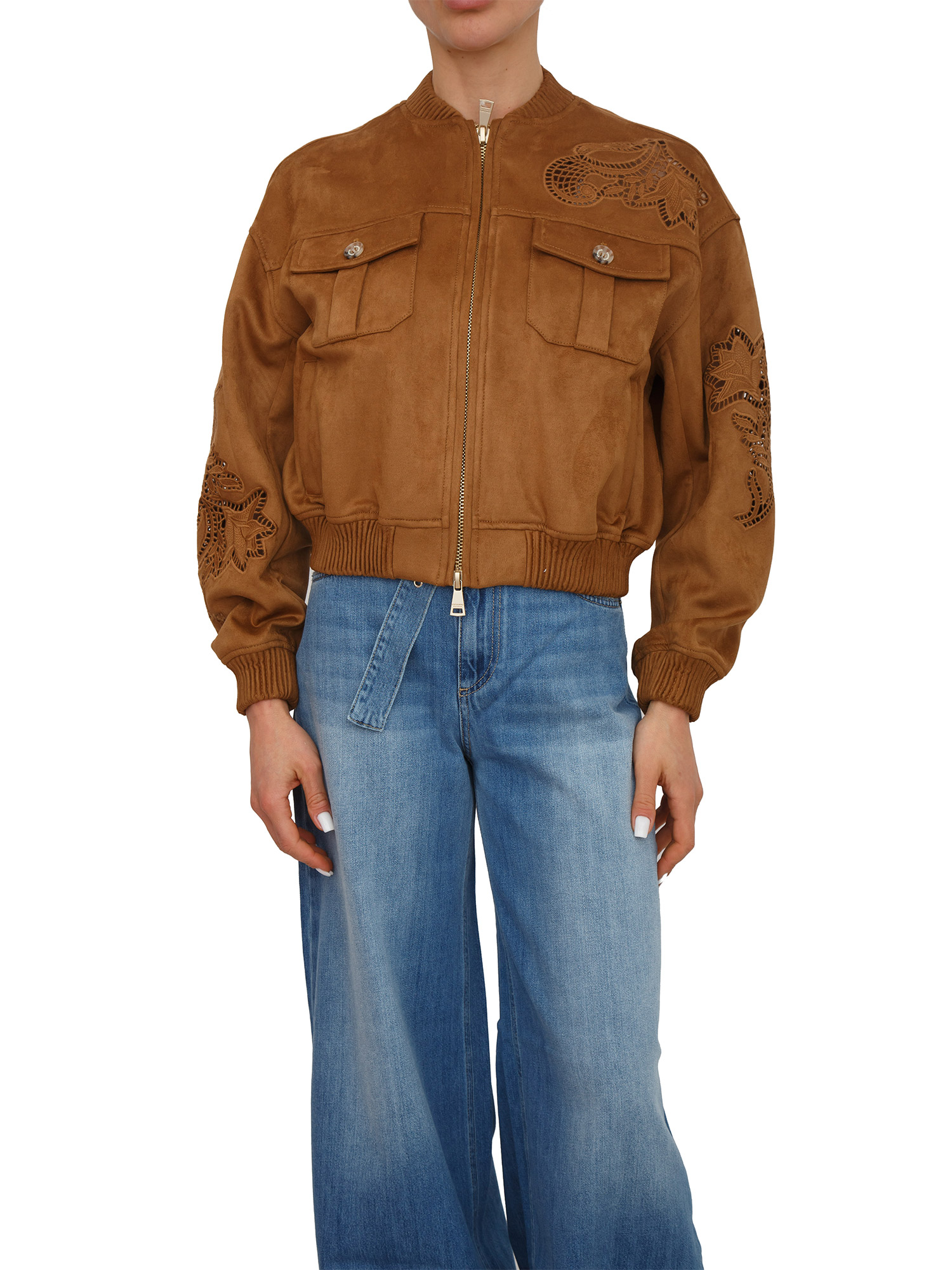 Giubbino bomber Ermanno Firenze realizzato in camoscio ecologico dal design inconfondibile. I ricami impreziosiscono e donano una femminilità unica a questo capo mentre le tasche applicate davanti lo rendono moderno e all'avanguardia. Zip dorata doppio cursore e fondi lavorati a coulisse elasticizzata.