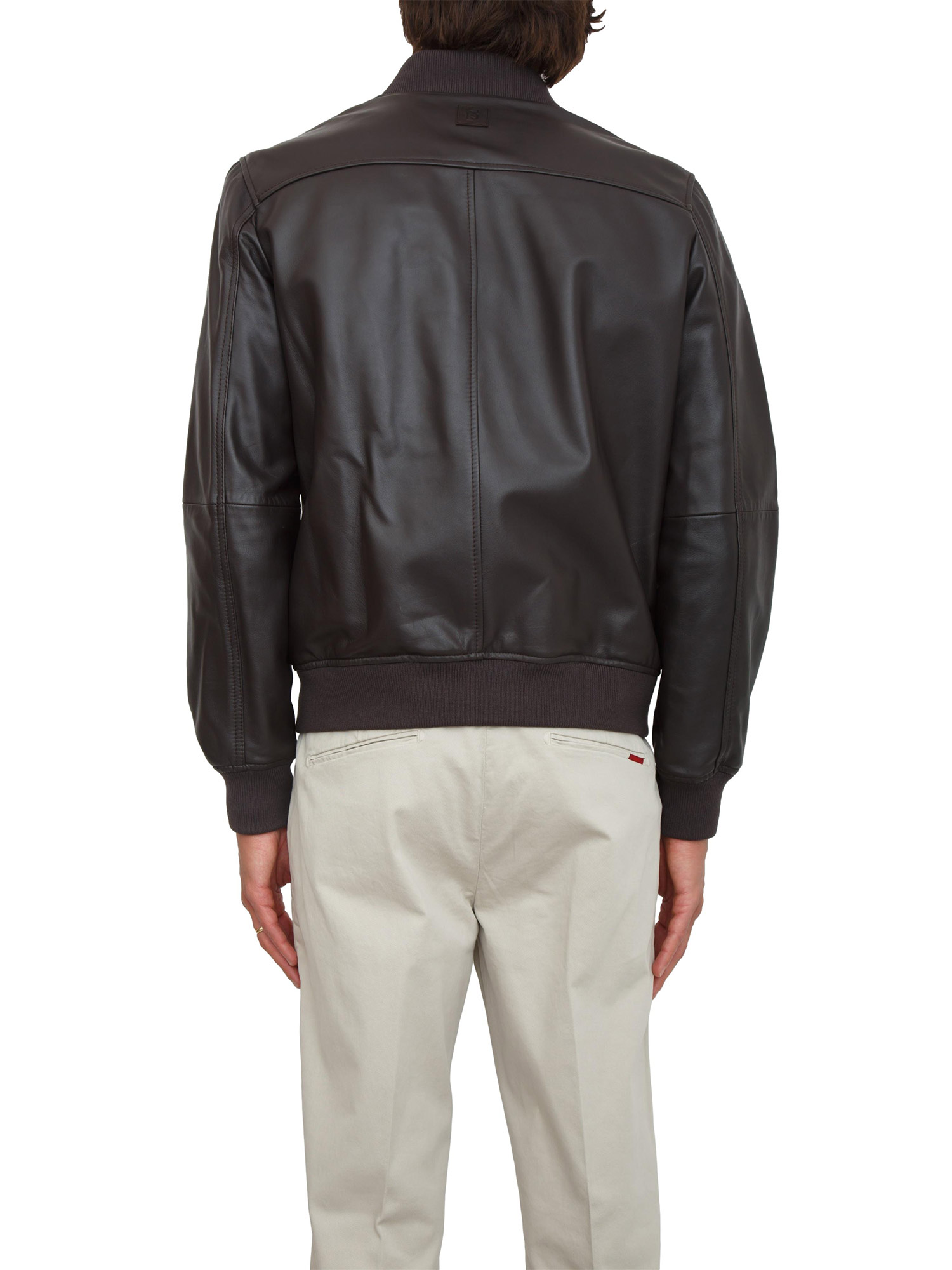 Giubbino bomber Liu Jo uomo realizzato in pelle con tasche laterali e chiusura zip. Design con collo, polsi e fonto in maglia a costine. Il modello è alto 1.90m e indossa la taglia M.
