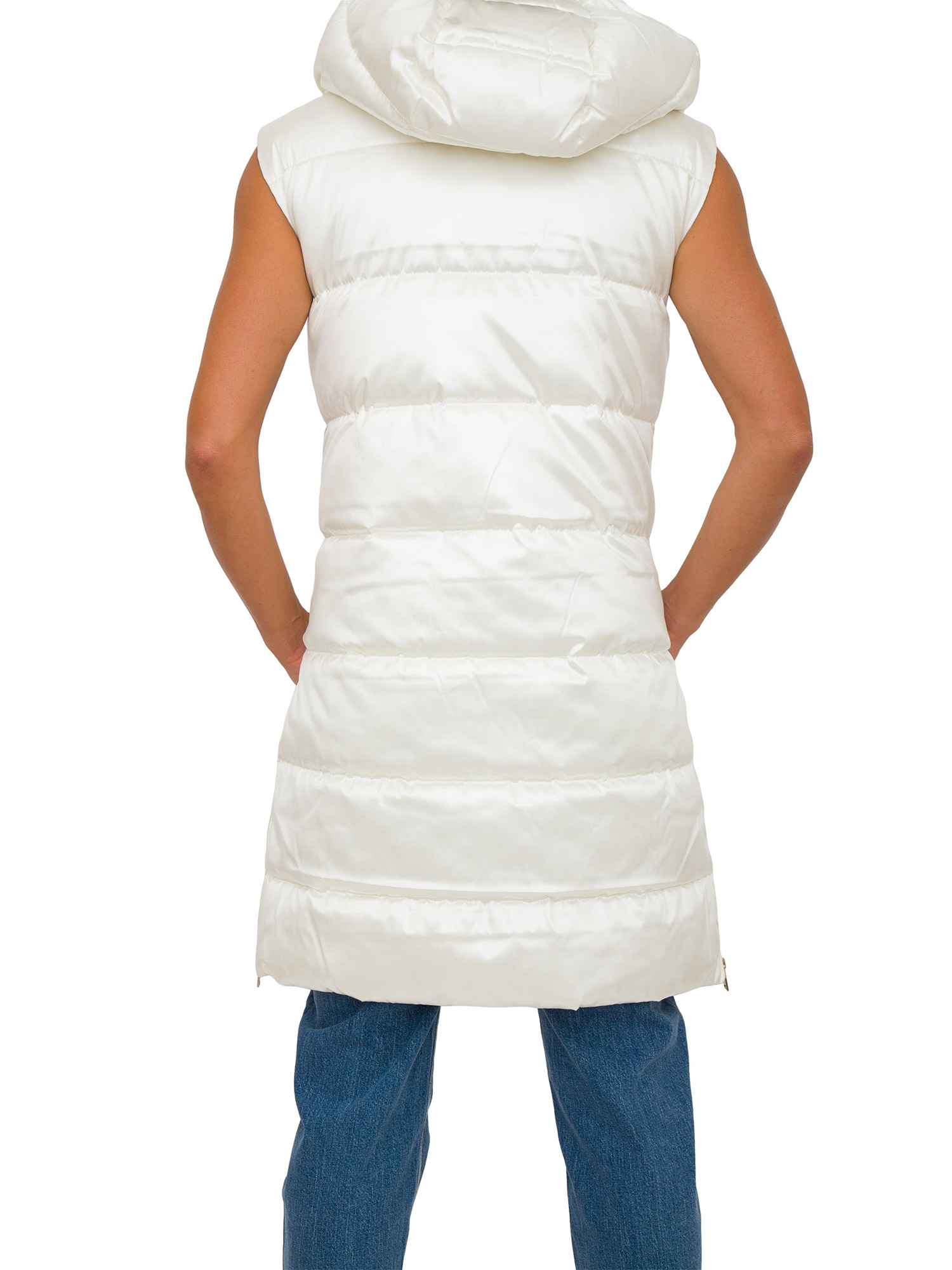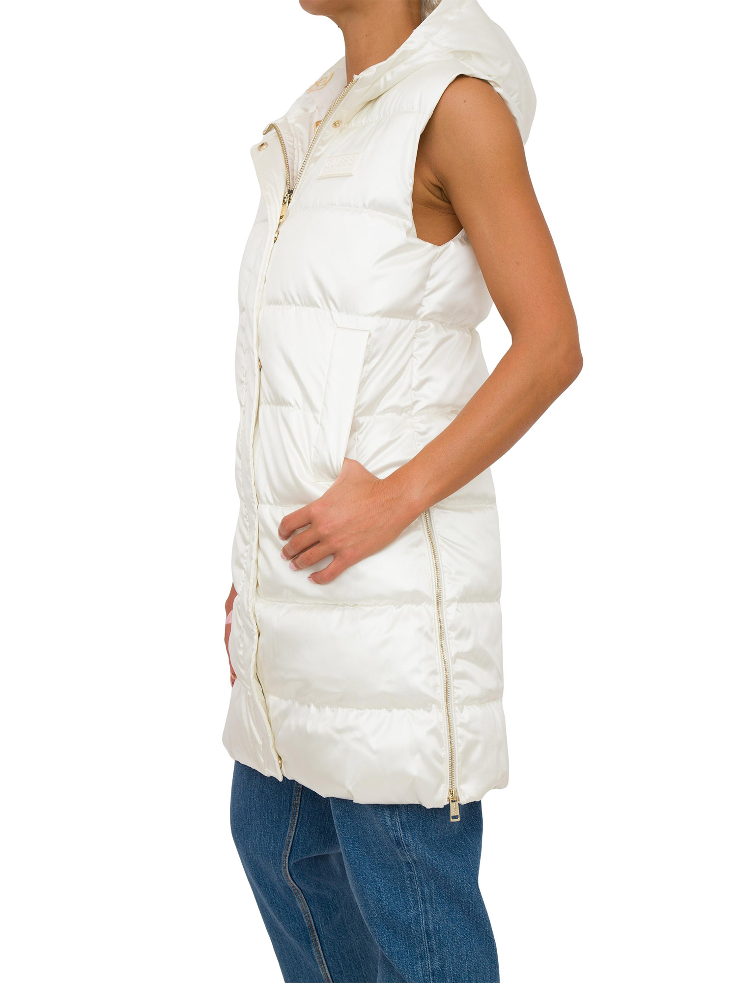 Gilet lungo da donna Guess Jeans effetto specchio, realizzato[and]nbsp;in tessuto sintetico, collo alto con cappuccio, senza maniche, vestibilit[and]agrave; regular e chiusura con cerniera.