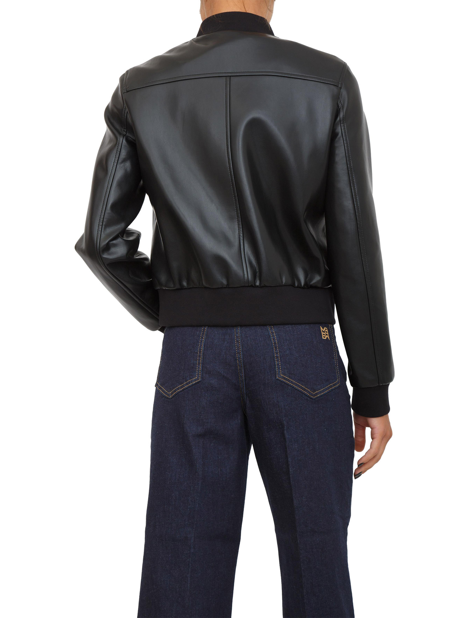 Giubbino Twinset effetto pelle con bottoni a pressione oro logati Oval T. Ha profili in costina, maniche lunghe, tasche applicate con patta e bottone, fodera e linea dritta. Perfetta per tutti i tuoi look autunnali. La modella è alta 1.72 e indossa la taglia 40.