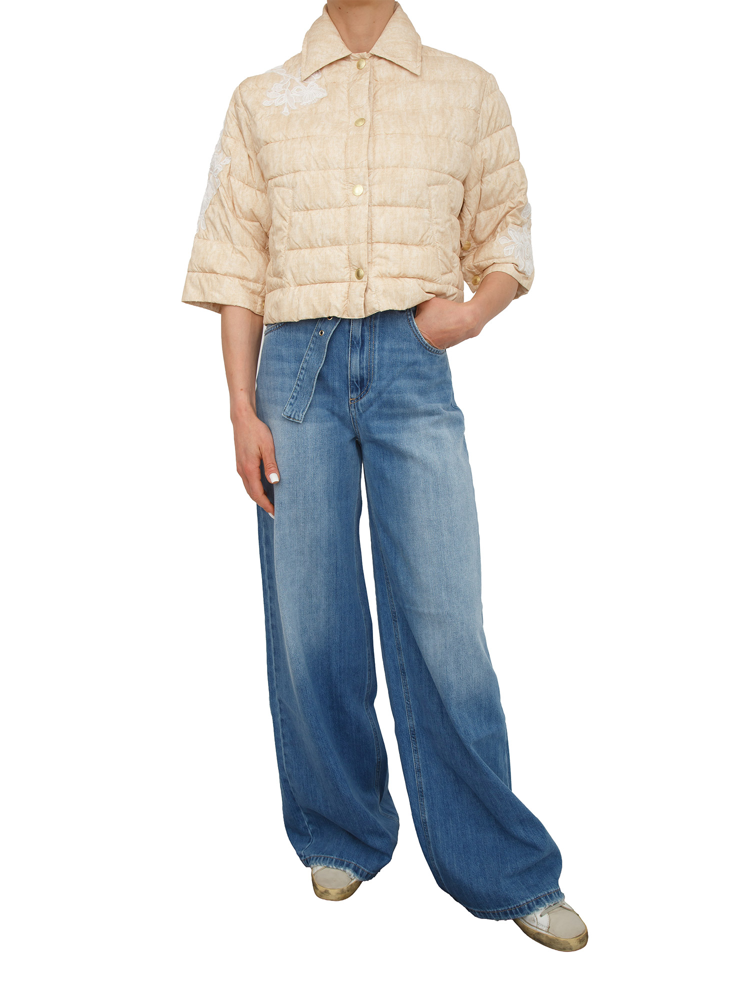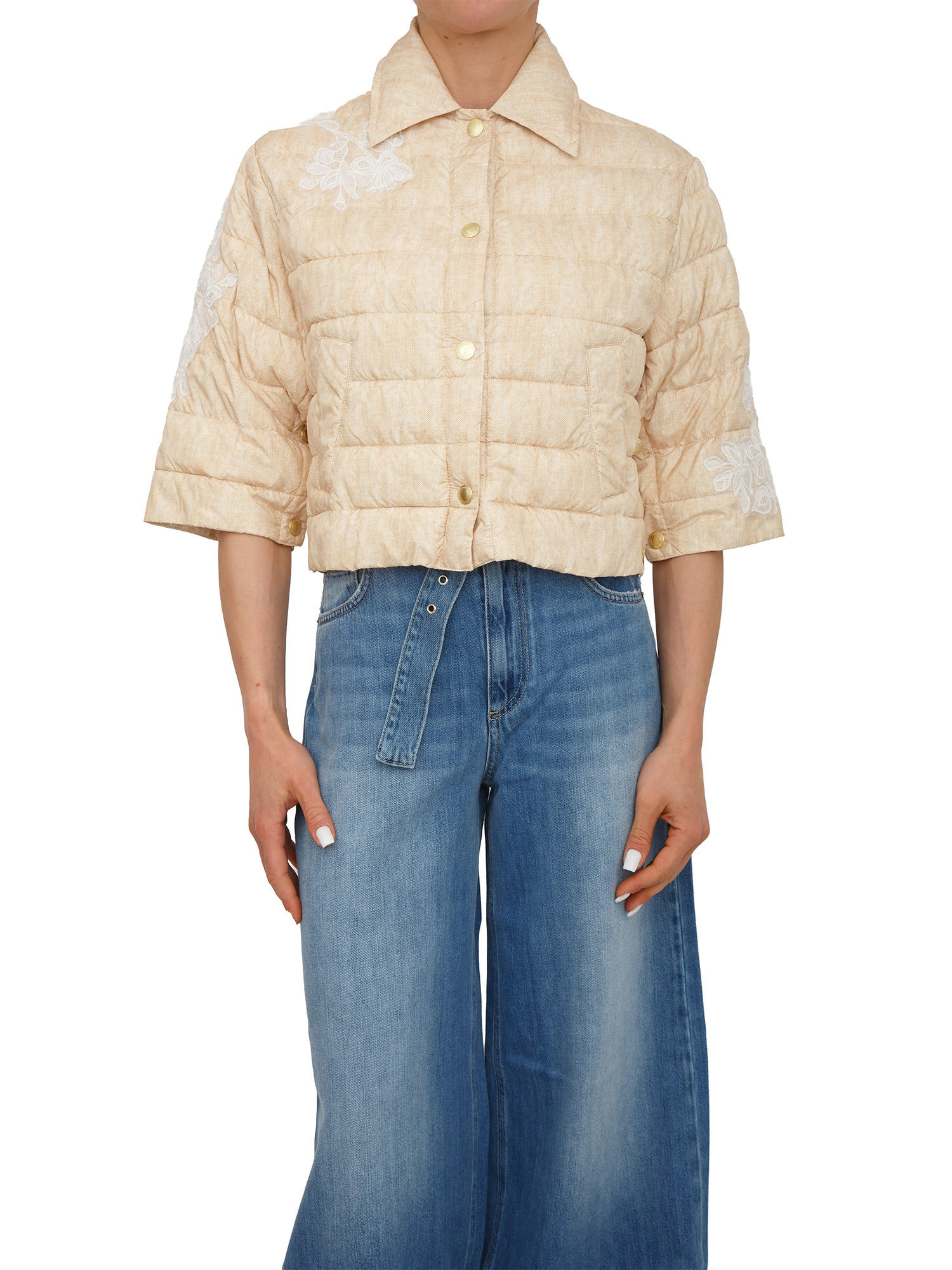 Piumino leggero Ermanno Firenze realizzato con ricamo off white in contrasto, taglio cropped e maniche ampie a tre quarti. Apertura con bottoni a pressione logati e tasche laterali super comode. Comodo e chic da fa paura. La modella è alta 1.72 e indossa la taglia 40.