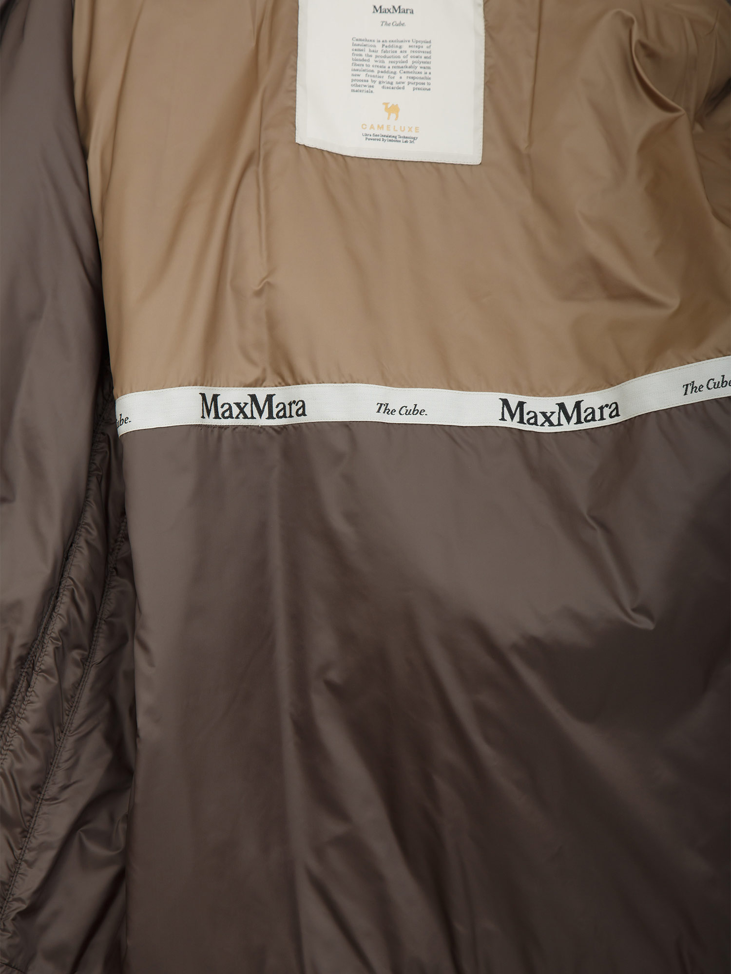 Giubbino imbottito MTCDARIA Max Mara The Cube dalla linea dritta, con cappuccio a coulisse e nastri logati jacquard. Imbottitura Cameluxe con tela antigoccia e spacchi laterali apribili con bottoni a pressione. La modella è alta 1.72 e indossa la taglia 42.