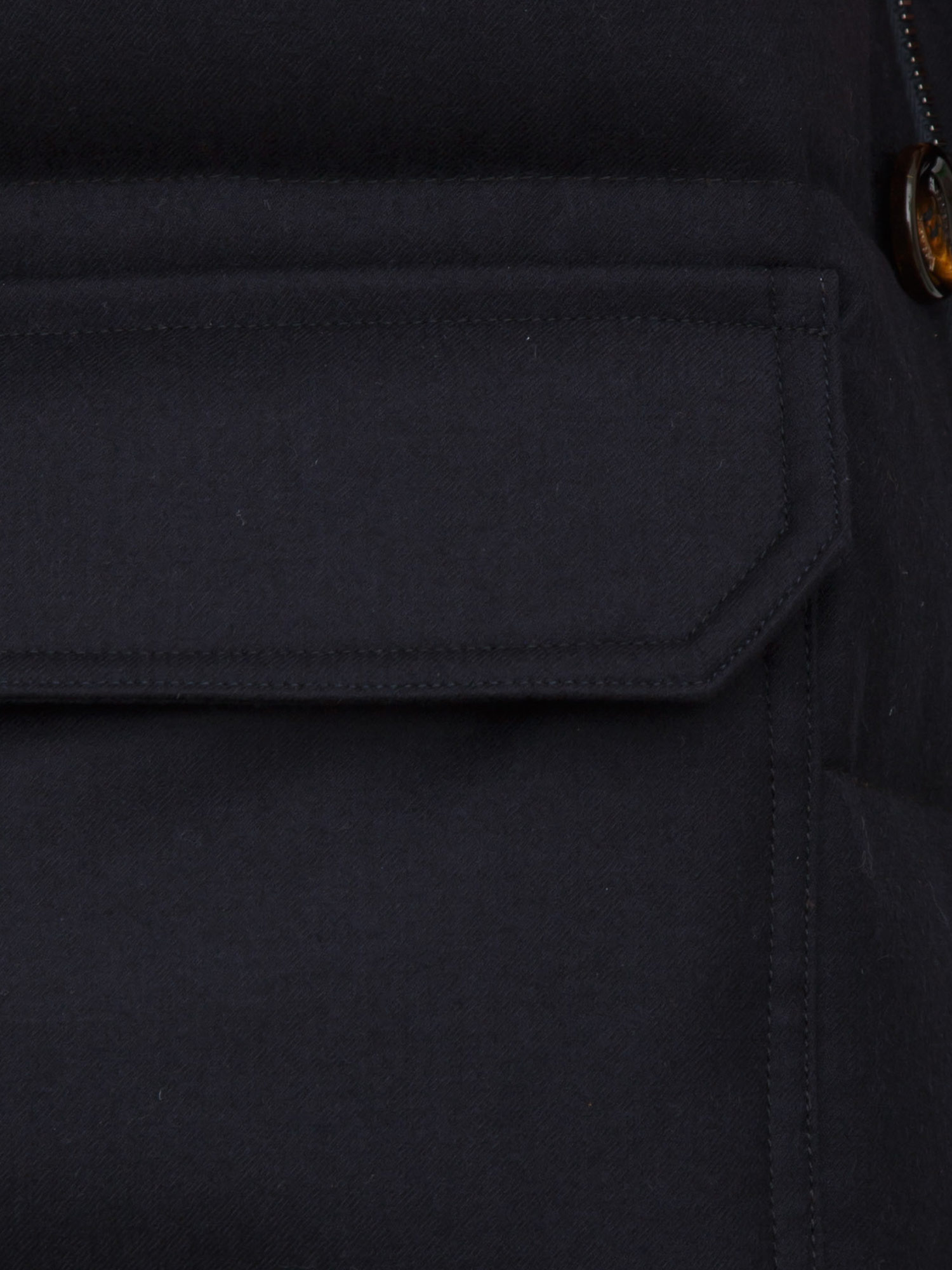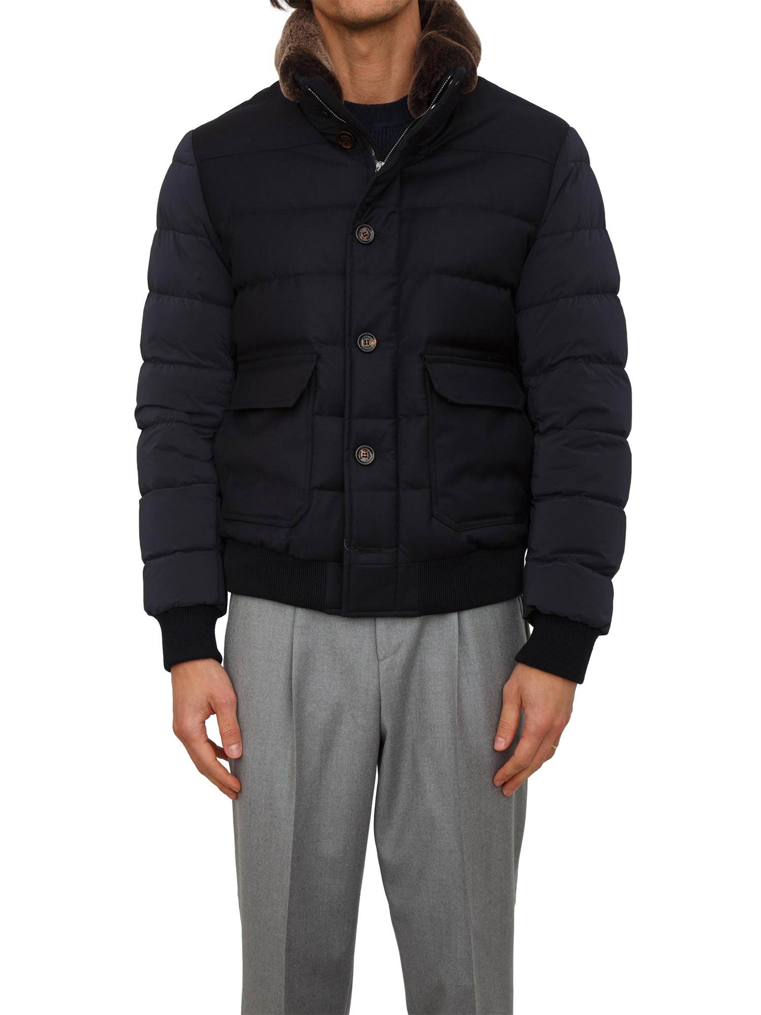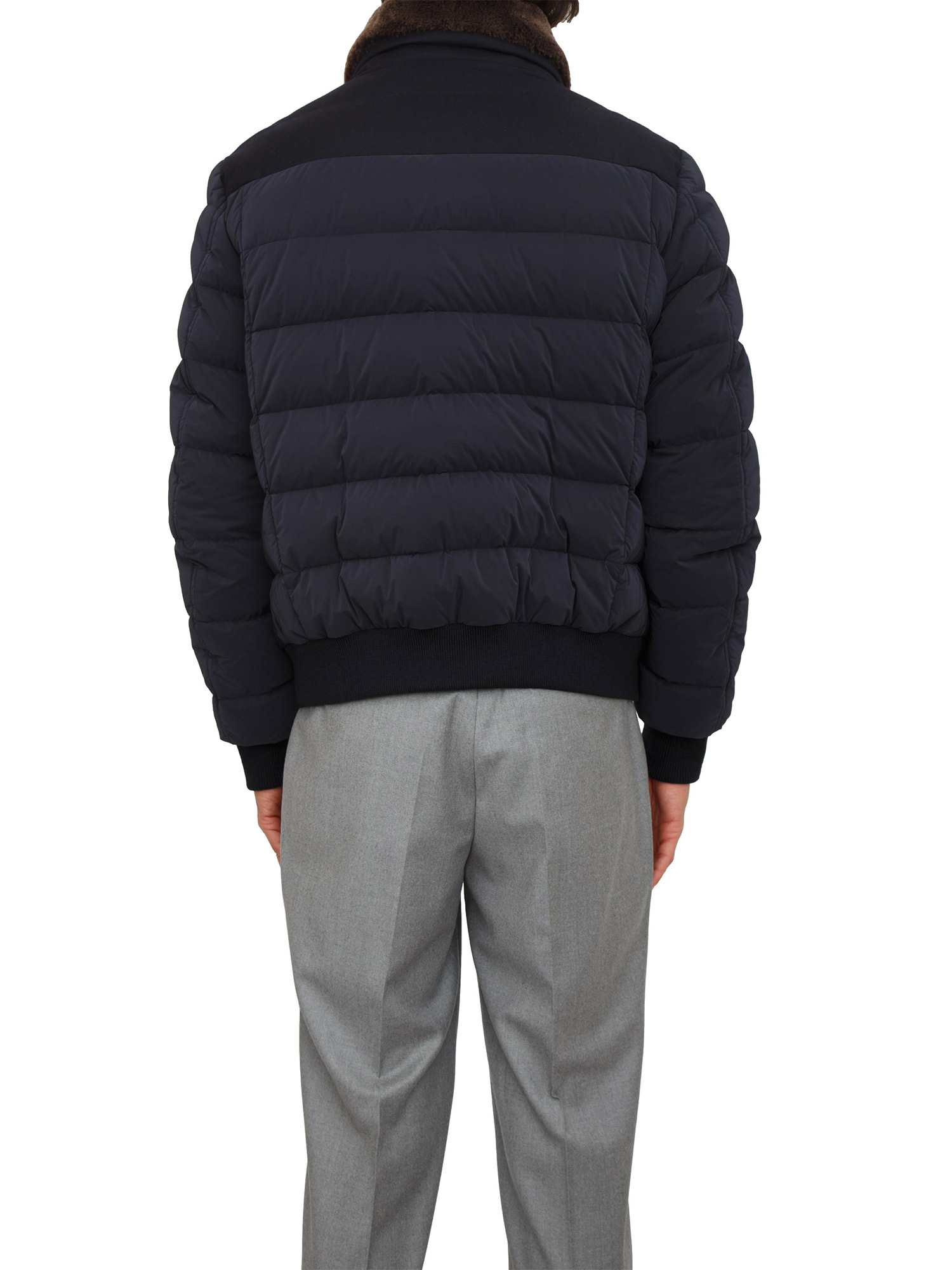Giubbino bomber Moorer uomo, modello Fantoni, realizzato in tessuto tecnico resinato idrorepellente e parti in flanella di lana mista cashmere con membrana traspirante. Imbottito in piuma d’oca e collo in montone merinos staccabile. Il modello è alto 1.90m e indossa la taglia 52.