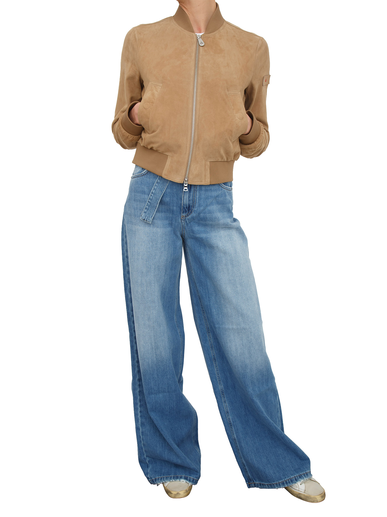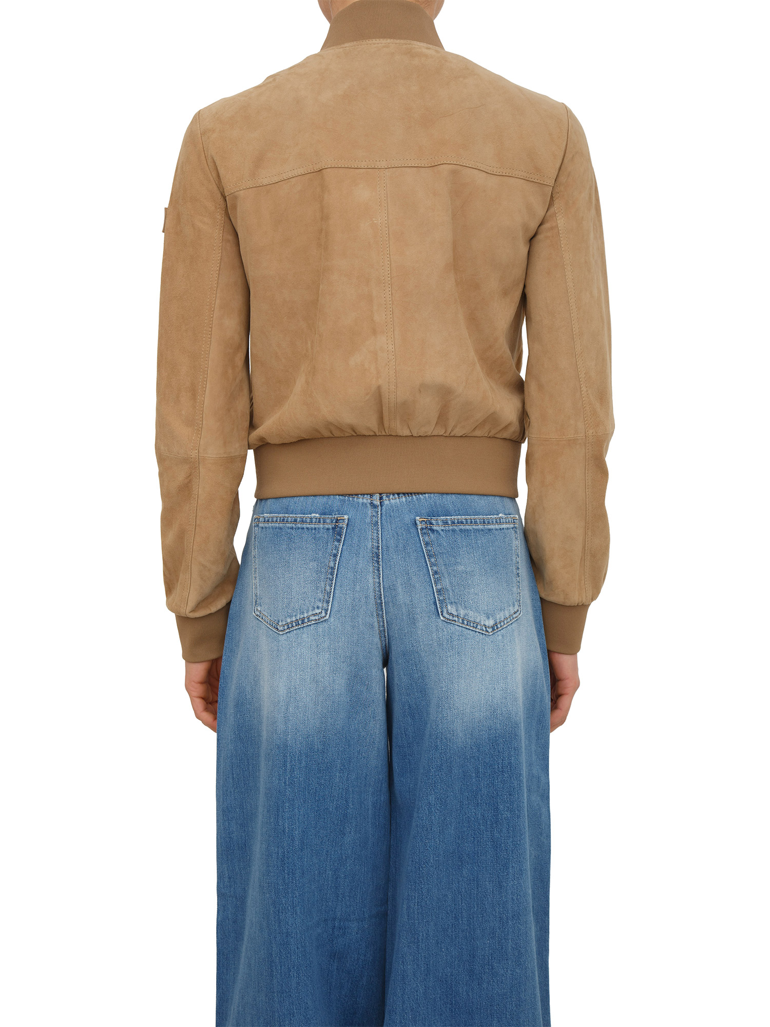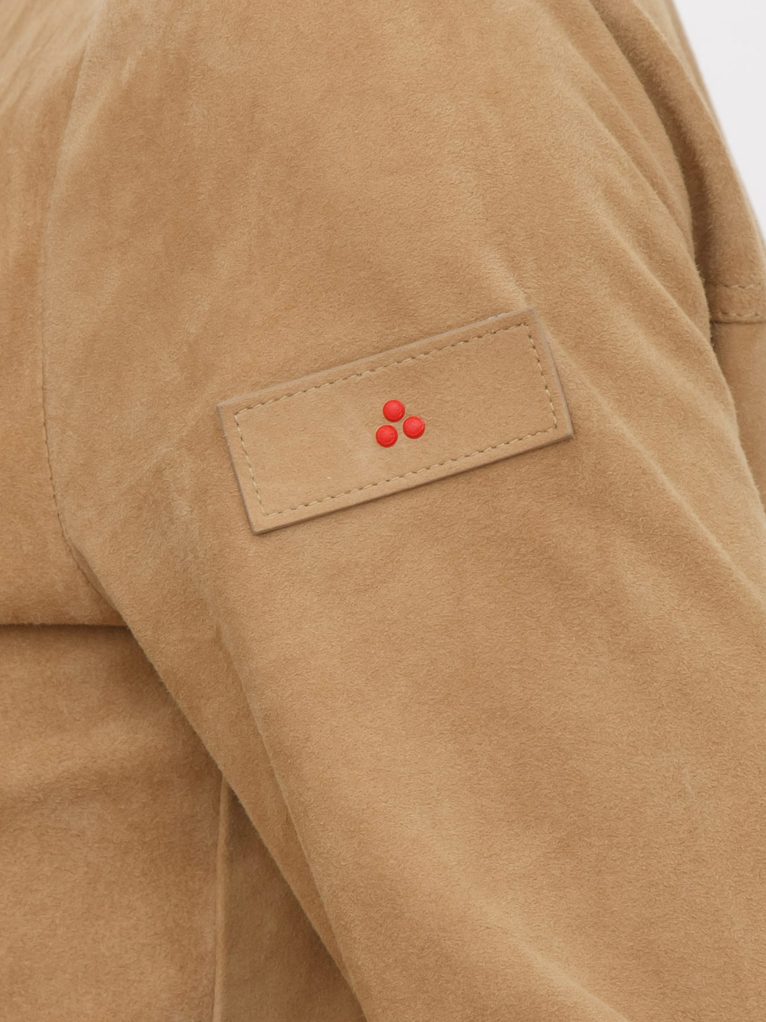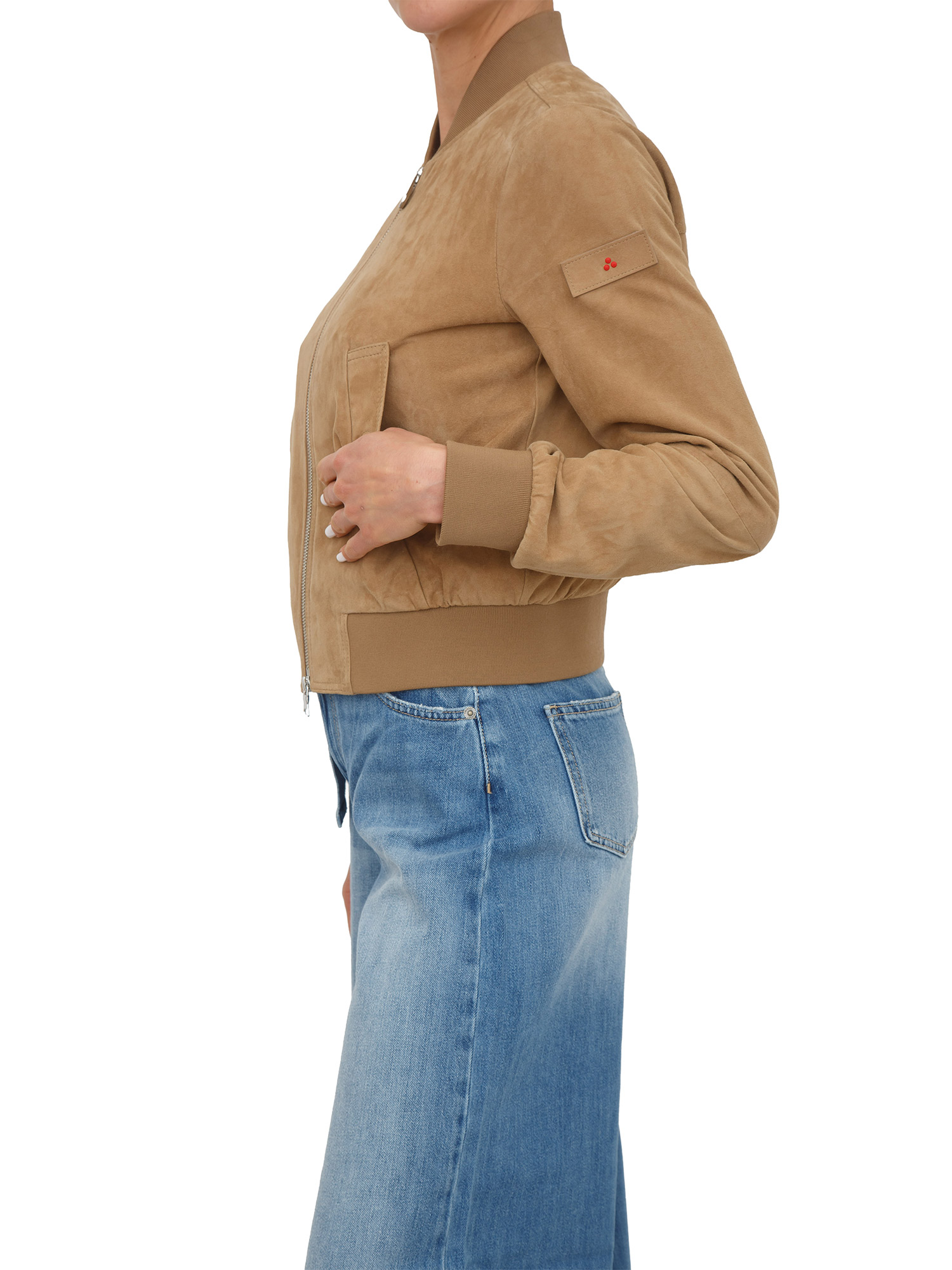 Giubbino bomber Peuterey donna in pelle scamosciata, corto e dalla vestibilità slim, definito da una full zip centrale con doppio cursore, tasche laterali e finiture elastiche su fondo e polsini. Un pezzo iconico reinterpretato con un tocco sofisticato e femminile, perfetto per aggiungere stile e carattere a ogni look.