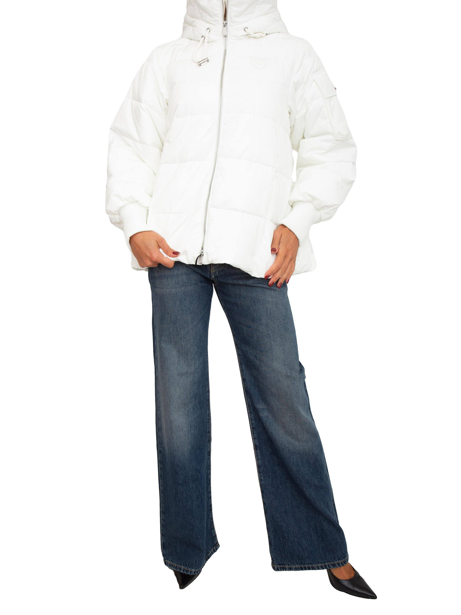 Piumino Pinko in tela tecnica con fit leggermente a campana. Look più sportivo con finishing opaco, tasche con zip invisibile e lavorazione a costine su collo e polsini. Dotato di cappuccio con coulisse, patch con logo davanti e chiusura con zip a doppio cursore. La modella è alta 1.72 e indossa la taglia XS.