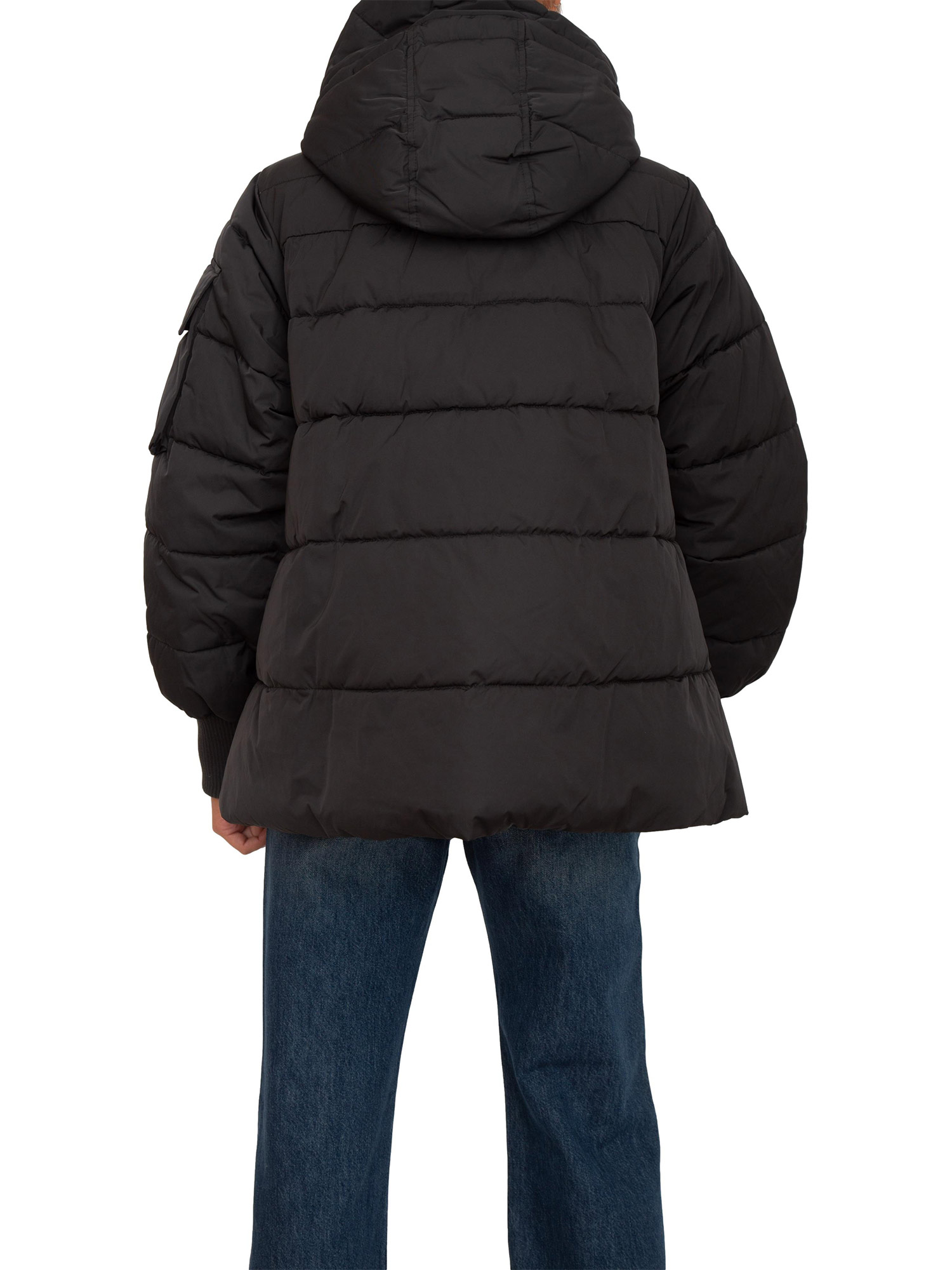 Piumino Pinko in tela tecnica con fit leggermente a campana. Look più sportivo con finishing opaco, tasche con zip invisibile e lavorazione a costine su collo e polsini. Dotato di cappuccio con coulisse, patch con logo davanti e chiusura con zip a doppio cursore. La modella è alta 1.72 e indossa la taglia XS.