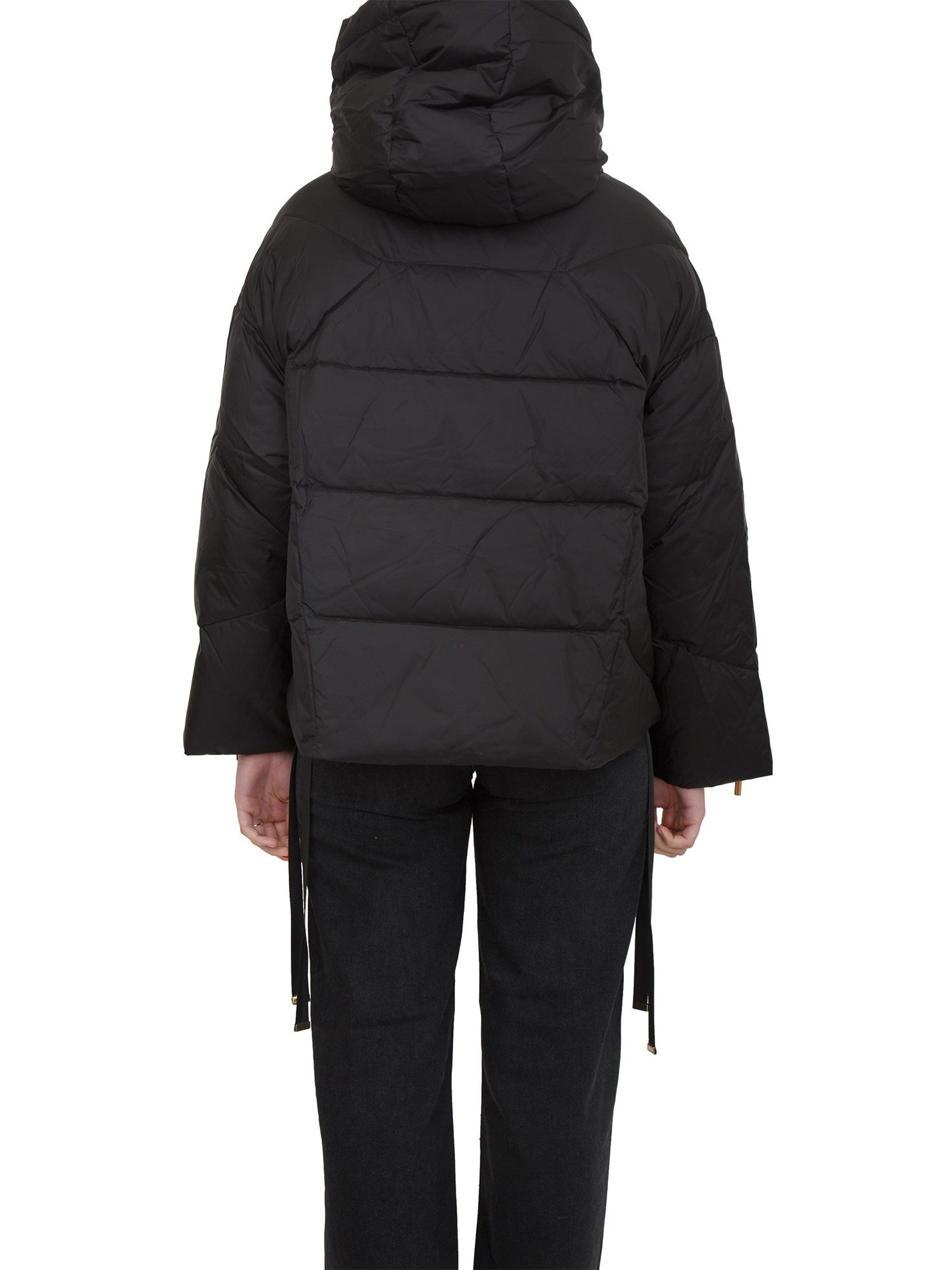Giubbino Twinset in nylon trapuntato con cappuccio. Ha maniche lunghe raglan con polso con zip, chiusura con zip dorata, tasche laterali e linea leggermente svasata. Design con lacci laterali con punta dorata per un effetto fashion. La modella è alta 1.77 e indossa la taglia 40.