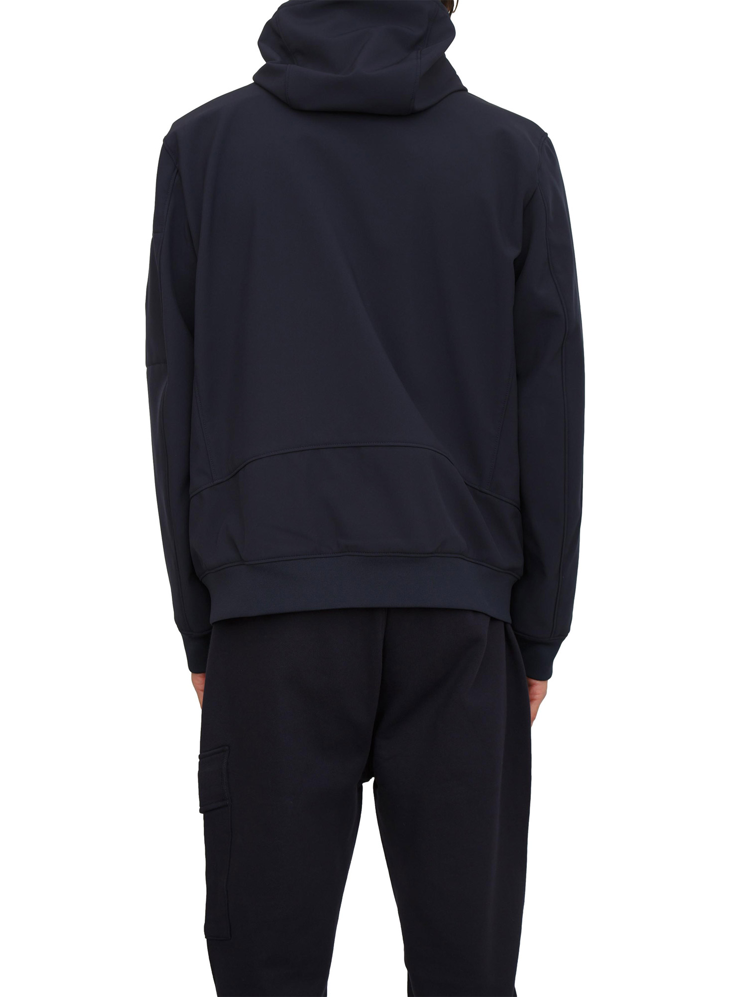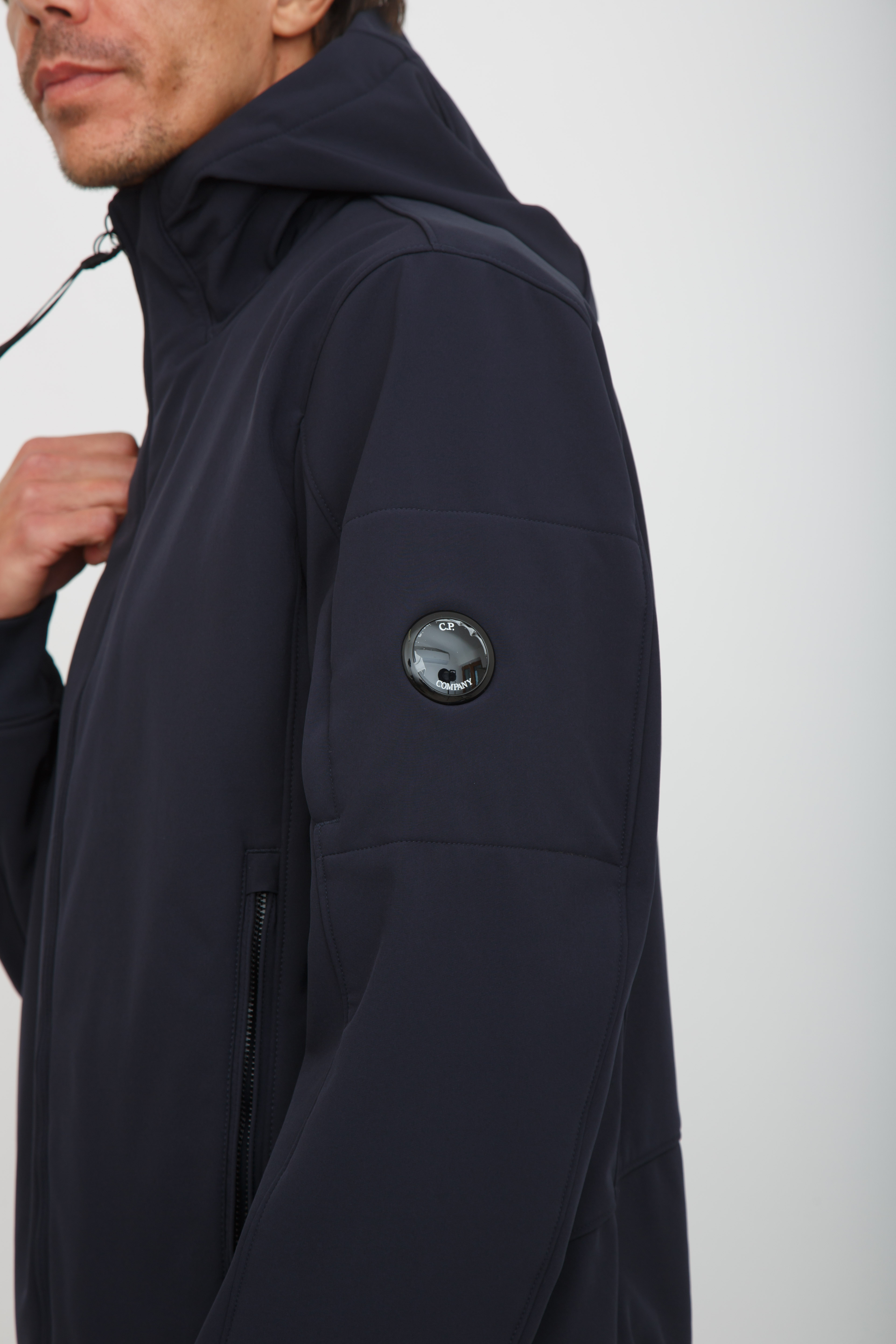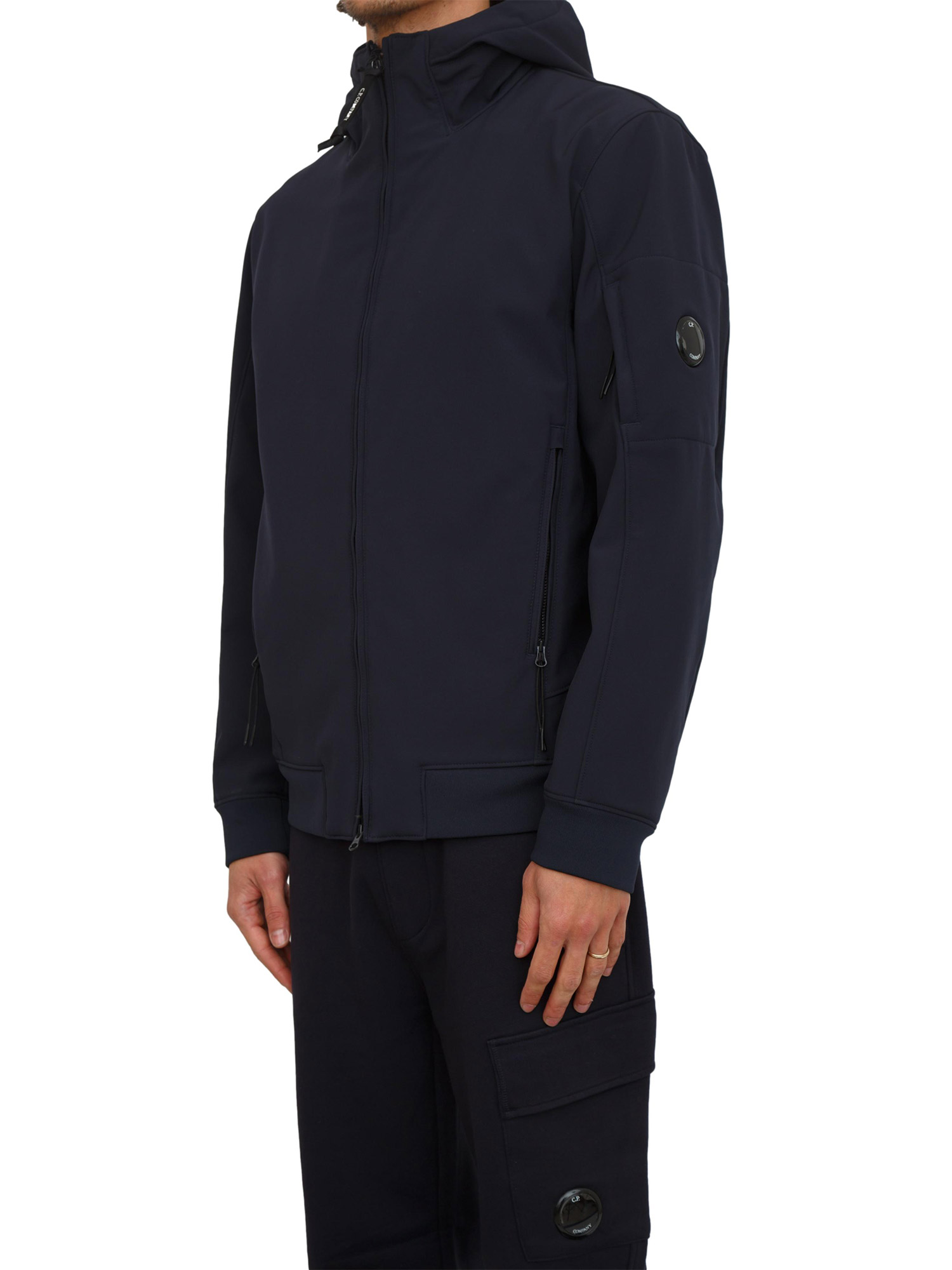 Giubbino uomo C.P. Company con cappuccio realizzato in C.P. Shell-R, un softshell stretch a 3 strati certificato antipioggia e antivento. Dotato di chiusura full zip a doppio cursore, tasche laterali con zip e l’iconica Lente. Regular fit. Il modello è alto 1.90m e indossa la taglia XL.