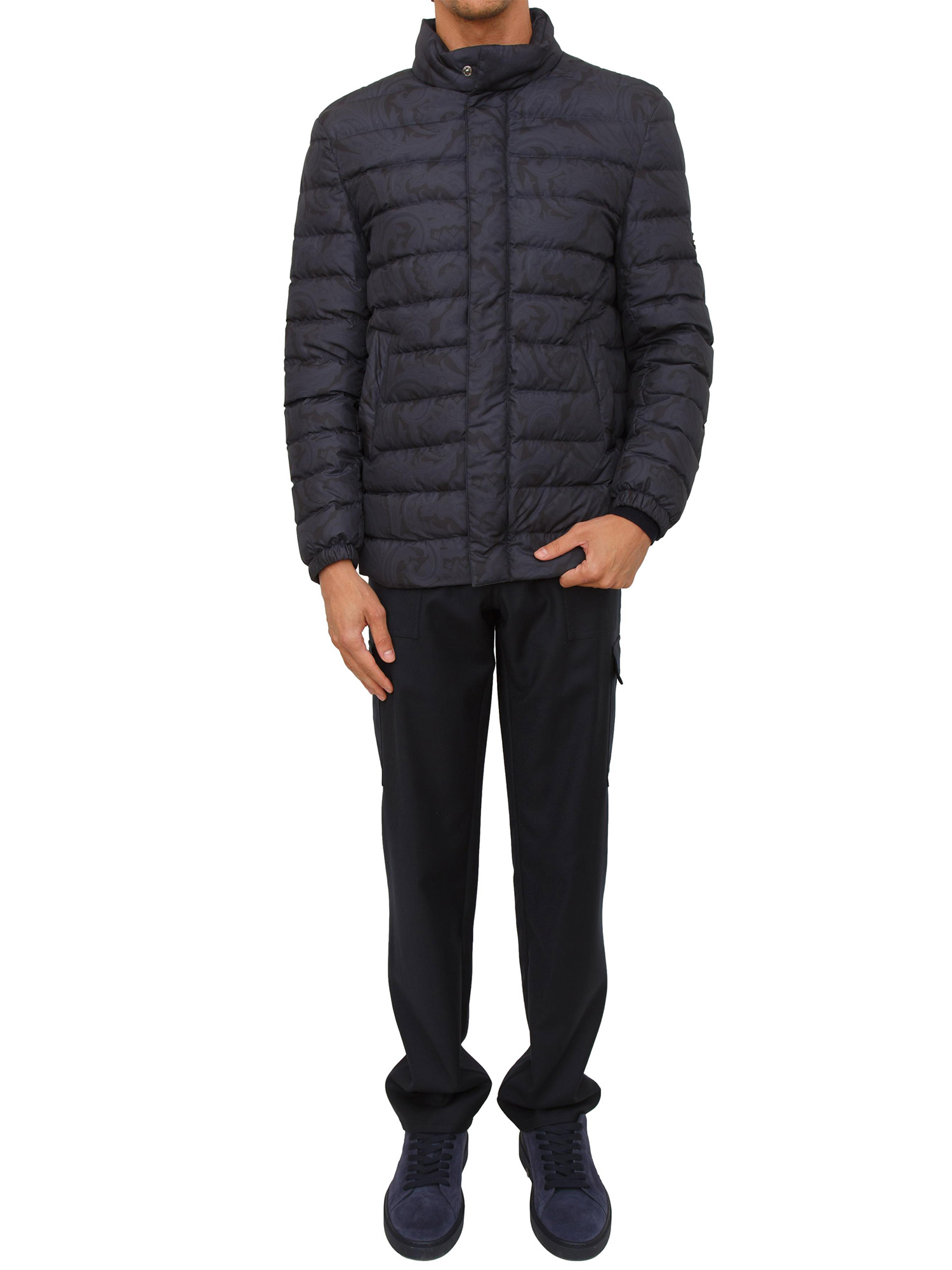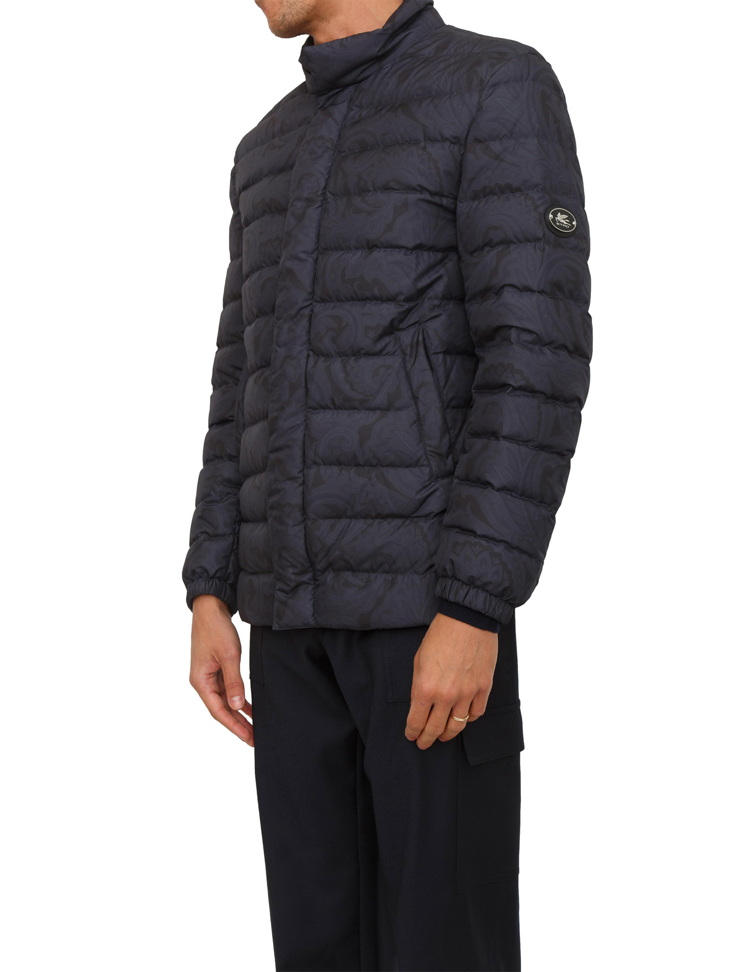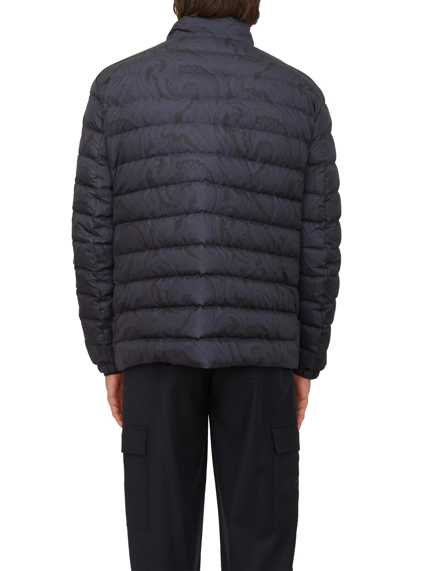 Piumino Etro uomo realizzato in nylon trapuntato decorato da stampa Paisley davanti, vestibilità regular e tasche laterali. Il modello è impreziosito da logo ETRO e Pegaso ricamati sul petto, chiusura bottoni a pressione e cerniera doppio cursore. Il modello è alto 1.90m e indossa la taglia M.