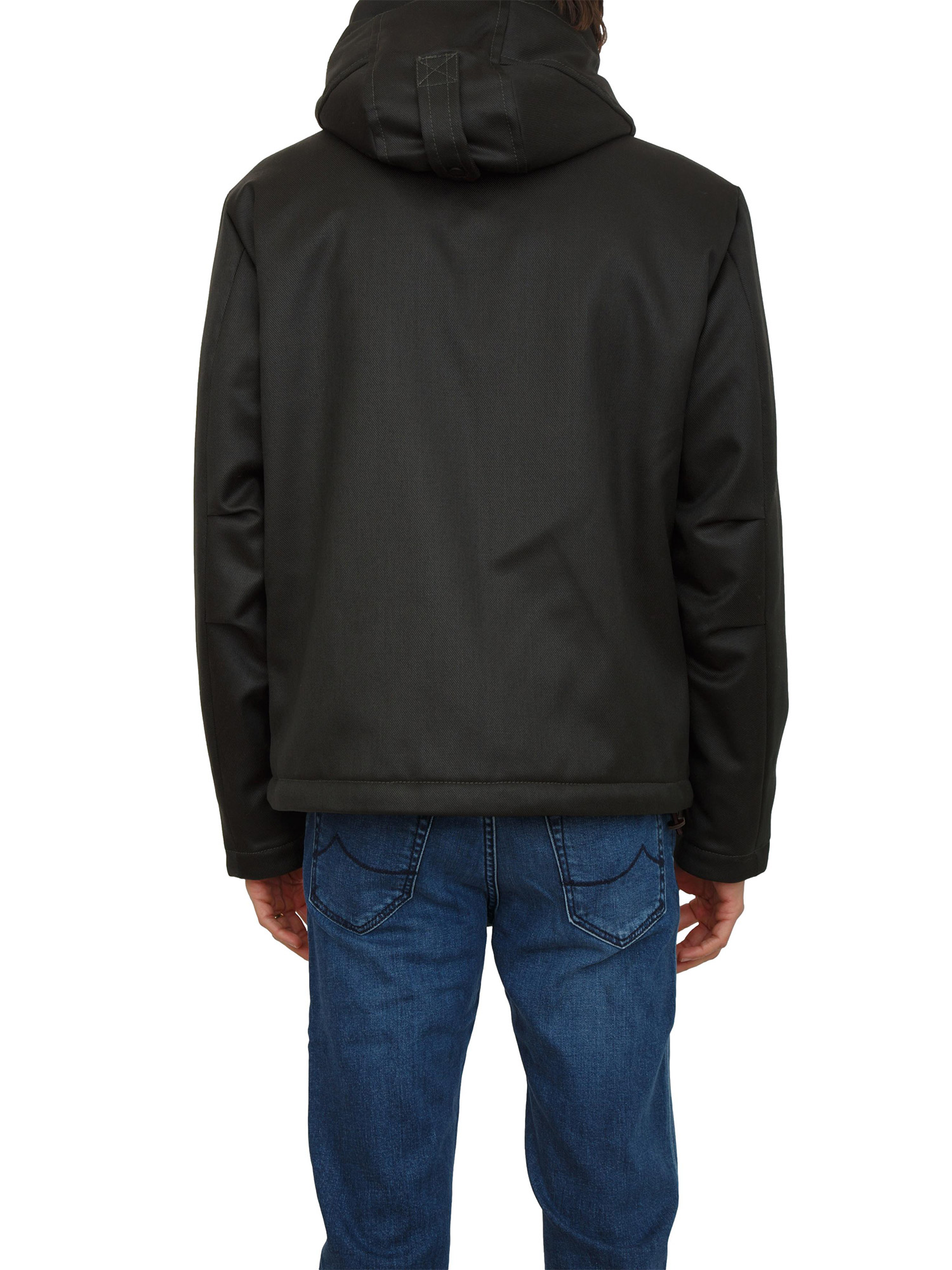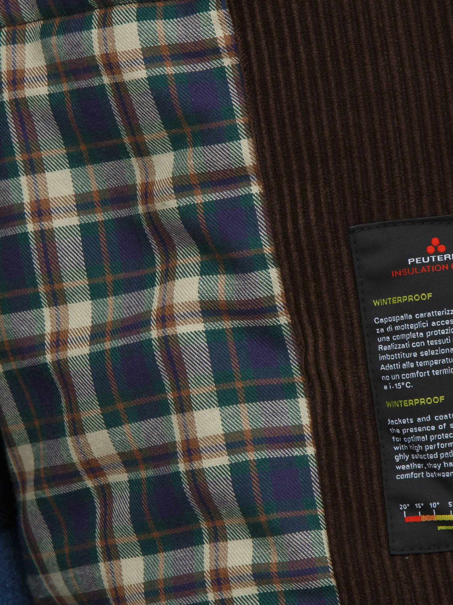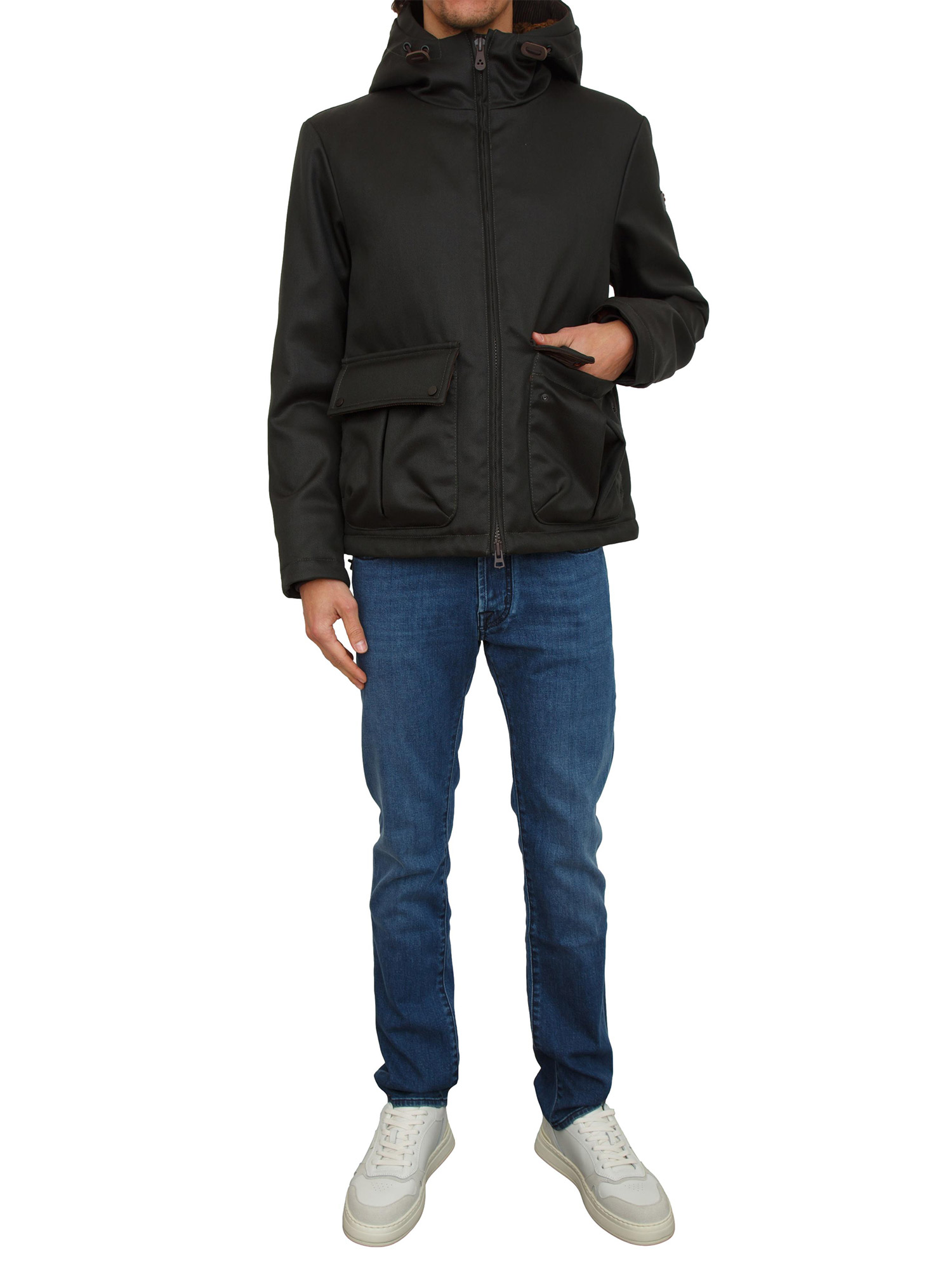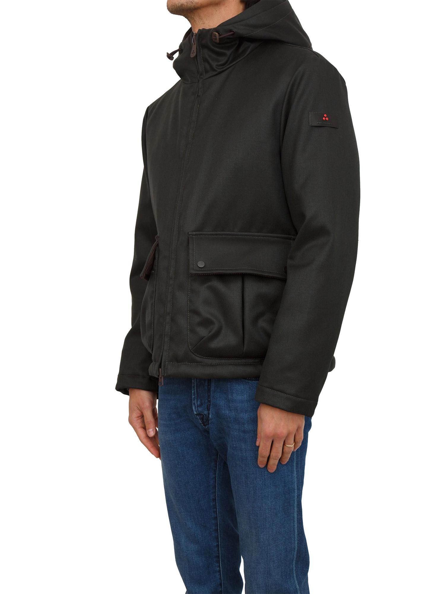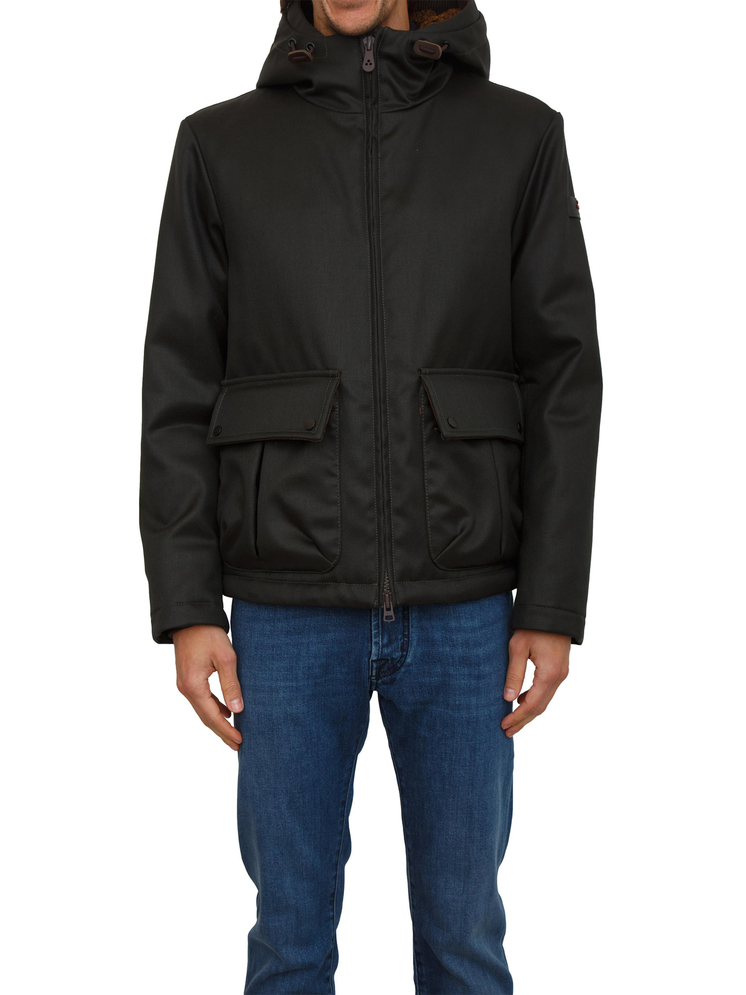 Giubbino uomo Peuterey in drill di lana e nylon cordura con finish semi lucido, progettato per unire eleganza e resistenza. Il tessuto idrorepellente e l’imbottitura in Primaloft garantiscono protezione e comfort termico senza appesantire. Cappuccio regolabile con ecopelliccia, coulisse in vita per personalizzare la vestibilità e pratiche tasche laterali. Il modello è alto 1.90m e indossa la taglia M.