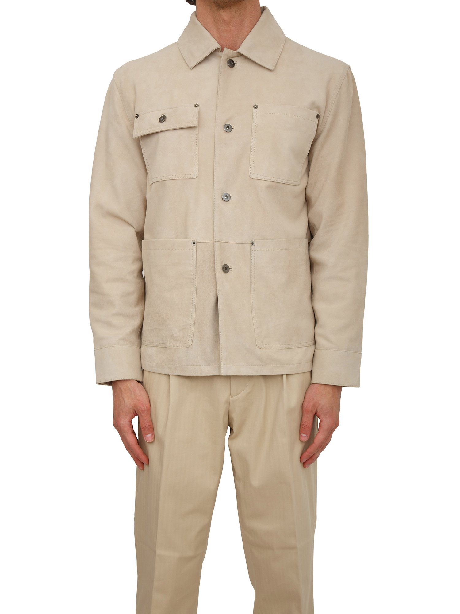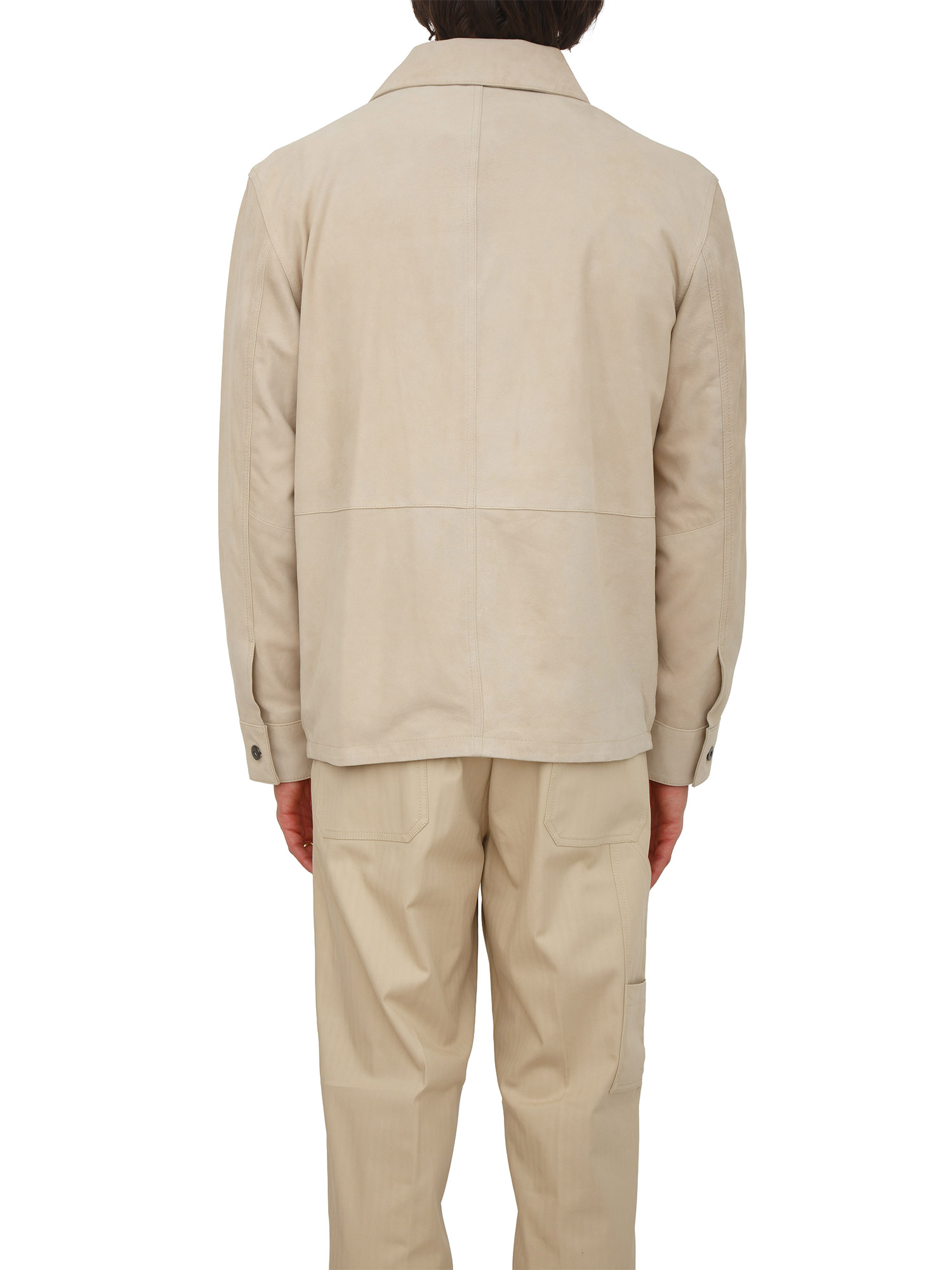 Giubbotto Paolo Pecora realizzato in pregiata pelle scamosciata dal design ricercato e contemporaneo. Modello a camicia con chiusura bottoni meallici, quattro tasche applicate, maniche con chiusura bottone e cuciture sul retro. Il modello è alto 1.90m e indossa la taglia 48.