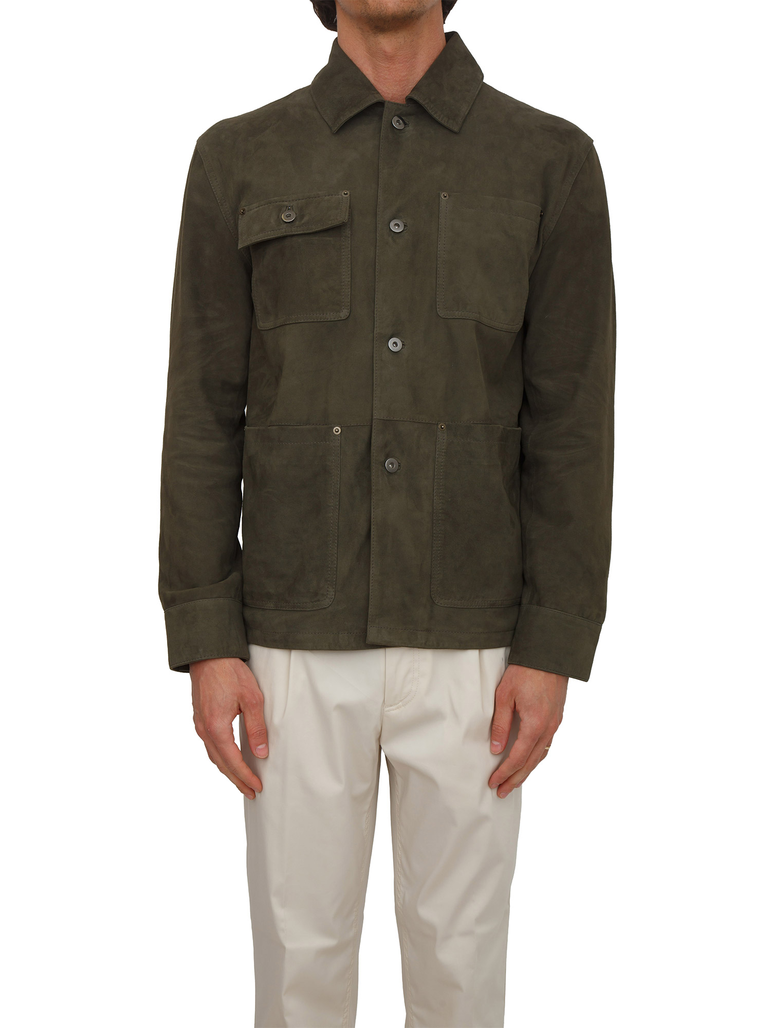 Giubbotto Paolo Pecora realizzato in pregiata pelle scamosciata dal design ricercato e contemporaneo. Modello a camicia con chiusura bottoni meallici, quattro tasche applicate, maniche con chiusura bottone e cuciture sul retro. Il modello è alto 1.90m e indossa la taglia 48.