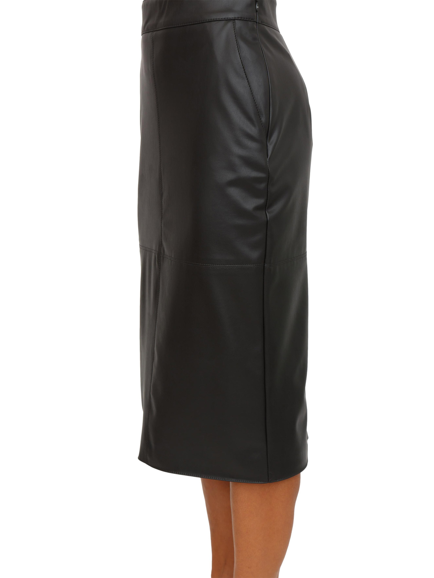 Gonna a tubino Elisabetta Franchi in ecopelle effetto nappa e fit aderente. Arricchita da tagli con cuciture che donano struttura al capo. Sorprendente il retro con ganci gioiello in metallo dorato di gusto corsetteria. La modella è alta 1.72 e indossa la taglia 40.