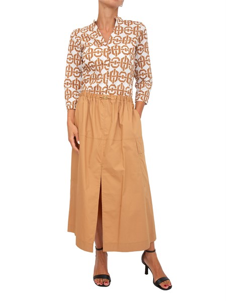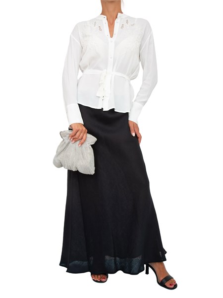 -     Gonna in twill di pura seta caratterizzata da una silhouette svasata e listino alto in vita in tessuto double. La modella è alta 1.80m e indossa la taglia 40.