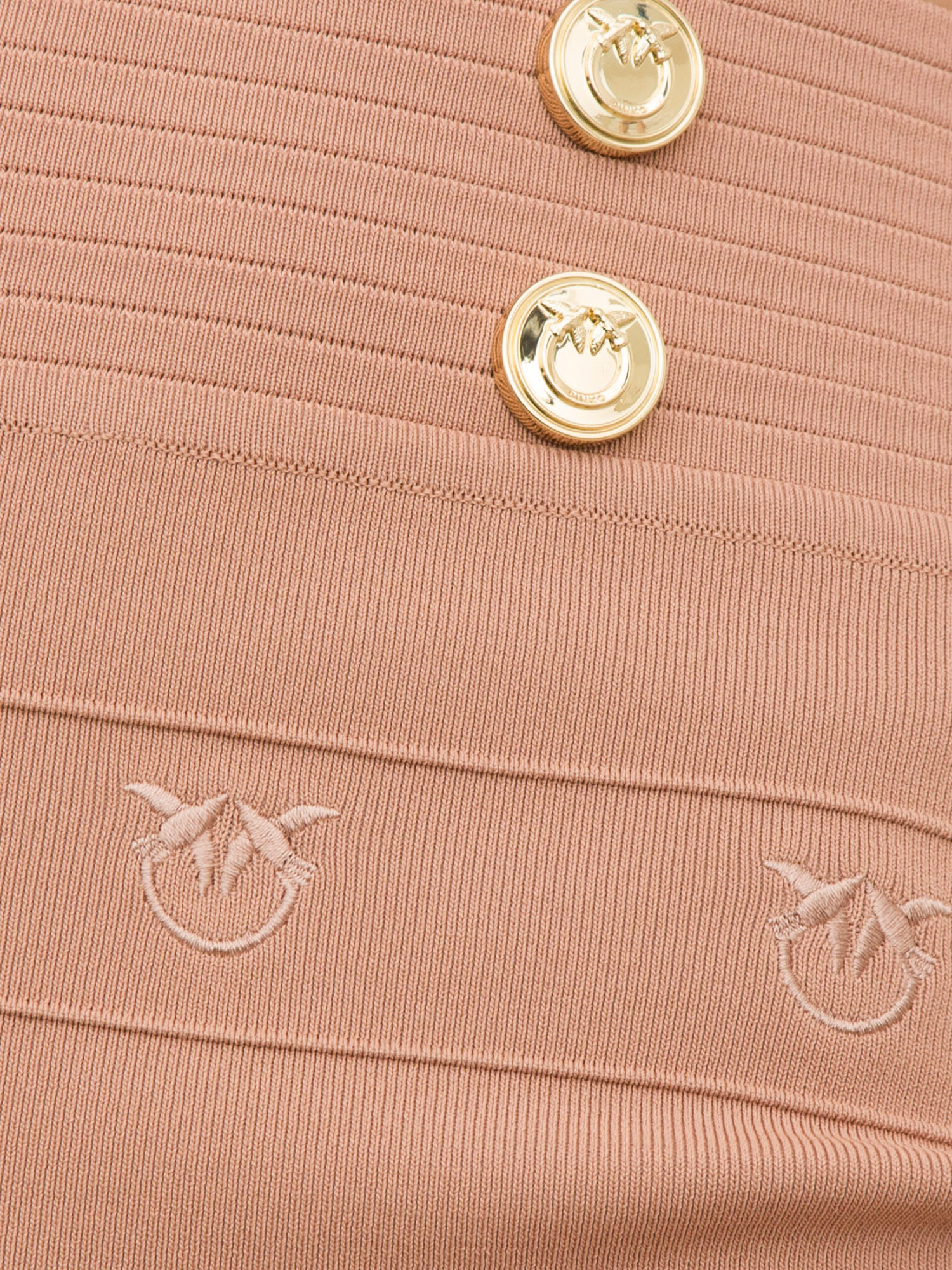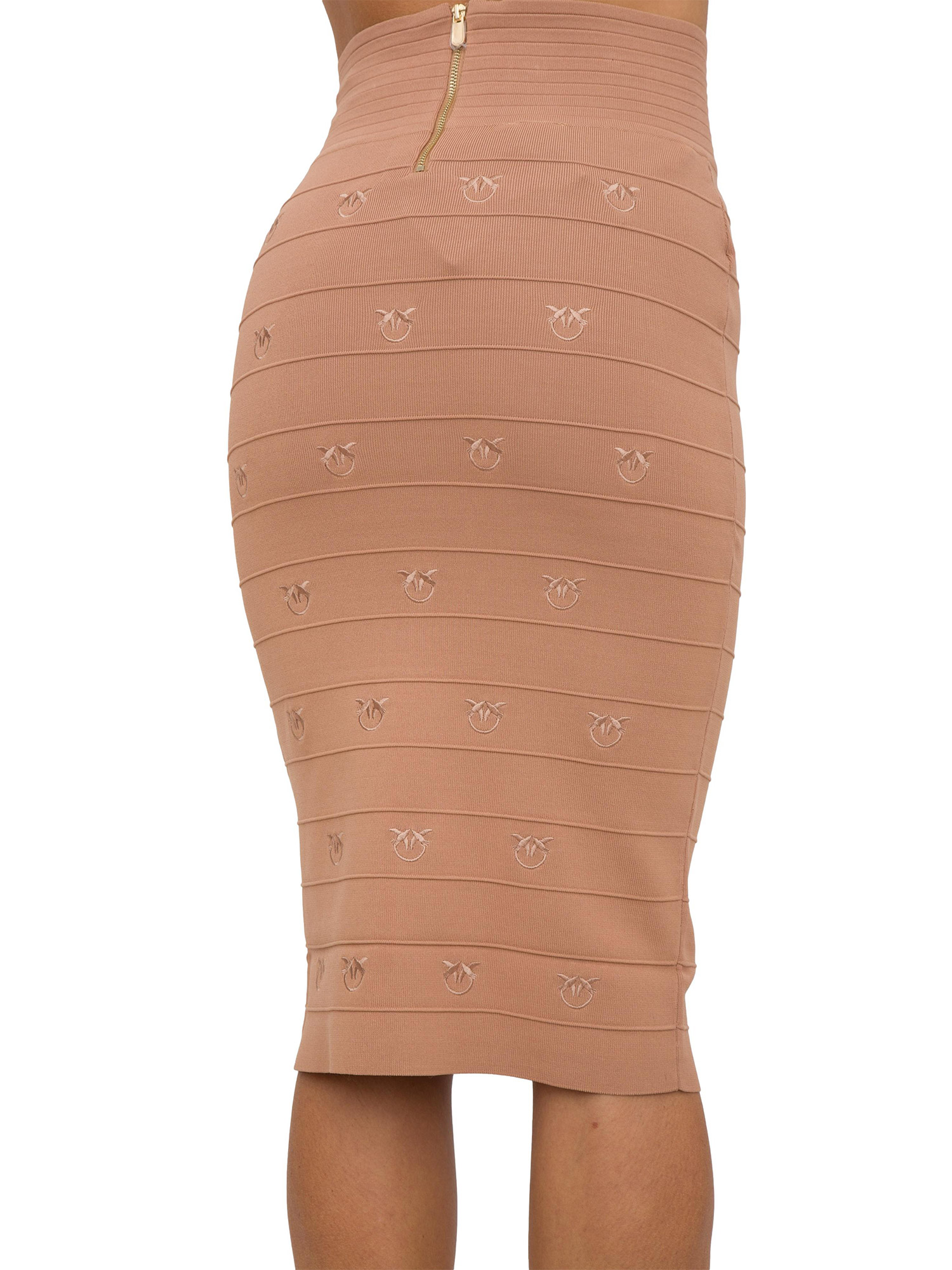 Gonna longuette dalla linea aderente in maglia di misto viscosa jacquard lavorata a bande orizzontali, personalizzate con ricamo logo Love Birds. Dettaglio di bottoni in metallo applicati in vita. Chiusura con zip in metallo nel centro dietro.