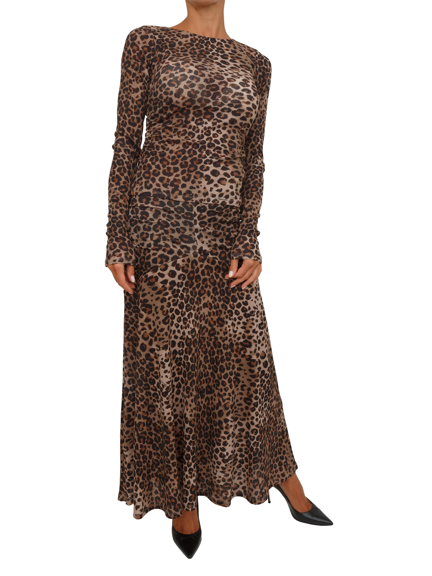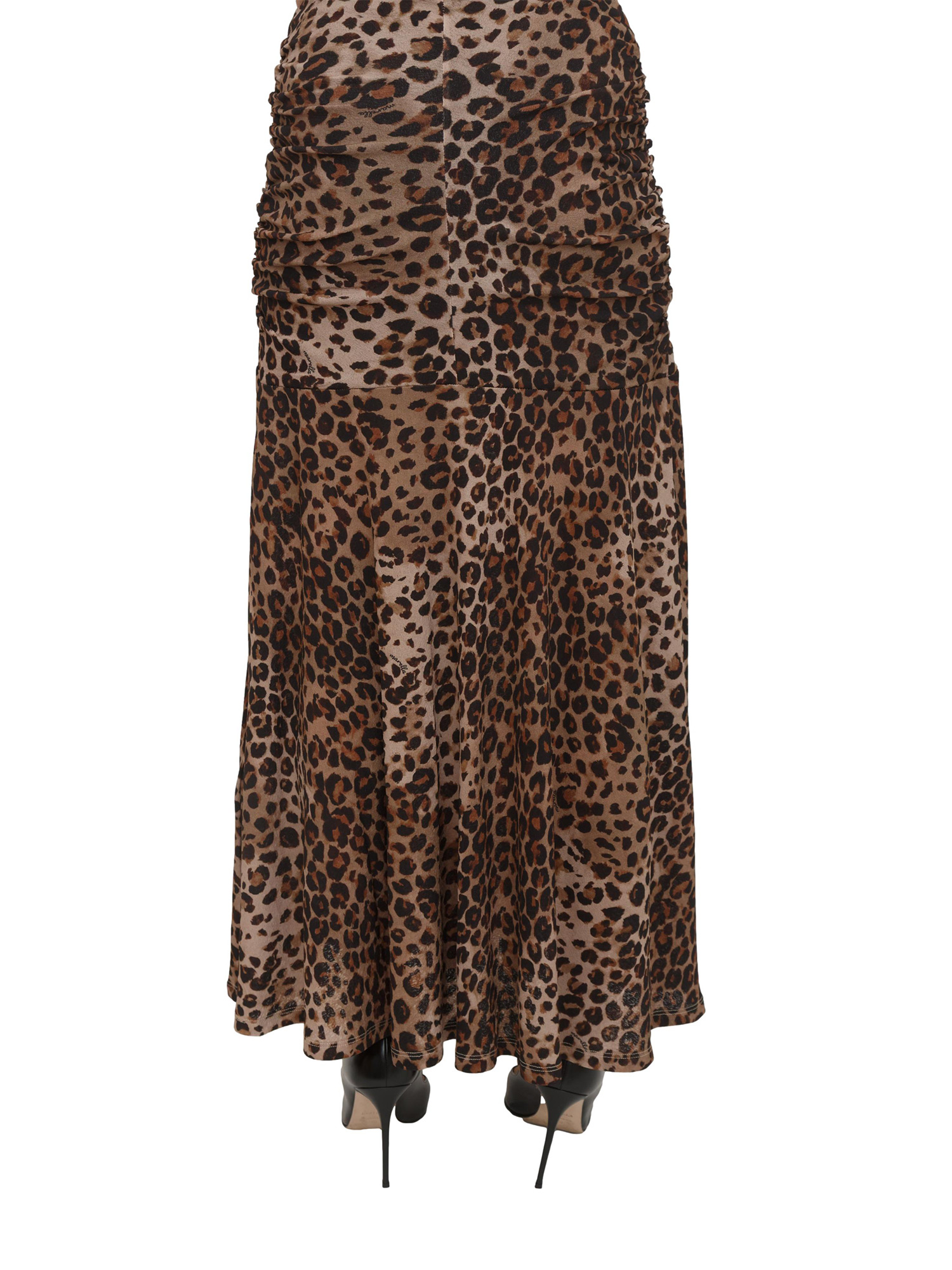 L'allure intramontabile della gonna Mrella, in versione up to date: nuovo modello con baschina e tagli asimmetrici che regalano dinamicità ad un design addolcito da stampa animalier. Realizzata in jersey di tulle stampato con fit svasato, foderato e arricciature sui fianchi. La modella è alta 1.72 e indossa la taglia S.