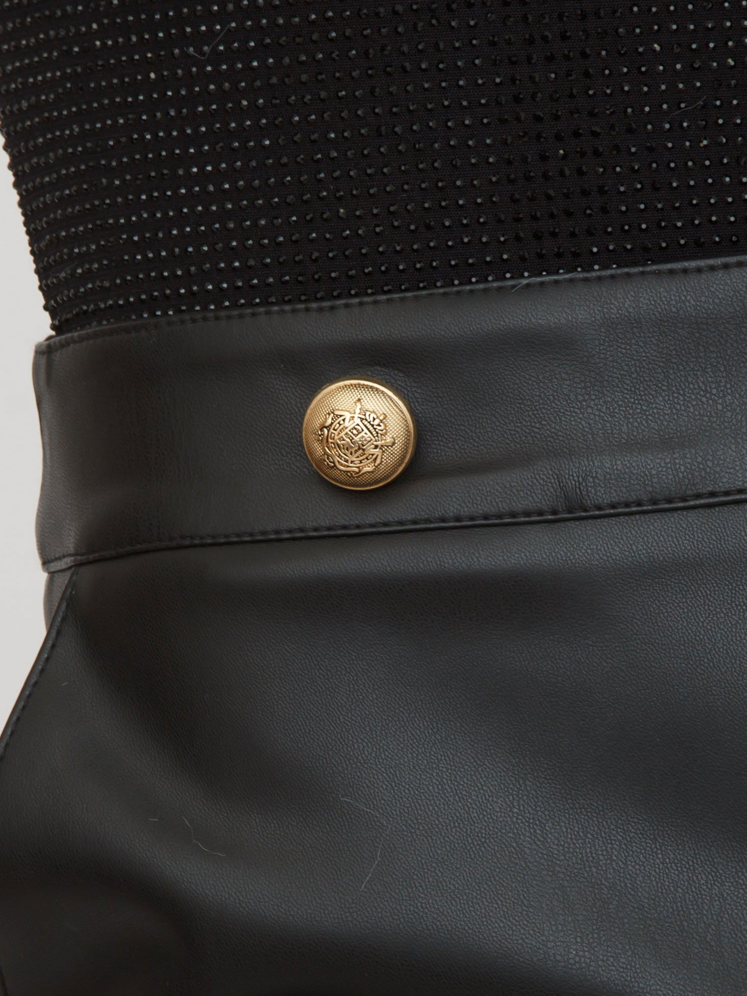 Lo stile minimal di questa gonna corta Mariaelisa firmata Kocca è impreziosito dal tessuto in ecopelle e da due bottoni dorati in vita che regalano stile e carattere al capo. La modella è alta 1.72 e indossa la taglia 38.