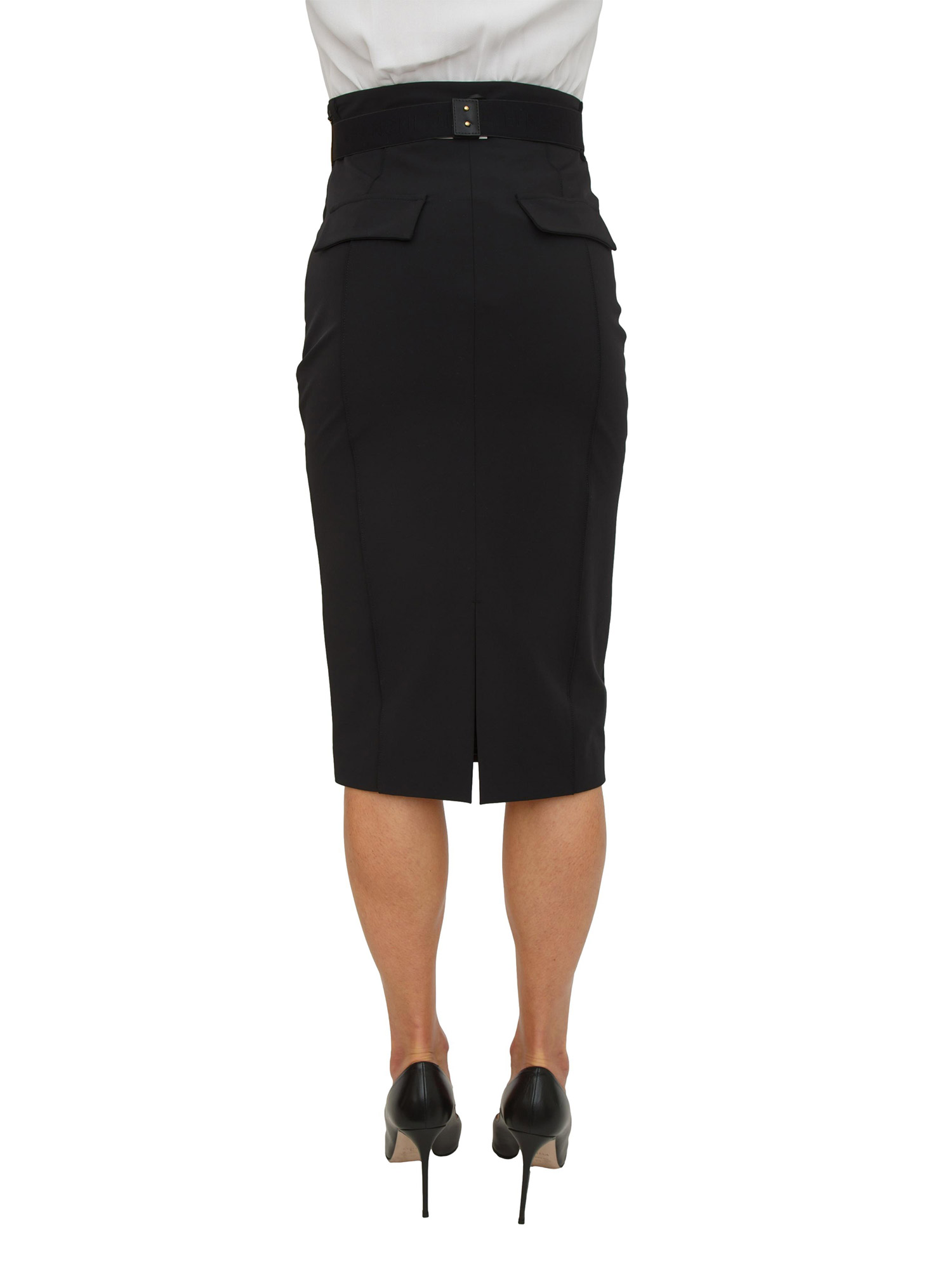 Gonna midi Elisabetta Franchi in tessuto tecnico bielastico. La costruzione a tubino è definita dalle nervature sul davanti e sul retro. La cintura in vita ha placca in metallo dorato con logo, ad aggiungere luce. Spacco sul retro. Vestibilità aderente. La modella è alta 1.72 e indossa la taglia 40.