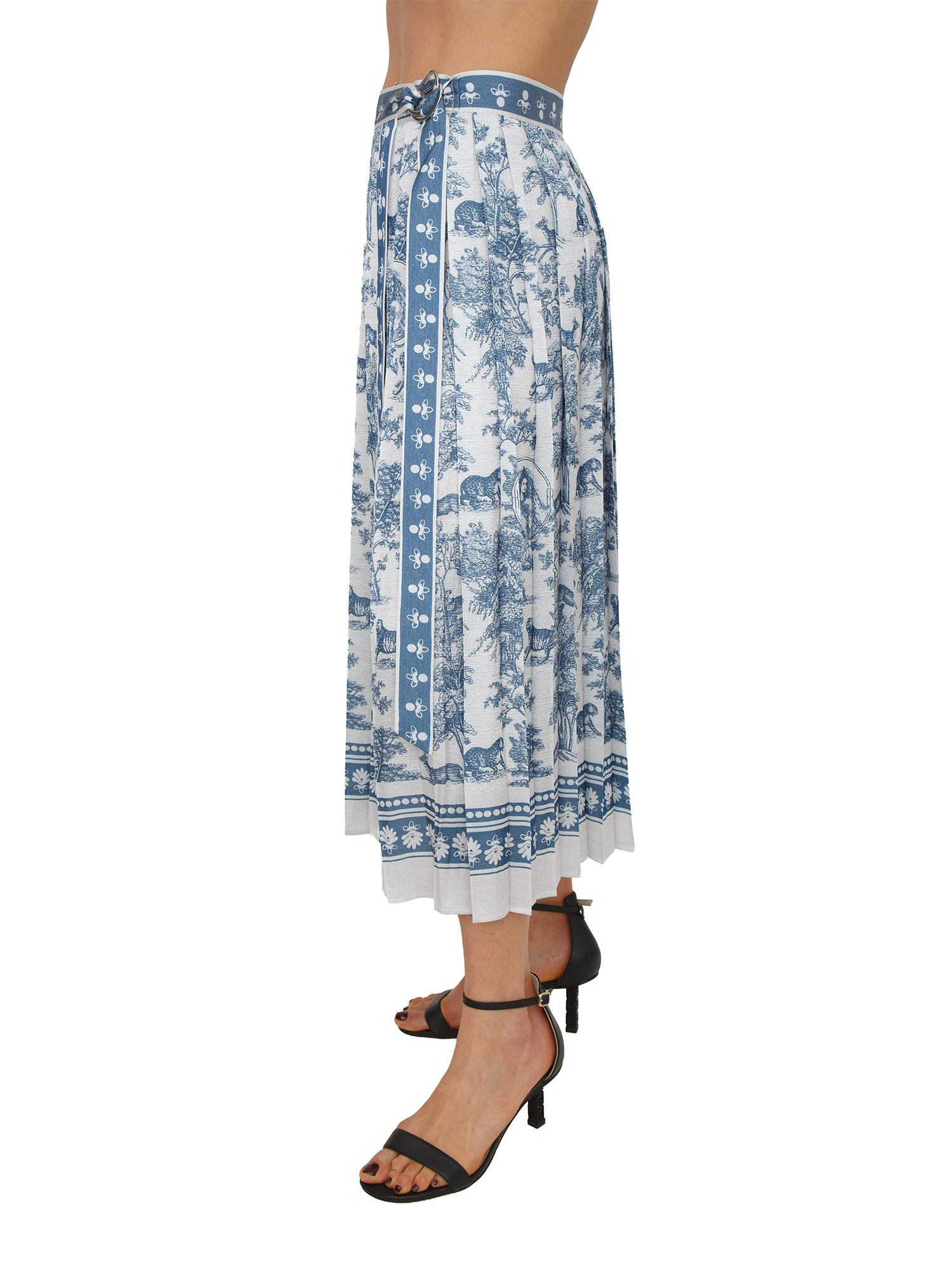 Gonna midi Fracomina modello flare a portafoglio realizzato in tessuto super leggero con fantasia esotica blu. Modello a vita regolare con allacciatura sul fianco e tessuto plissettato. La modella è alta 1.72 e indossa la taglia 40.