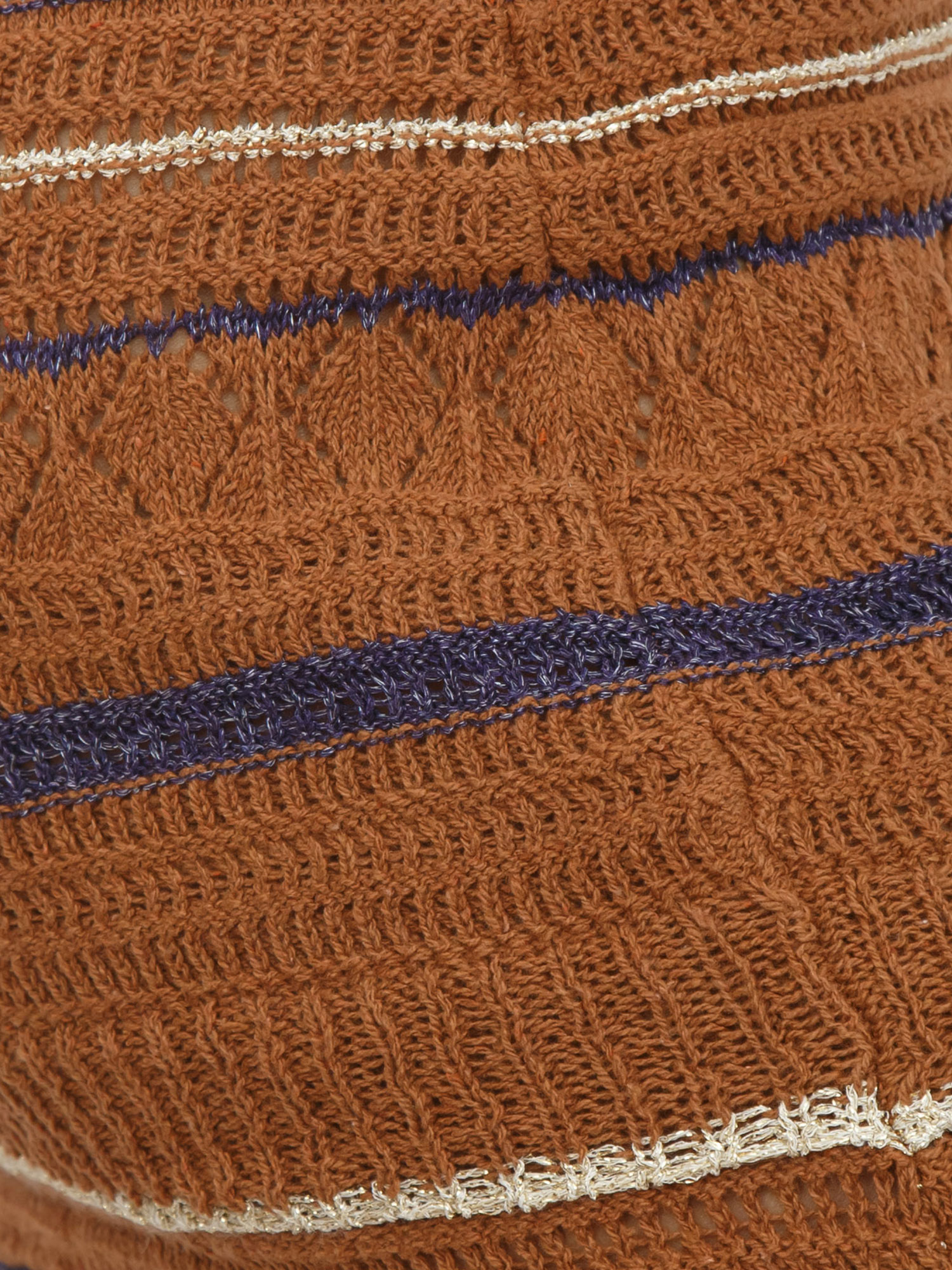 Raffinata gonna Wendy Nenette in maglia lavorata a crochet con motivi geometrici e righe orizzontali. Design dalla silhouette fluida con taglio a balze sovrapposte che dona movimento al capo. Uno stile boho-chic unico e versatile. La modella è alta 1.72 e indossa la taglia XS.