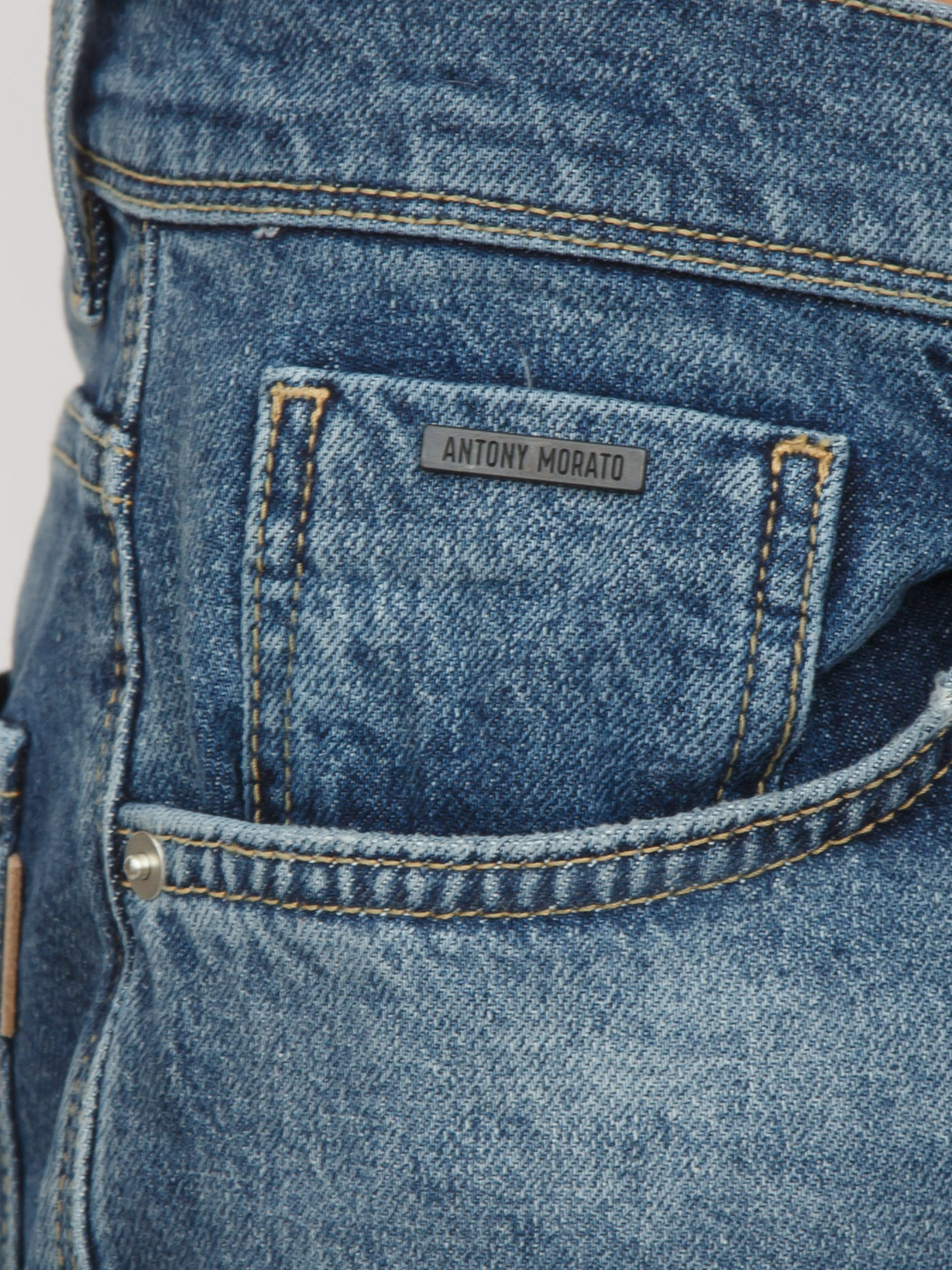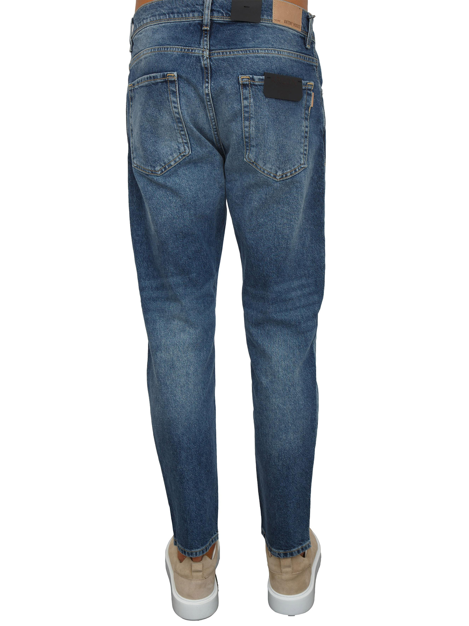 Jeans "Argon" Antony Morato modello cinque tasche slim fit. Realizzato in tessuto denim morbido e confortevole, con particolare lavaggio che presenta baffature e una sfumatura a sovratintura chiara. Cuciture color tabacco a contrasto, chiusura con zip e bottone. Patch logata applicata sul retro. Il modello è alto 1.90m e indossa la taglia 32.