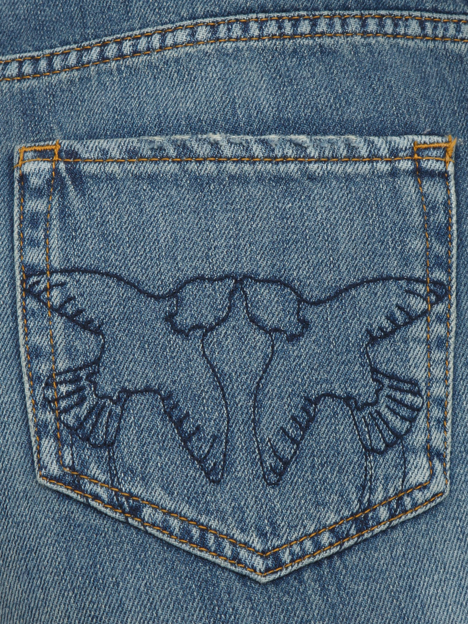 Jeans balloon Estelle di Pinko realizzati in denim di cotone dalla mano morbida con lavaggio stone wash e piccole abrasioni sui bordi delle tasche con logo ricamato su tasca dietro. Vita regular con passanti per cintura, chiusura con zip e bottone a chiodo in metallo. La modella è alta 1.77 e indossa la taglia 40.