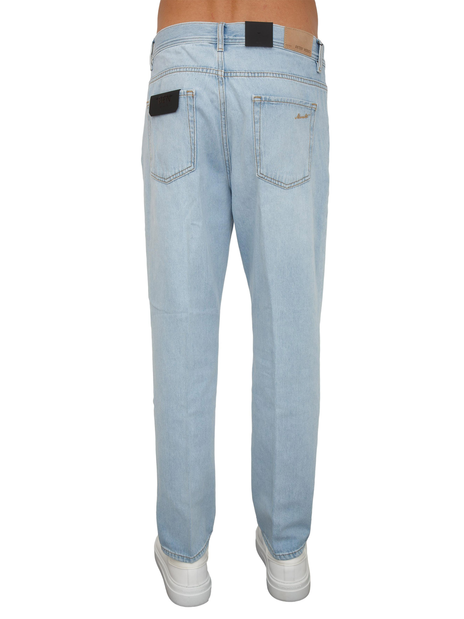Jeans "Ben" Antony Morato relaxed fit in denim di cotone chiaro. Jeans casual con le linee di un pantalone classico con piega stirata. Lavaggio con baffature leggere e discreto effetto used con piccola placca logo su tasca frontale, salpa cucita sul retro. Il modello è alto 1.90m e indossa la taglia 32.
