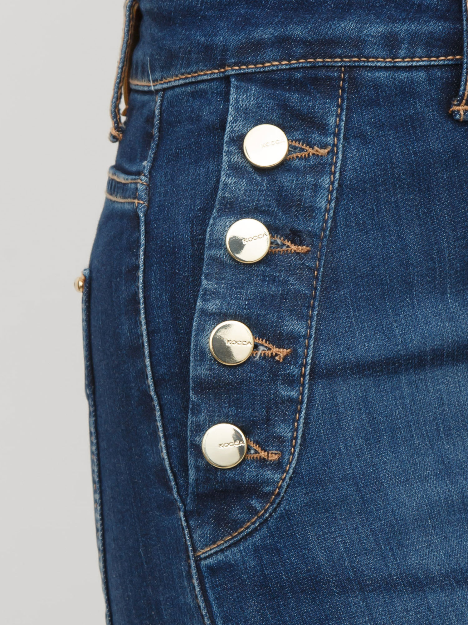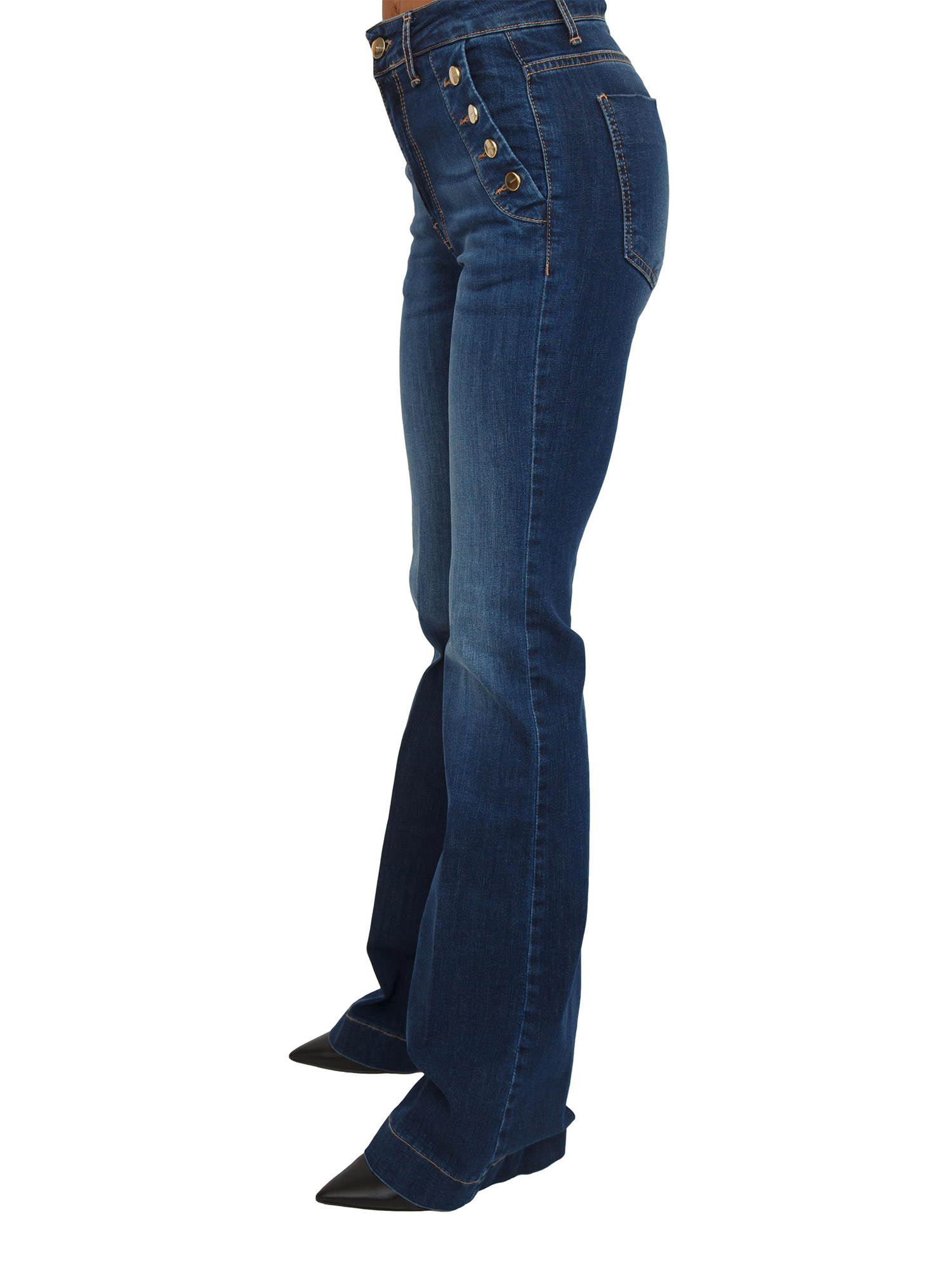 Jeans Rooney Kocca modello a zampa d'elefante, caratterizzato da bottoni dorati sulle tasche frontali. Il capo presenta vita alta, vestibilità aderente e chiusura con zip e bottone. Stupendi. La modella è alta 1.72 e indossa la taglia 38.