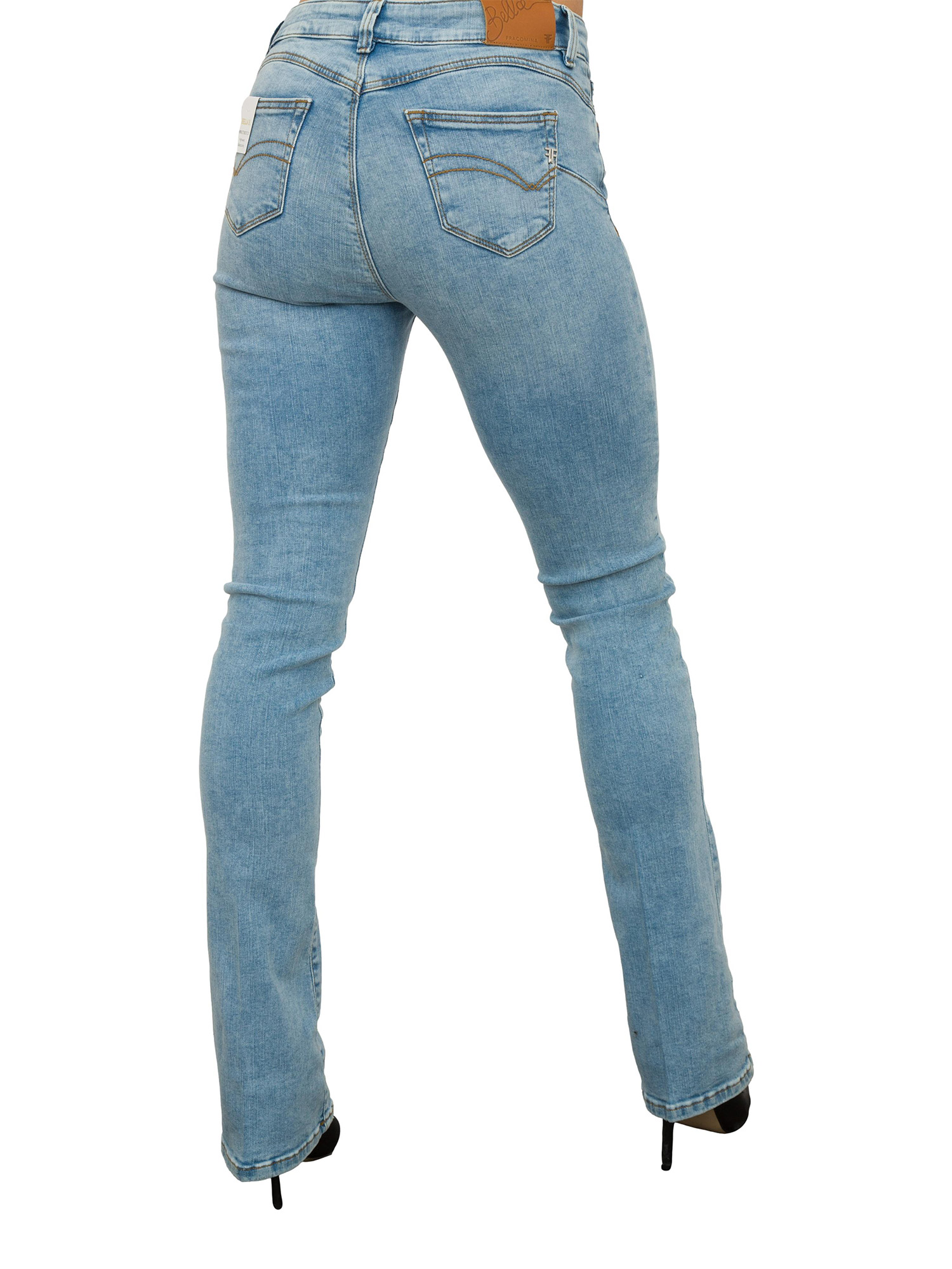 Jeans bootcut in denim con lavaggio medio bleached, vita regolare, 5 tasche, e con fondo largo.La modella è alta 1.72m e indossa la taglia 26.