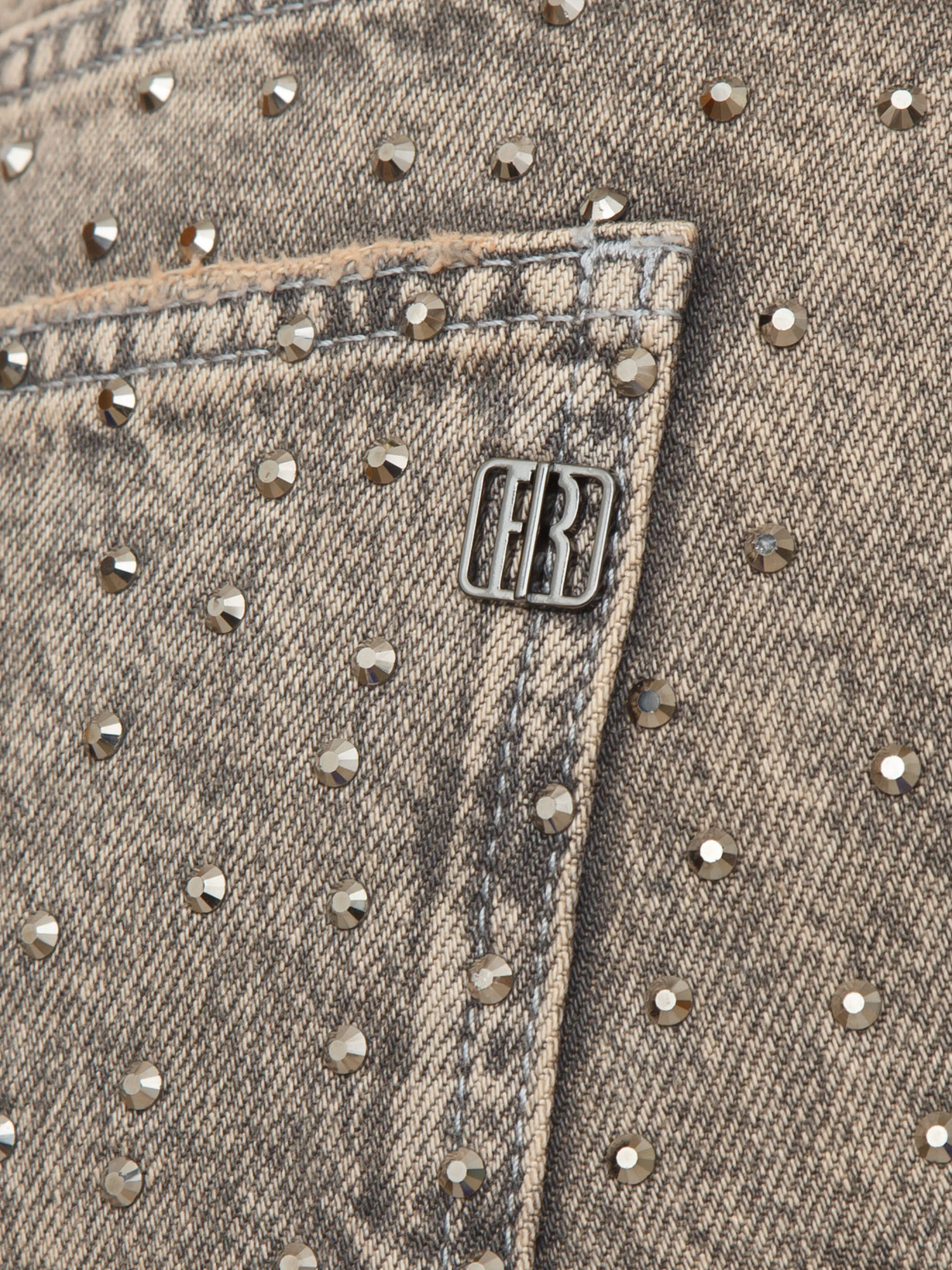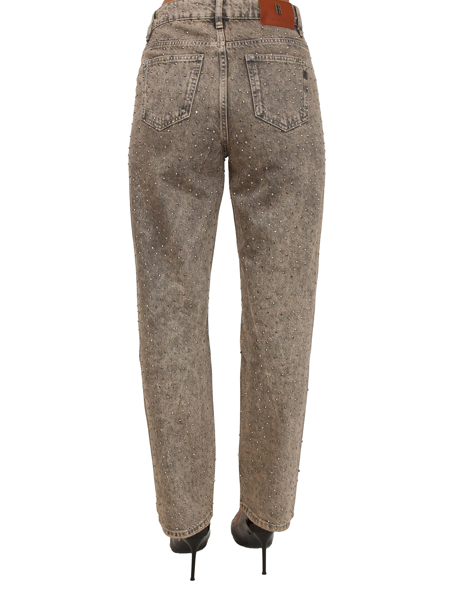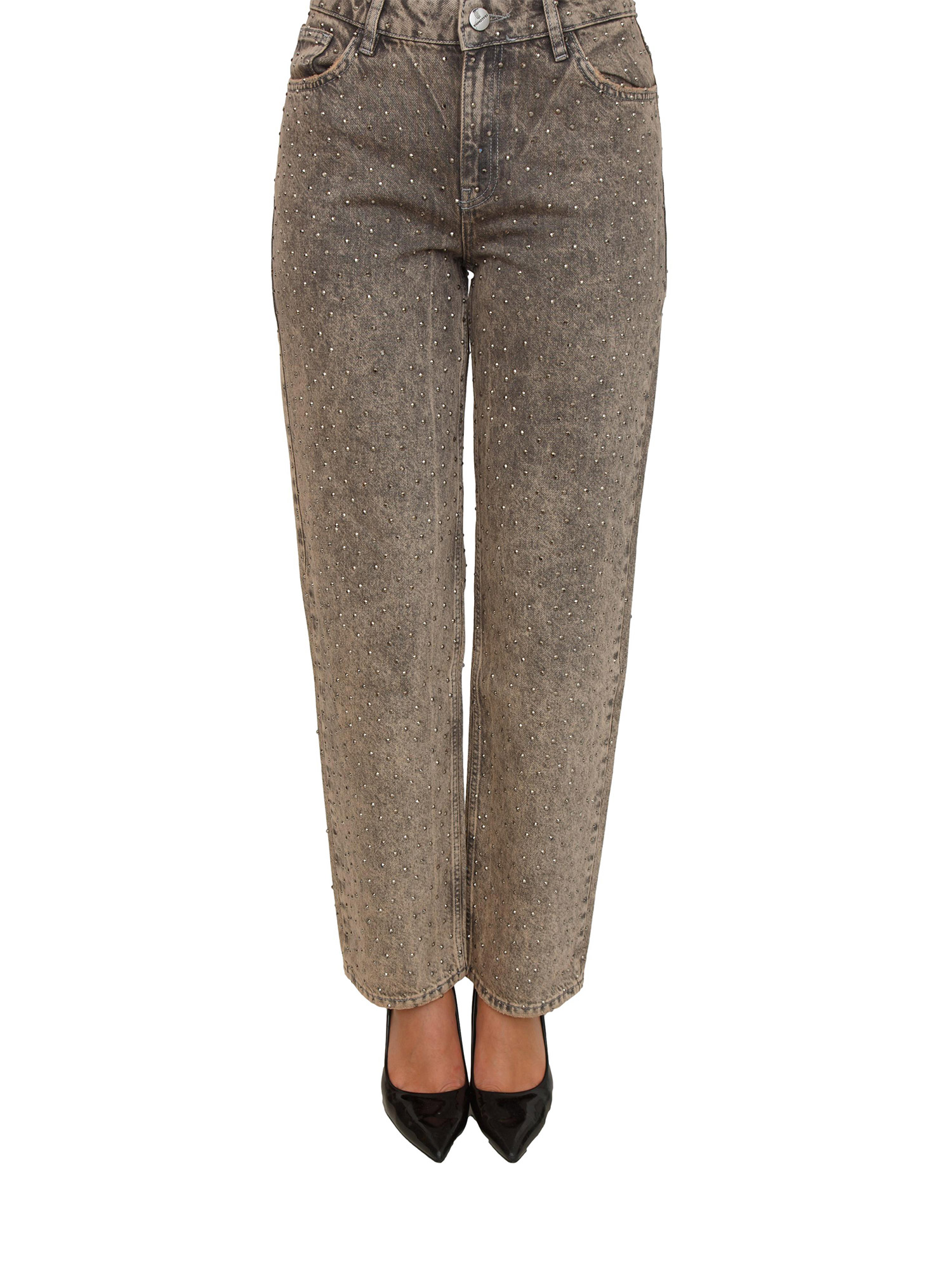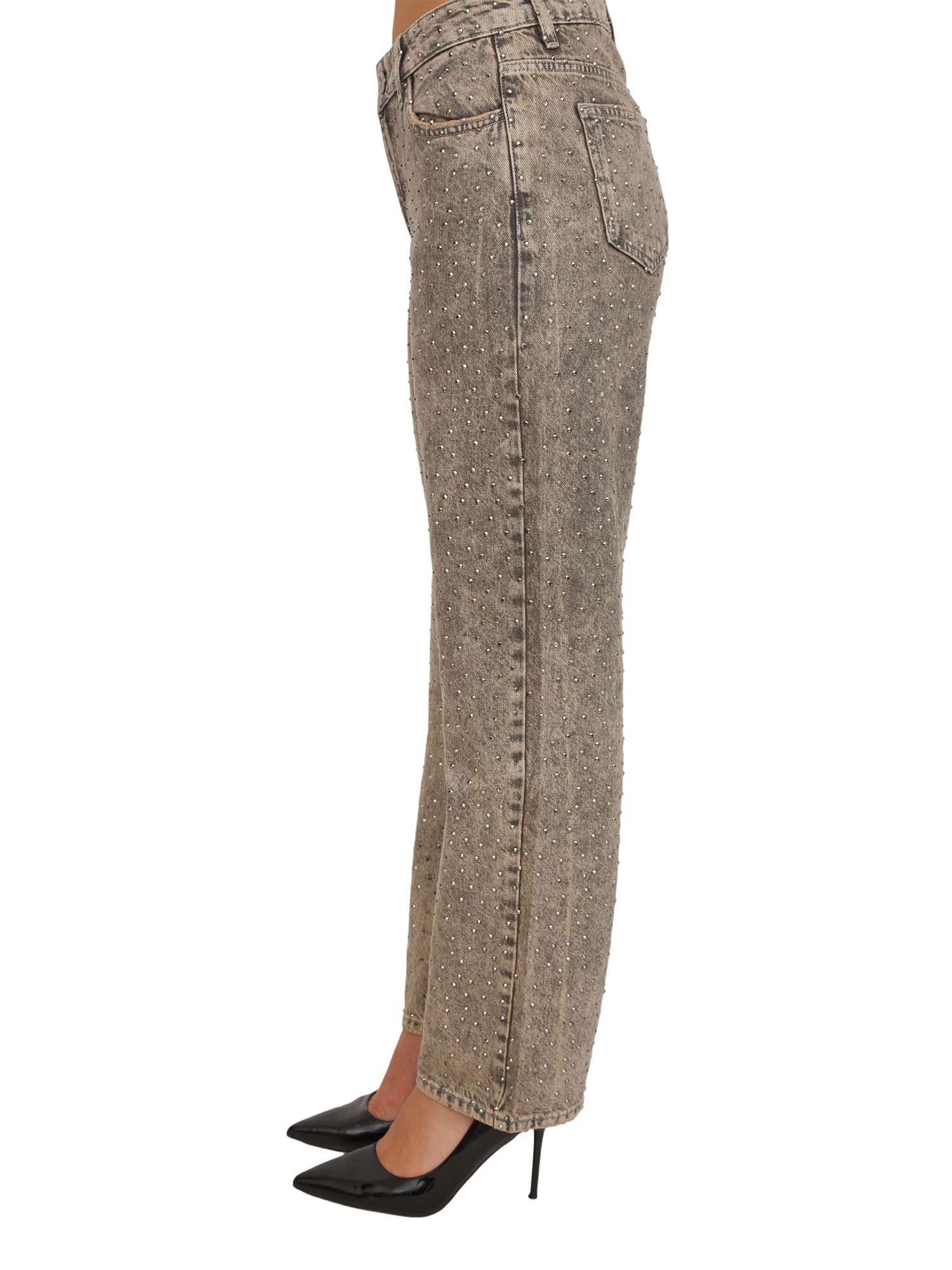 Jeans Fracomina modello flare in denim con lavaggio sporcatura, strass applicati, vita regolare, 5 tasche, e con fondo largo. Stupendi da indossare su qualsiasi look, da quello sporty-chic giornaliero a quello elegante serale. La modella è alta 1.77 e indossa la taglia 26.