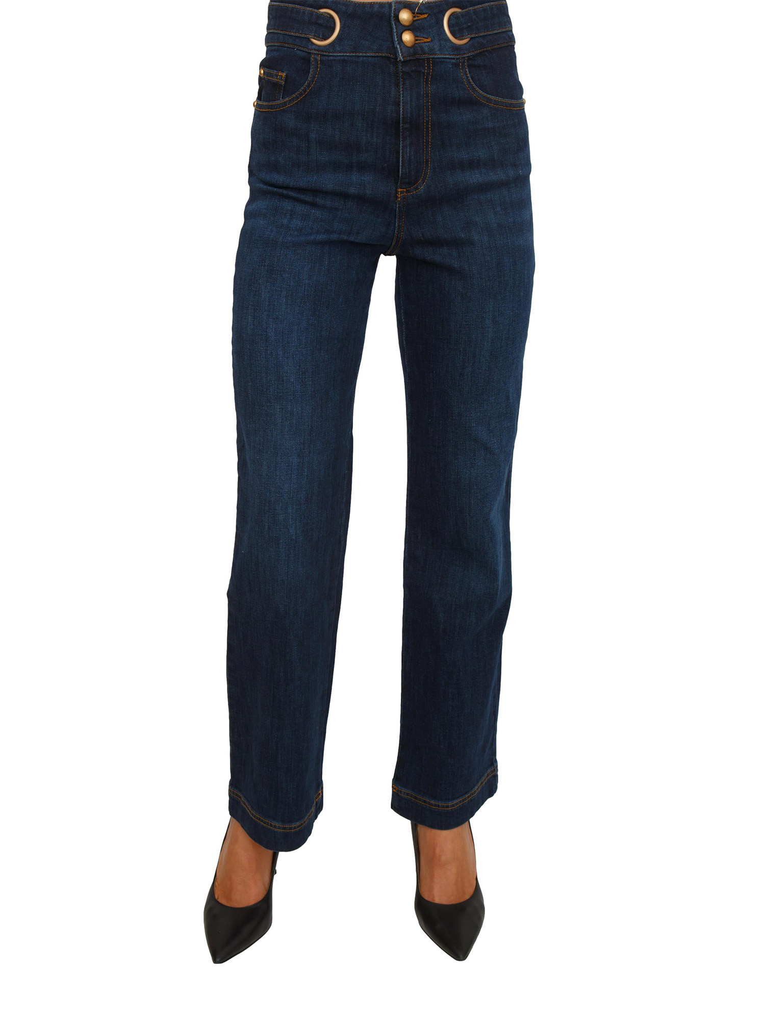 Jeans donna Santeria Nenette a gamba dritta in denim comfort con cintura metallica oro. Linea essenziale e tessuto elasticizzato per una vestibilità comoda e versatile. La cintura aggiunge un tocco sofisticato al look moderno e curato nei dettagli. La modella è alta 1.72 e indossa la taglia 25.