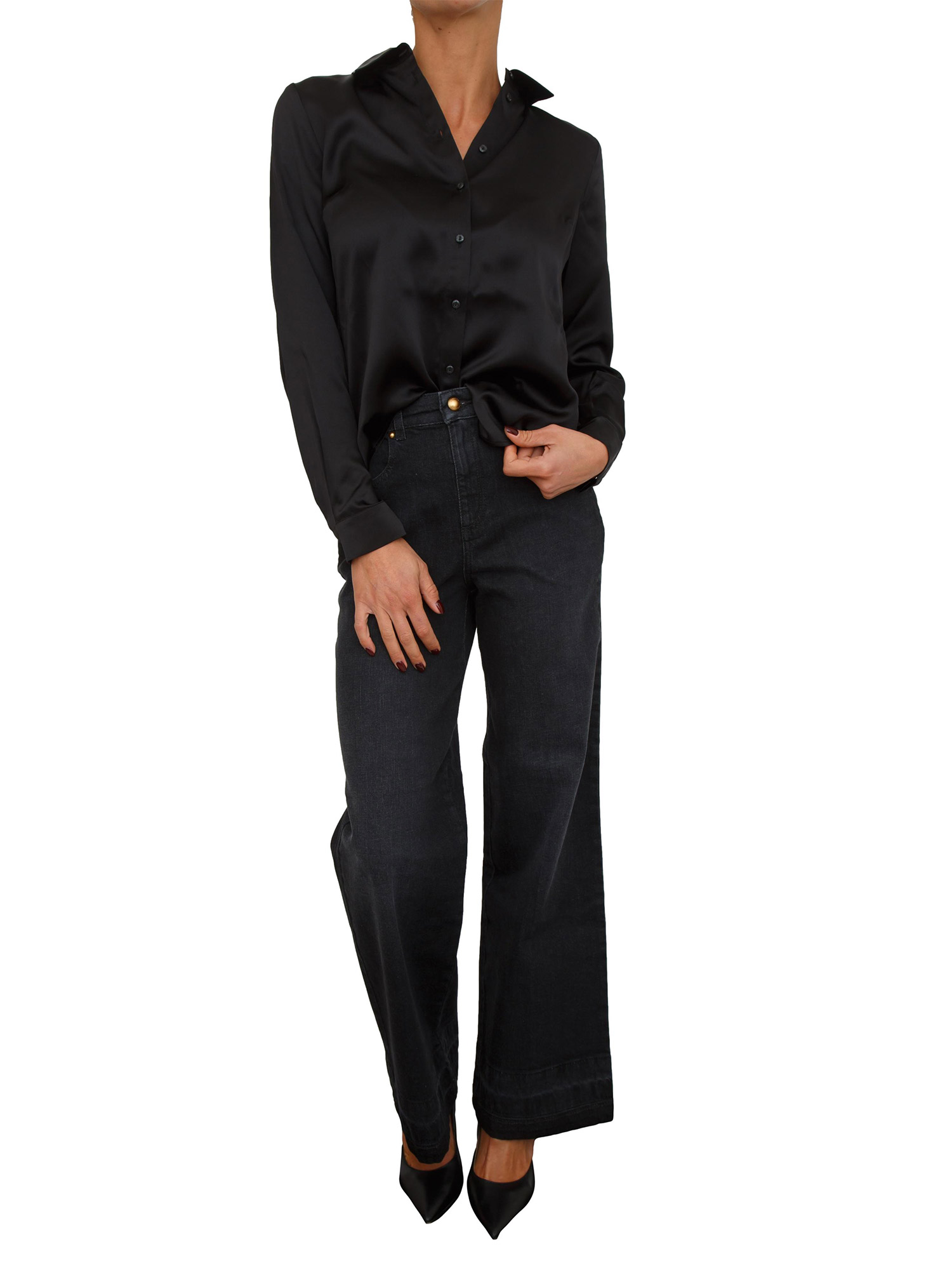 Jeans donna StarkBR Nenette realizzato in denim black elasticizzato che garantisce comfort e vestibilità perfetta. Design dal llook chic e contemporaneo da abbinare su qualsiasi outfit casual. La modella è alta 1.72 e indossa la taglia 25.