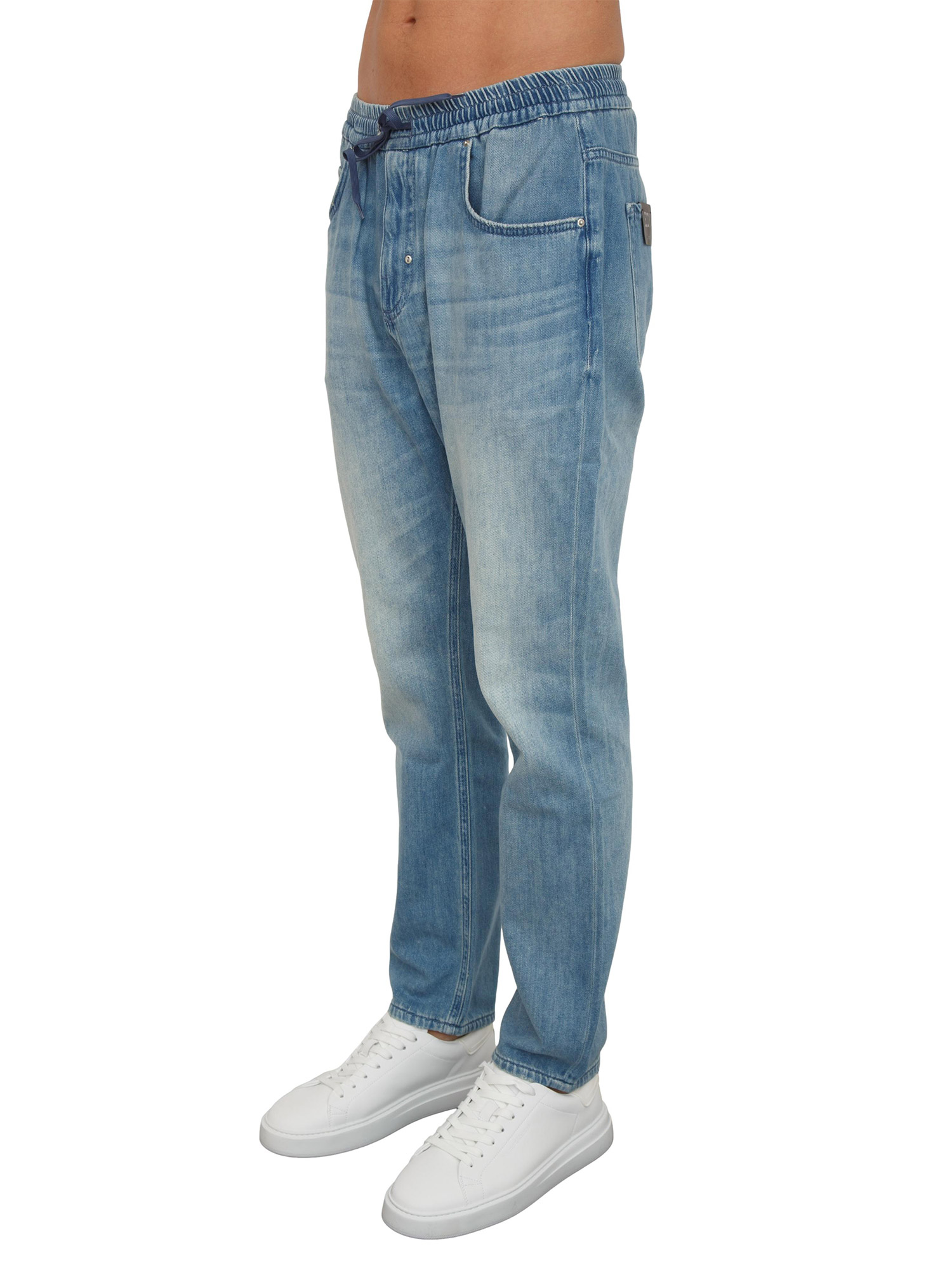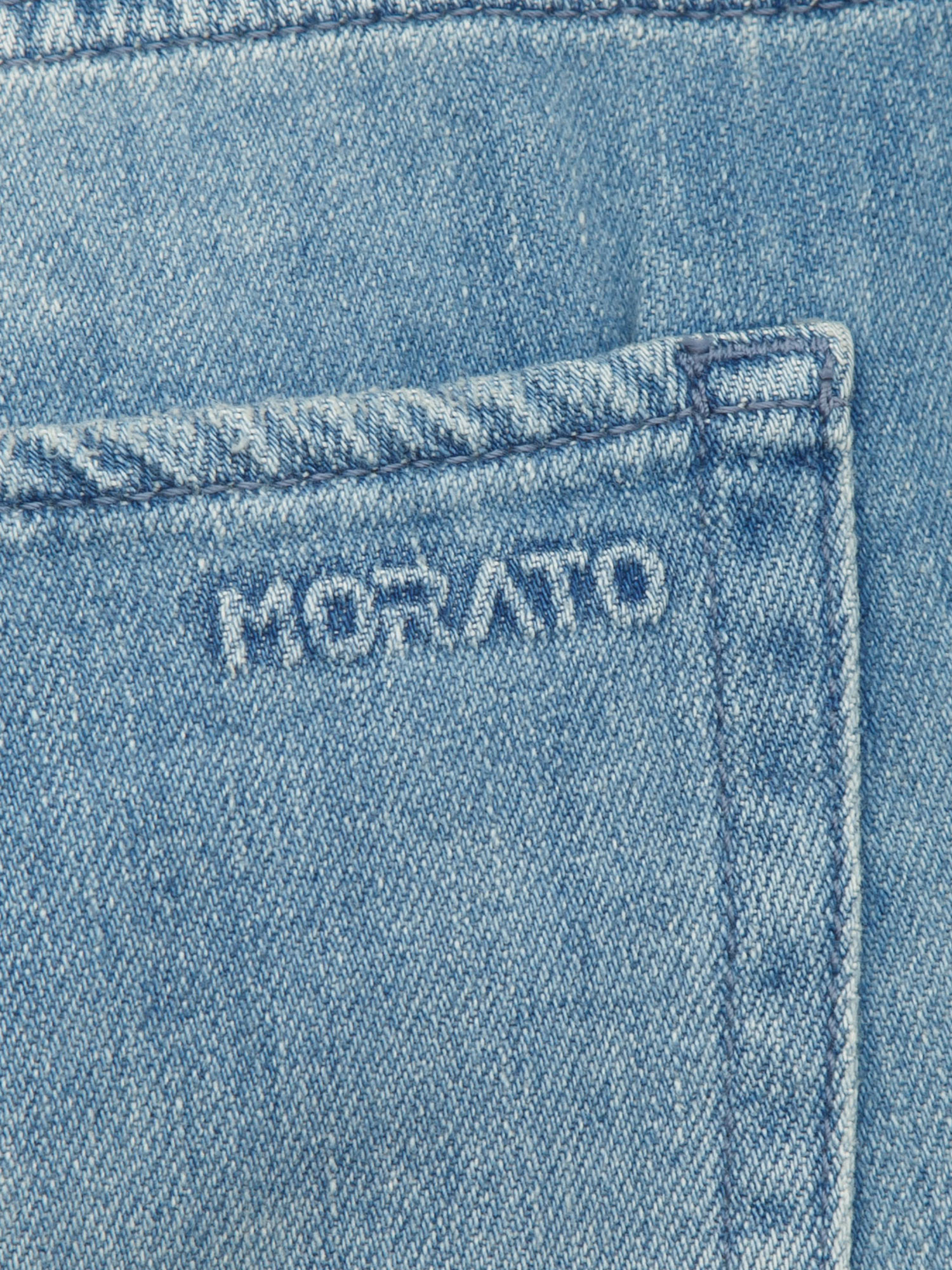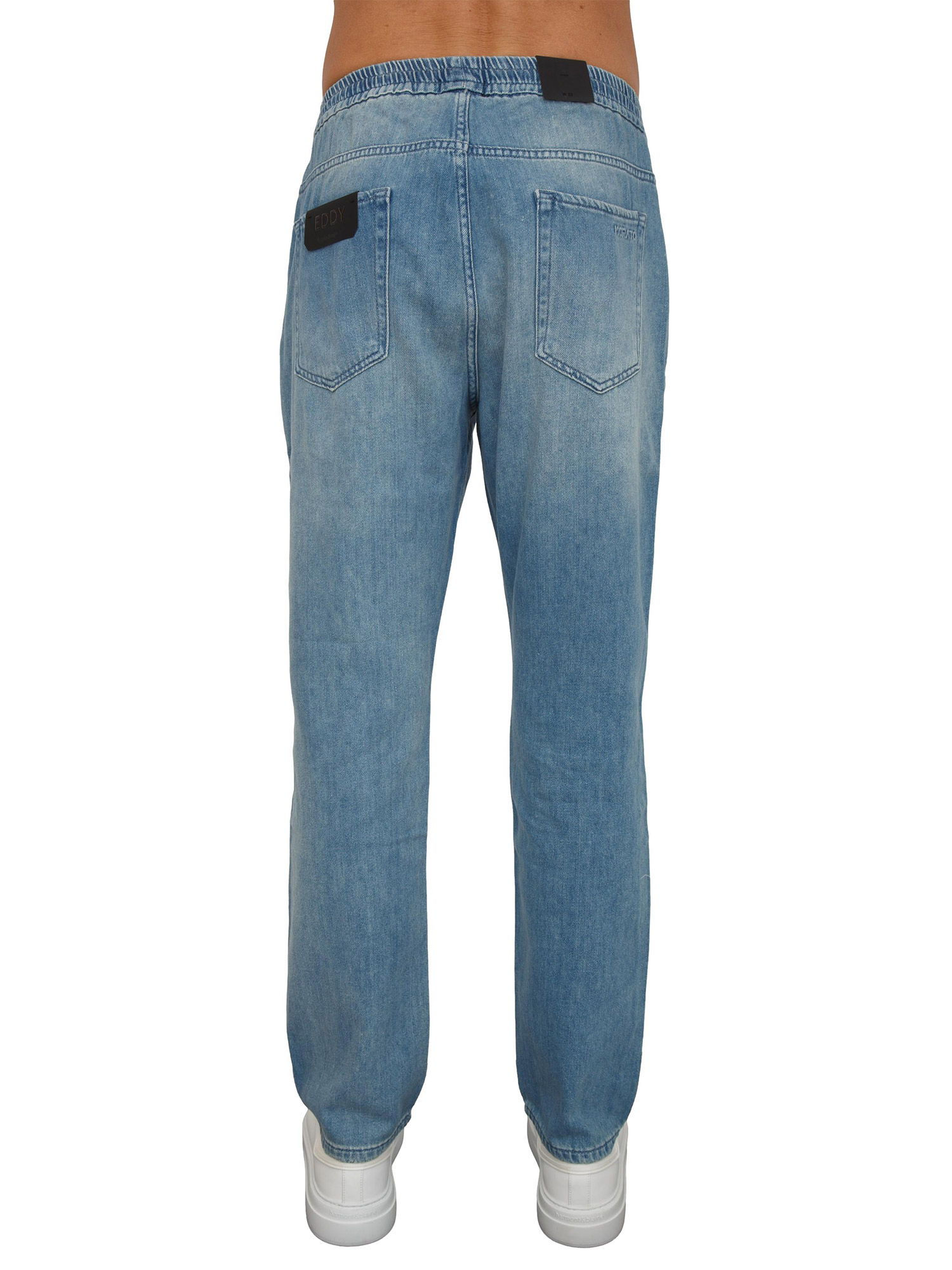 Jeans "Eddy" Antony Morato in comodo denim di cotone con vestibilità regular ed elastico in vita. Perfetto per chi cerca comfort e stile grazie al lavaggio chiaro effetto used con baffature. Placchetta logata sulla piccola tasca anteriore e logo impresso dietro. Il modello è alto 1.90m e indossa la taglia 32.