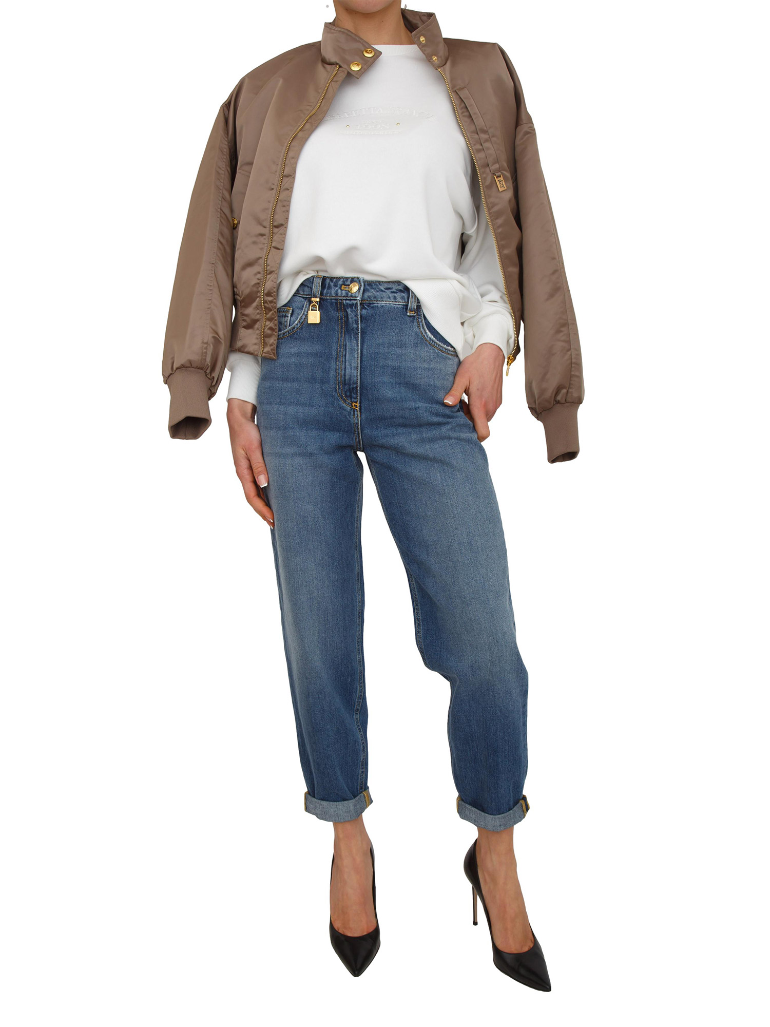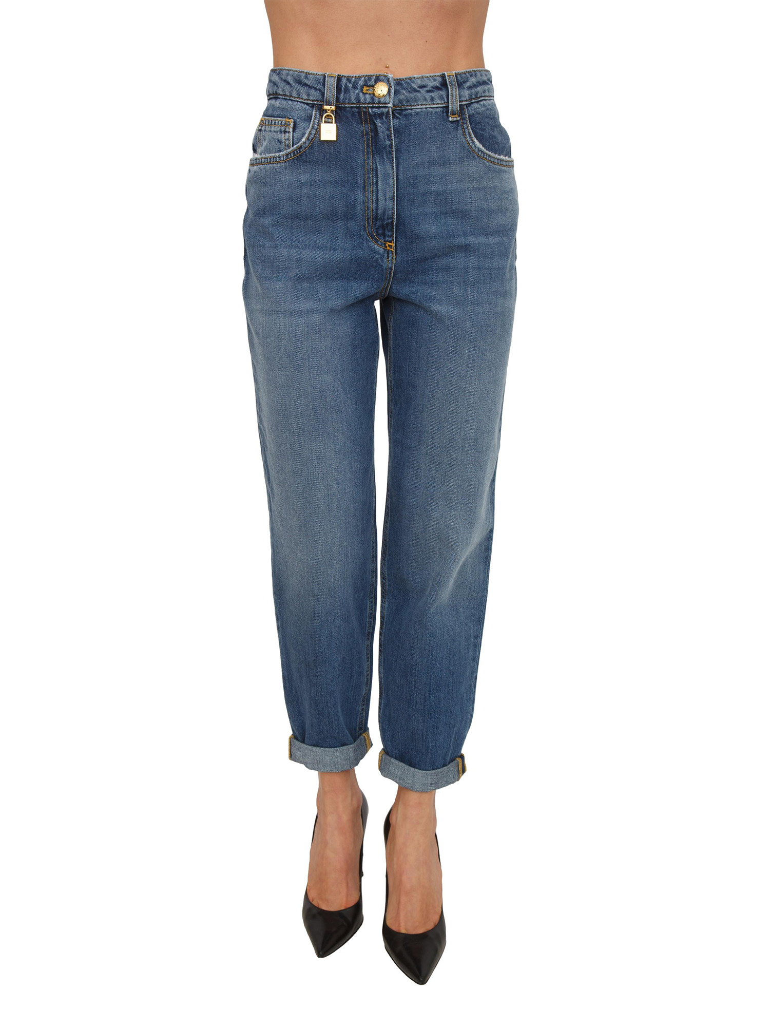 Jeans cinque tasche Elisabetta Franchi con vita regolare e gamba a ovetto. Dai volumi inediti, sono impreziositi dallo charm con forma di lucchetto su un passante. Tasche posteriori di cui una personalizzata dal nastro diagonale con logo. Vestibilità regular. La modella è alta 1.72 e indossa la taglia 25.