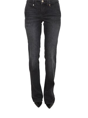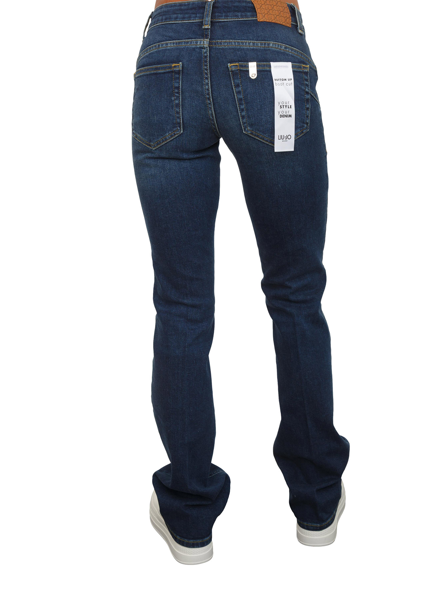 Jeans Liu Jo donna realizzati in denim di cotone stretch con tagli bottom up e lavaggio used. Modello a vita bassa, gamba slim che si allarga e salpa logata. La modella è alta 1.72 e indossa la taglia 26.