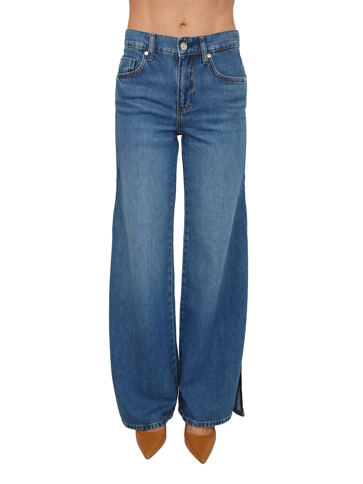 Jeans Liu Jo donna realizzati in denim di cotone con lavaggio used e vita regolare. Comode tasche con gamba flare, spacchetti laterali e chiusura con zip e bottone. La modella è alta 1.72 e indossa la taglia 25.