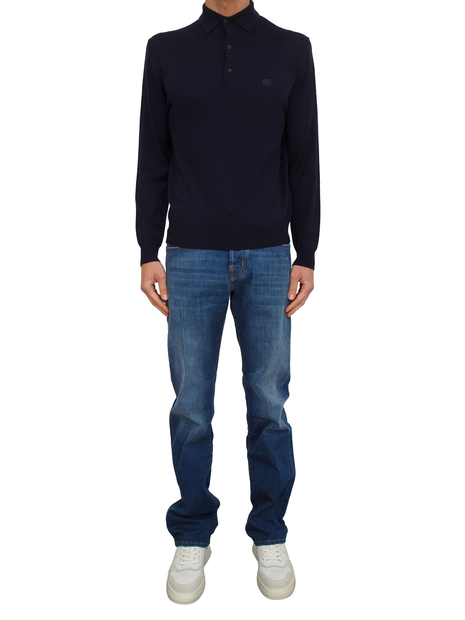 Jeans uomo Eduard Jacob Cohen modello a cinque tasche e vestibilità regular. Realizzati in pregiato denim blu scuro effetto used che dona comfort e stile ineguagliabili. Chiusura con bottone logato in metallo, zip coperta e bandana inclusa. Il modello è alto 1.90m e indossa la taglia 32.