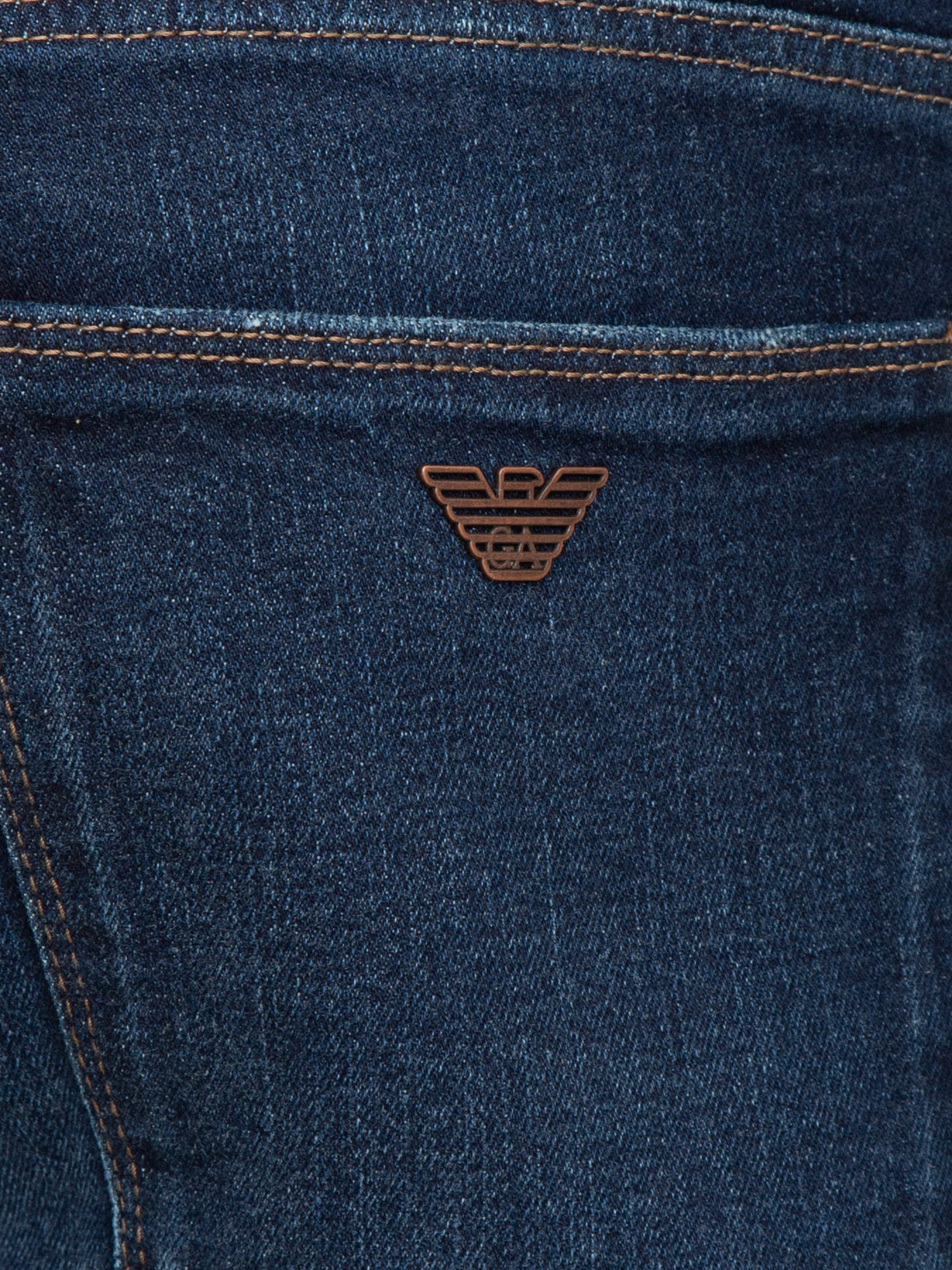 Jeans uomo Emporio Armani realizzato in cotone elasticizzato blu scuro effetto delavé. Design con vita bassa e vestibilità slim fit. Tasche con cucitura a contrasto e logo metallo dietro. Il modello è alto 1.90m e indossa la taglia 32.