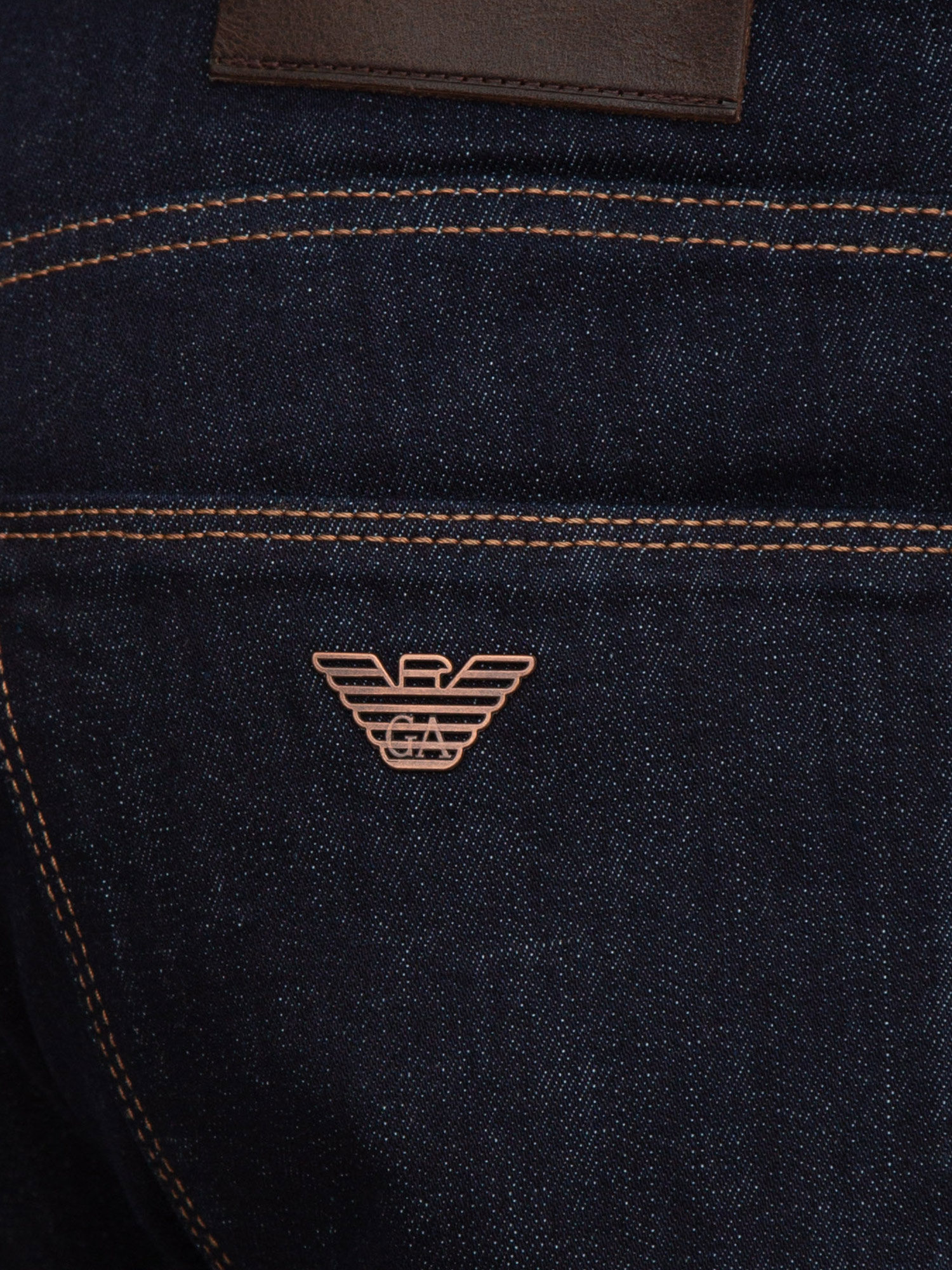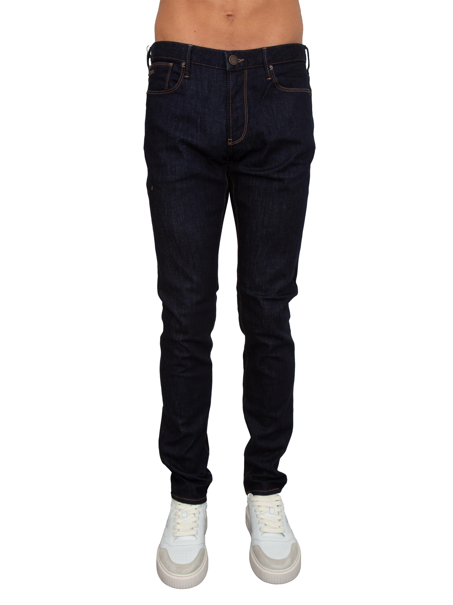 Jeans uomo Emporio Armani realizzati in comodo cotone elasticizzato blu scuro. Design con vita bassa e vestibilità slim fit, dotato di tasche con cuciture a contrasto e logo in metallo sul retro. Il modello è alto 1.90m e indossa la taglia 32.