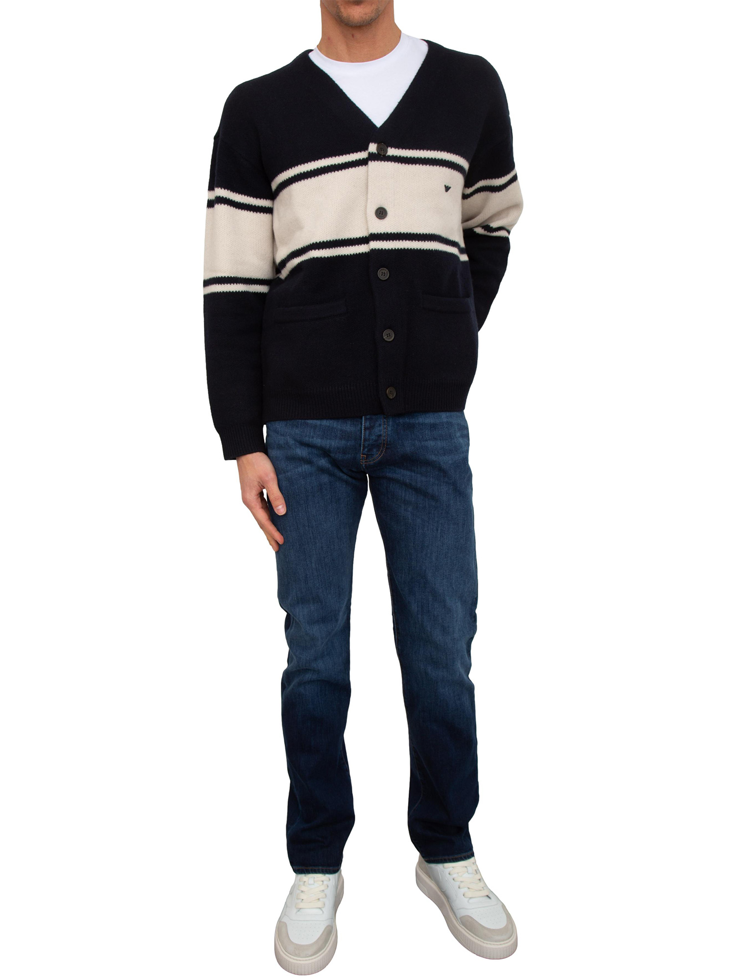 Questo modello di jeans uomo Emporio Armani realizzato in denim di cotone stretch è un classico evergreen del guardaroba. Gamba e vita regolare con chiusura a bottoni. Un must-have del guardaroba maschile. Il modello è alto 1.90m e indossa la taglia 32.