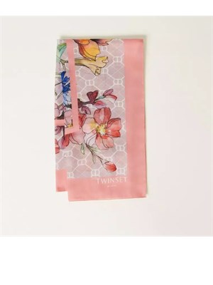 Kefiah fantasia Twinset con stampa logo Oval T e fiori multicolor, profili a tinta unita con logo lettering. Bellissima come coprispalle o come foulard. Dimensioni: 120x120 cm