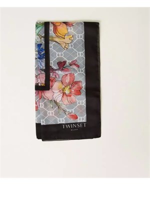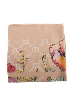 Kefiah fantasia Twinset con stampa logo Oval T e fiori multicolor, profili a tinta unita con logo lettering. Bellissima come coprispalle o come foulard. Dimensioni: 120x120 cm