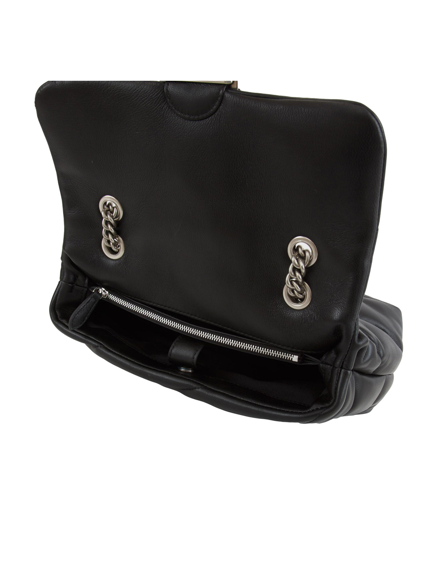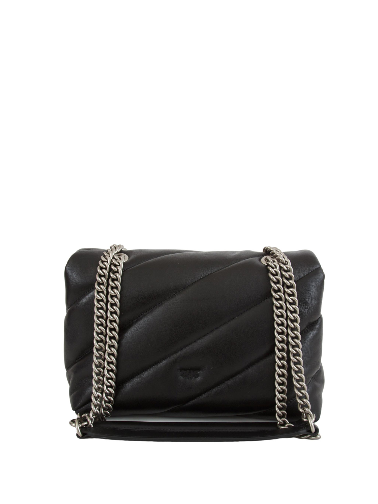 2. Classic Love Bag Puff Pinko in morbida nappa con maxi trapuntatura obliqua. Chiusura con iconica fibbia Love Birds Diamond Cut. Interno foderato e tramezza chiusa con zip e tasca a parete. La tracolla combina la classica catena metallica rotonda al pratico spallaccio in nappa. Dimensioni: 26x17x11 cm.