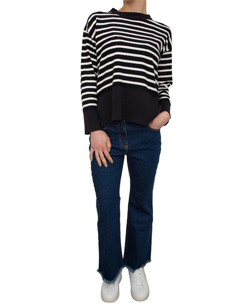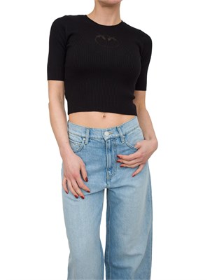 Maglia aderente a mezze maniche in filato di misto seta e cotone lavorato a costine. Personalizzazione con intarsio logo Love Birds davanti, lasciato in trasparenza.