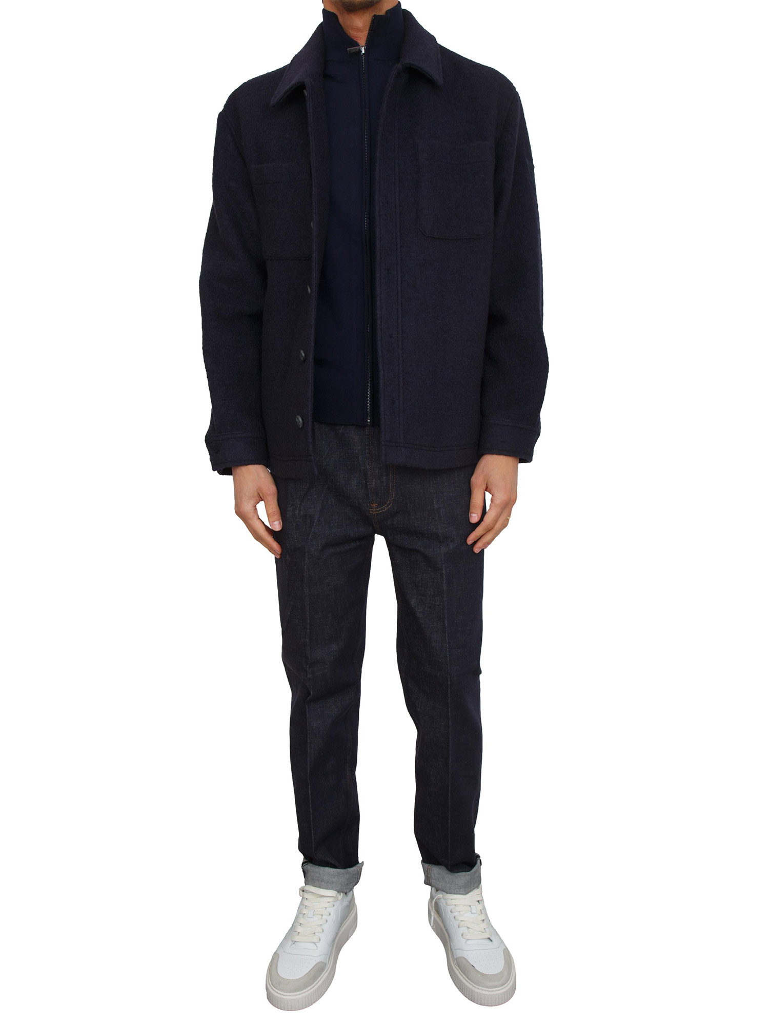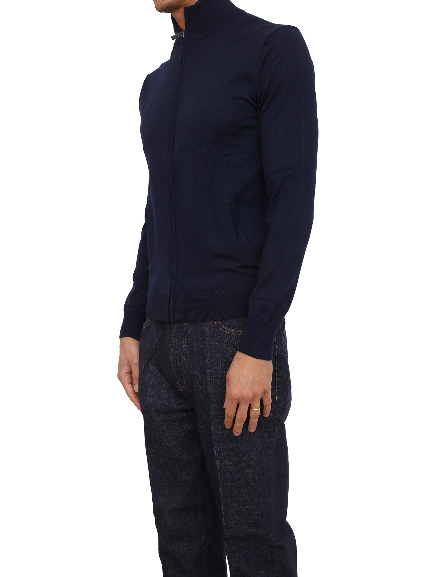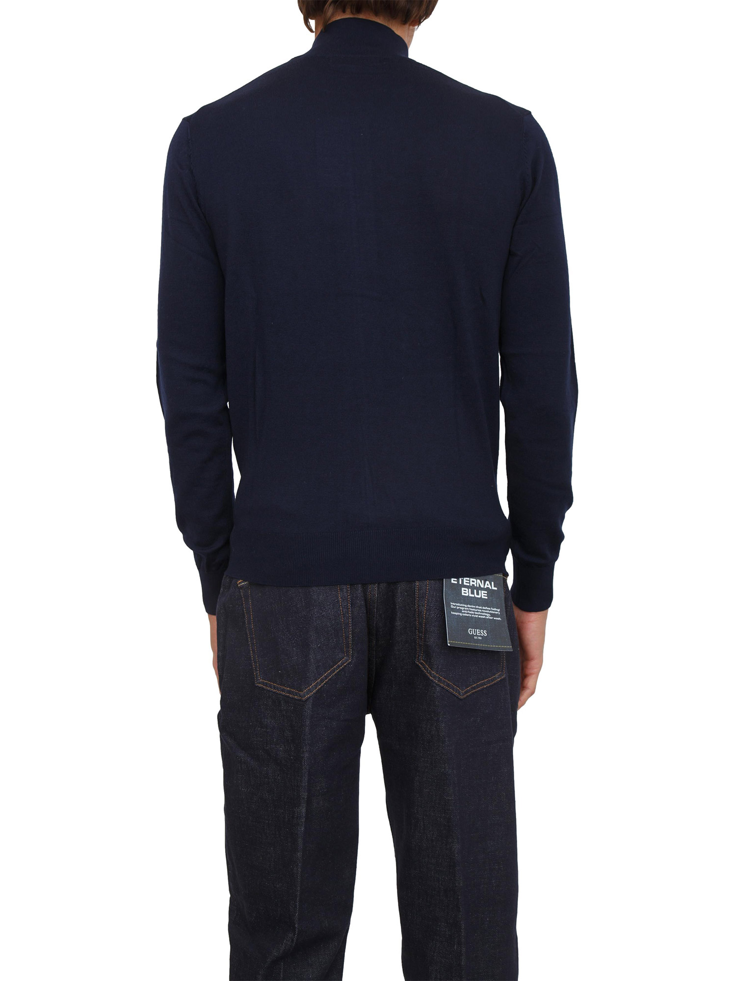 Maglia cardigan Guess Jeans uomo ralizzato in misto lana con zip su tutta lunghezza e collo alto. Fit aderente e super stiloso. Il modello è alto 1.90m e indossa la taglia M.
