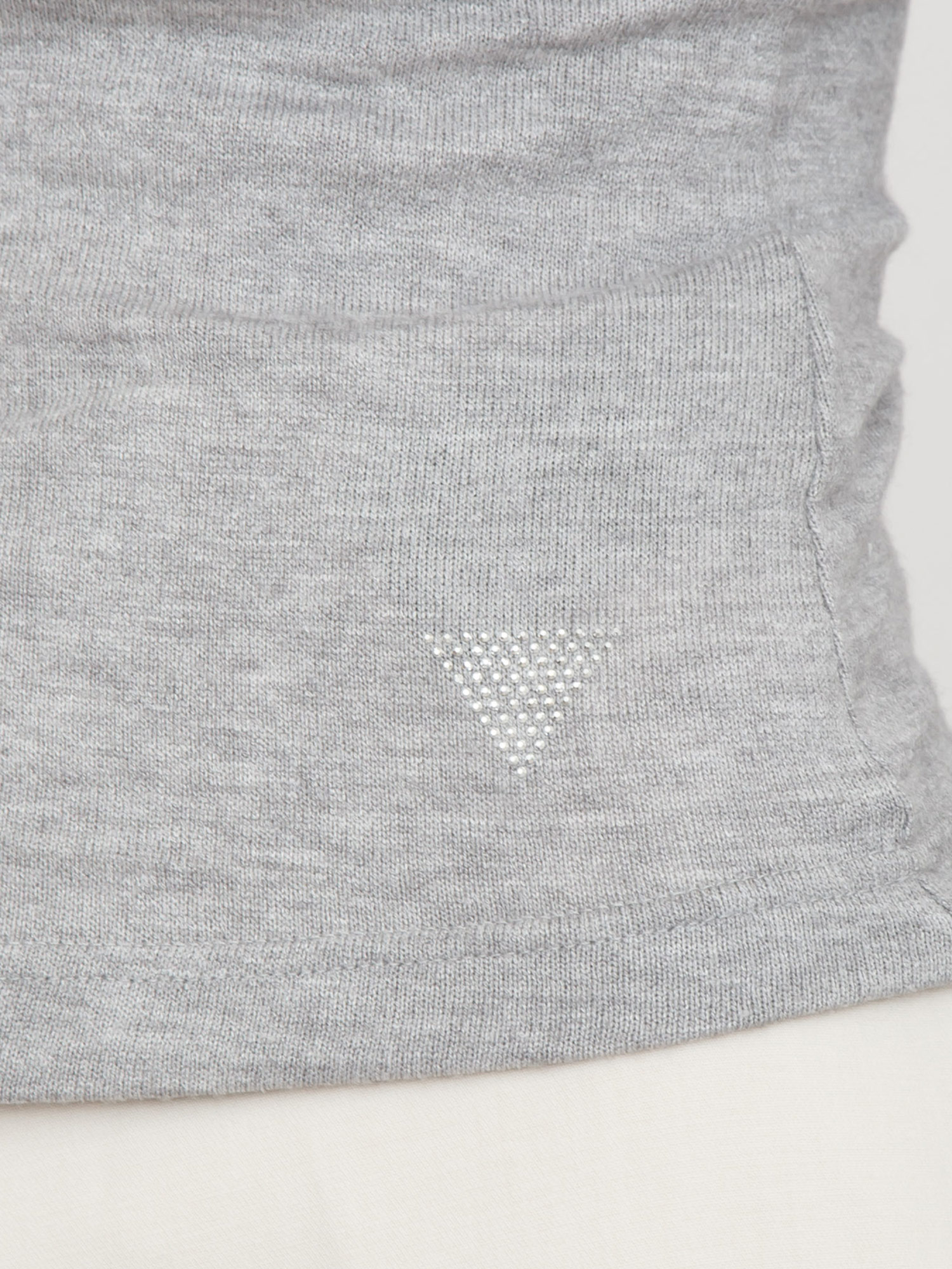 Maglia lupetto Guess Jeans donna realizzata in jersey di misto viscosa con vestibilità aderente e logo tiangolo con strass. La modella è alta 1.72 e indossa la taglia XS.