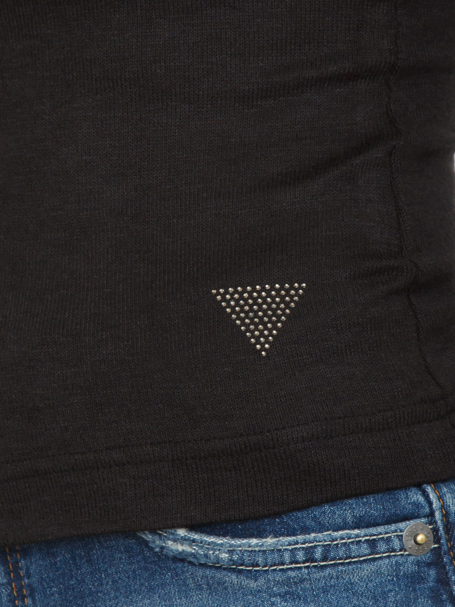 Maglia lupetto Guess Jeans donna realizzata in jersey di misto viscosa con vestibilità aderente e logo tiangolo con strass. La modella è alta 1.72 e indossa la taglia XS.