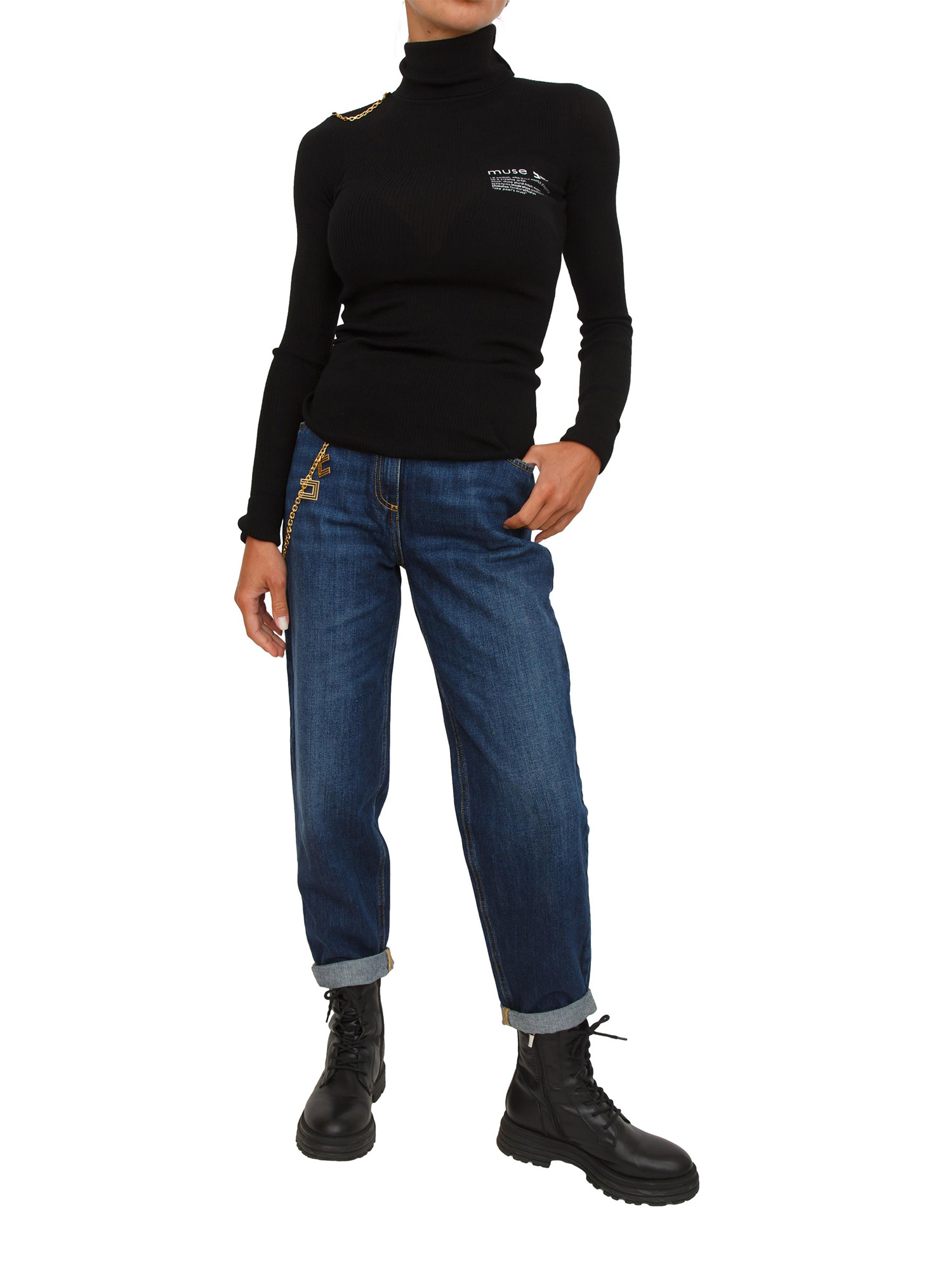 Maglia Elisabetta Franchi a collo alto con vestibilità aderente. Ideale come sottogiacca, collo dolcevita con apertura laterale e bottoni dorati e maniche lunghe con risvolto. Impreziosita dalla stampa lettering davanti e dal dettaglio in catena sulla spalla. La modella è alta 1.72 e indossa la taglia 40.